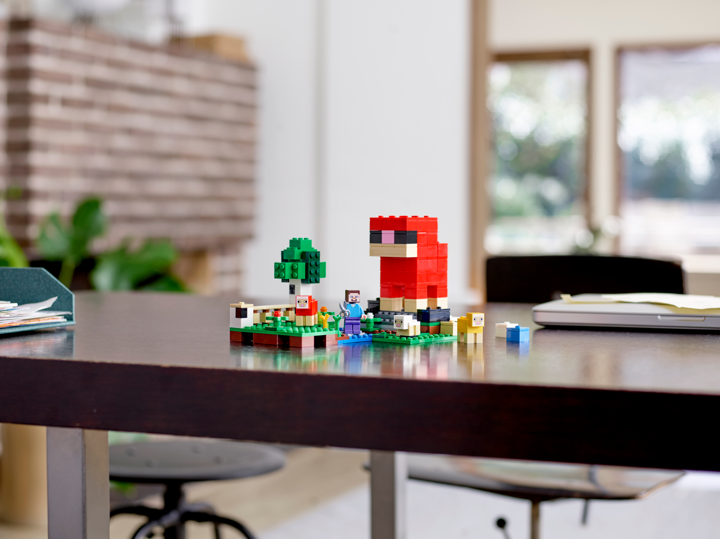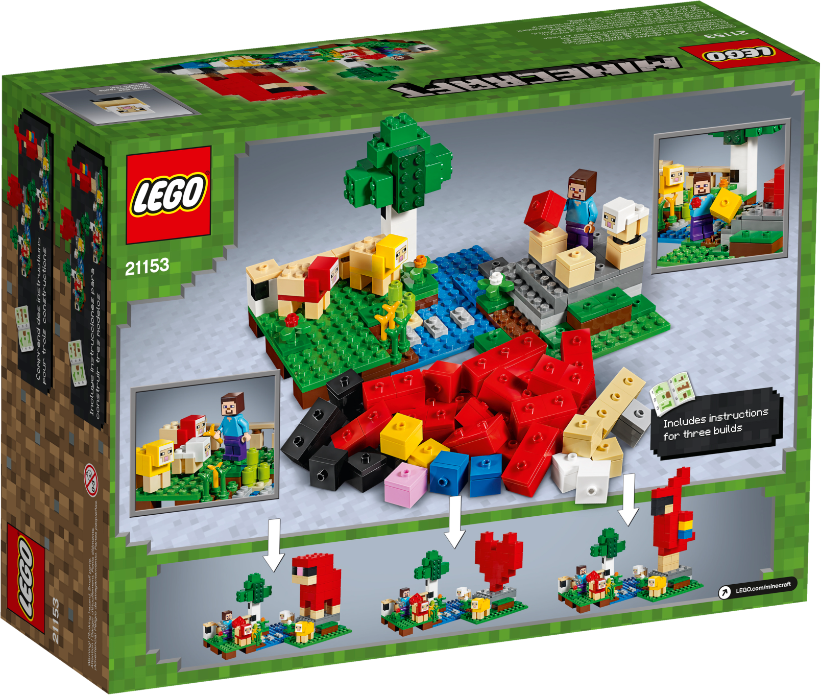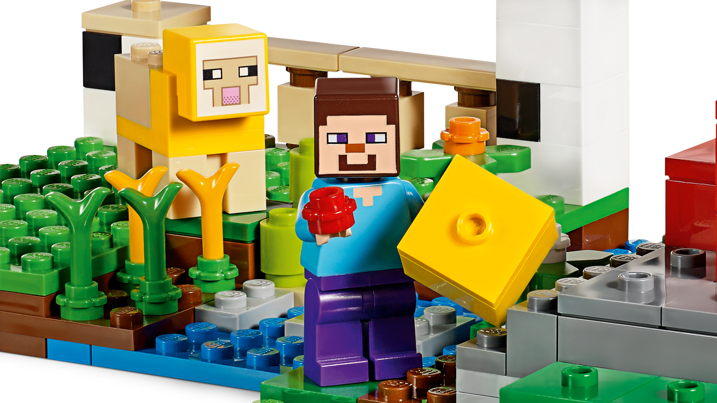 Features a Minecraft™ farm setting with a birch tree, fence, stream, stepping-stones, crops, flowers, 2 dyed Minecraft sheep and a baby sheep, plus colored LEGO® bricks for building 1 of 3 fun structures to decorate the farm.