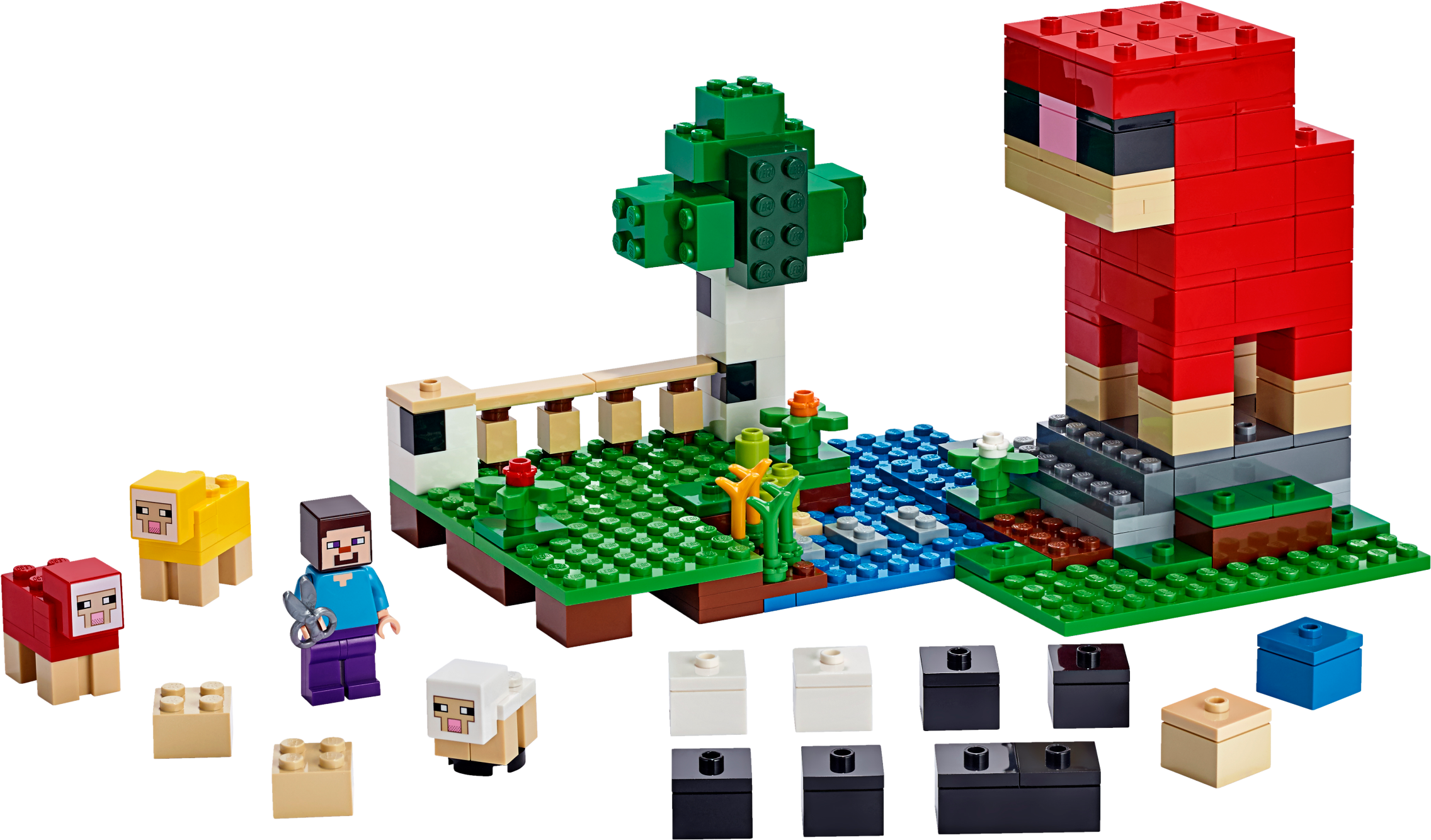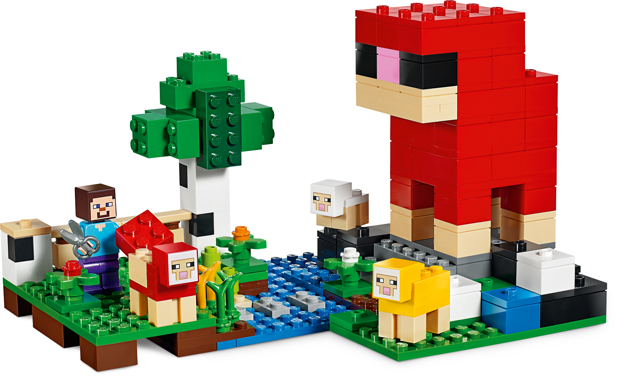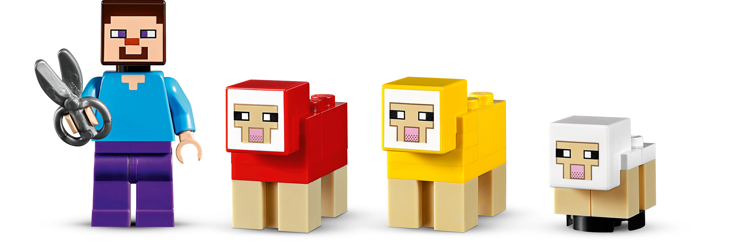 Includes a Steve minifigure, plus new-for-August-2019 red, yellow and baby sheep figures.