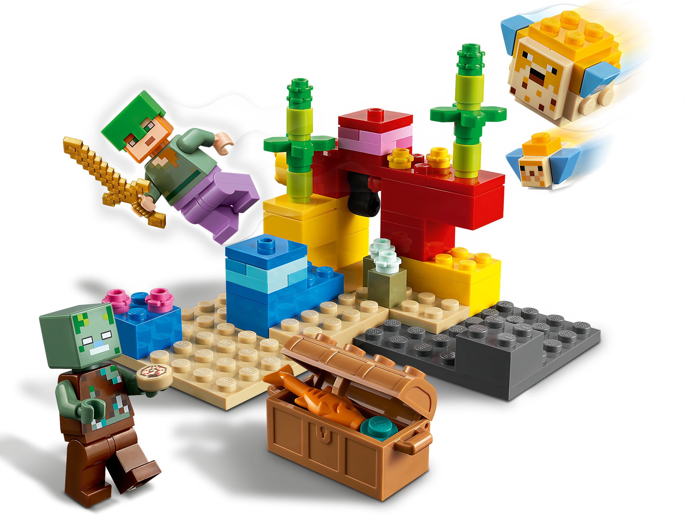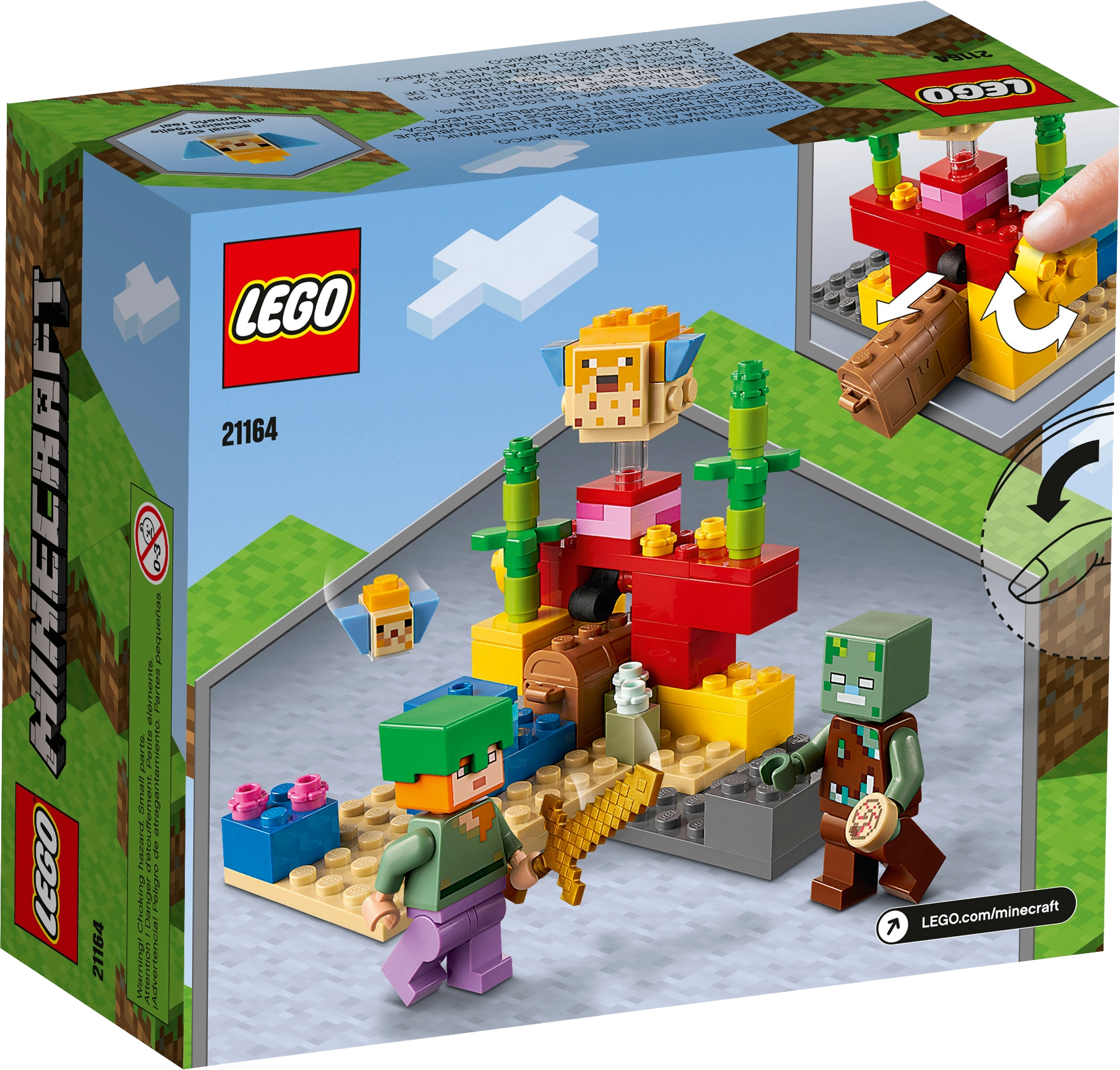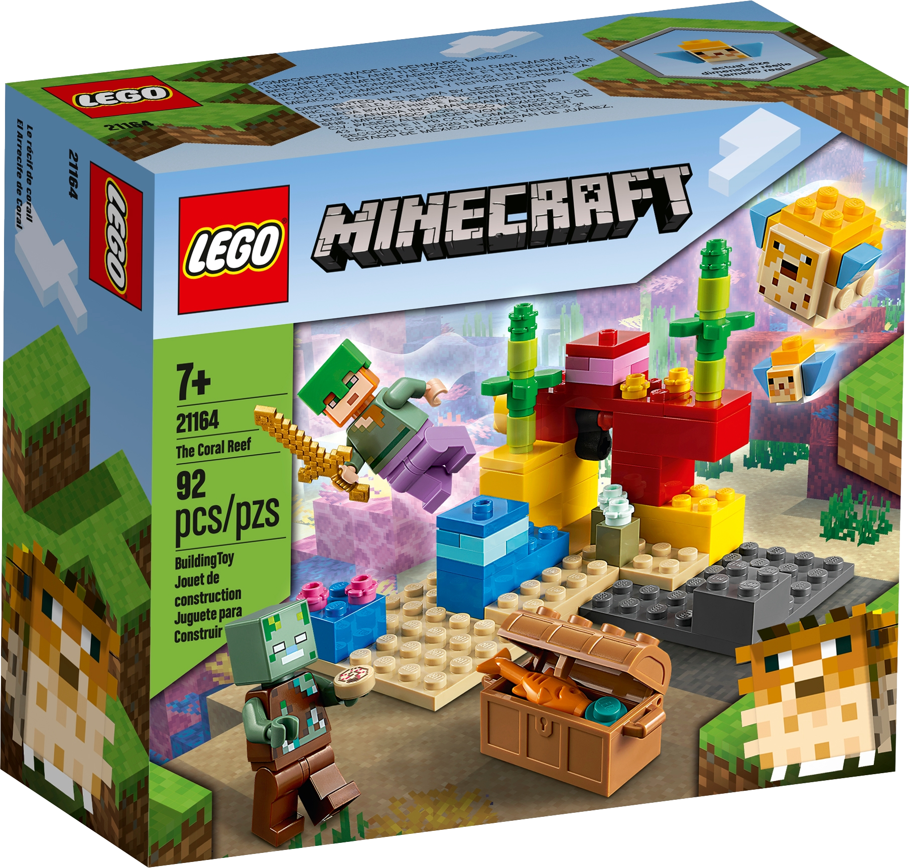 Bring Minecraft™, the hugely popular online kids’ game, to life in the real world with hands-on LEGO® Minecraft The Coral Reef (21164). With endlessly reconfigurable LEGO bricks, the creative-building fun never stops.Authentic Minecraft action in an underwater adventureKids join Minecraft's popular daredevil, Alex, as she dives beneath the Minecraft ocean to search for hidden treasure among the colorful coral reef. The set is packed with imaginative Minecraft features – from the passing puffer fish to the surprise appearance of the treasure chest. And, like all exciting Minecraft stories, there’s a thrilling sword battle with a drowned zombie.LEGO® Minecraft™ The Coral Reef (21164) is a hands-on treat for Minecraft players that brings the game’s underwater adventures to life with endlessly reconfigurable LEGO bricks.Durable LEGO® Minecraft™ set featuring popular gaming character Alex, with diving helmet, magic pants and sword, plus a drowned, 2 puffer fish (1 ‘inflated', 1 normal) and accessories.Kids join Alex, the Minecraft™ daredevil, as she dives beneath the ocean to search for hidden treasure among the colorful coral reef and fight off a surprise attack by a drowned.For ages 7 and up. Delight Minecraft™ players with a real-world Minecraft building playset. The perfect surprise for gamers wanting to take their Minecraft play to the next level.The set measures over 3 in. (7 cm) high, 4 in. (10 cm) wide and 3.5 in. (10 cm) deep – small enough for hands-on fun and big enough for an impressive display.The colorful coral reef scene is packed with authentic Minecraft™ details and awesome accessories, such as the hidden treasure chest which opens to reveal a fish and a pearl.This LEGO® Minecraft™ set is made to last, endlessly reconfigurable, and easy to combine with other LEGO Minecraft sets.The extensive range of LEGO® Minecraft™ playsets bring the online Minecraft game to life with characters, scenes and features recreated with an imaginative mix of long-lasting LEGO bricks.LEGO® components meet stringent industry standards to ensure they are consistent, compatible and connect and pull apart perfectly every time – and it’s been that way since 1958.LEGO® components are dropped, heated, crushed, twisted and analyzed to make sure they satisfy rigorous global safety standards.
