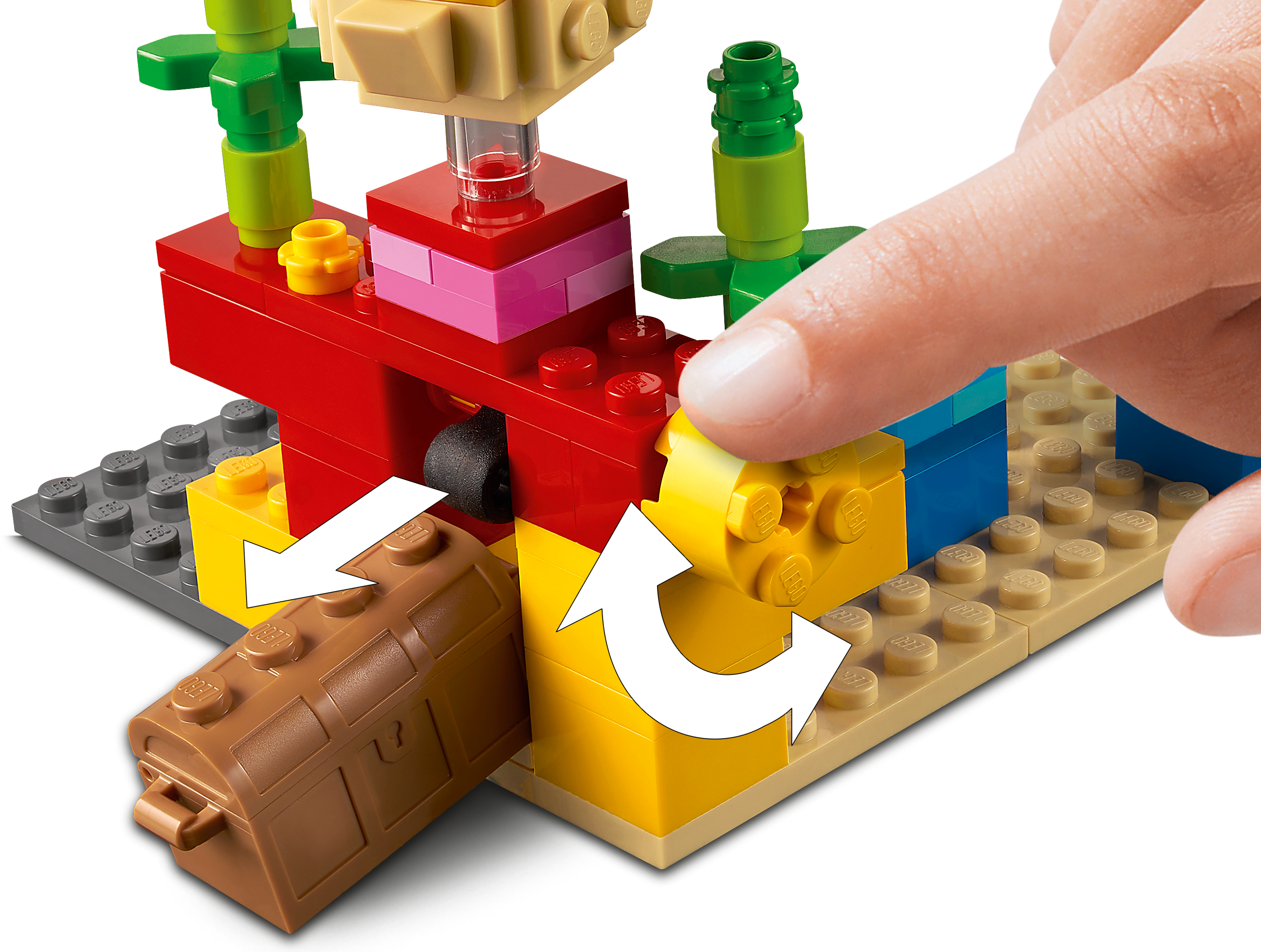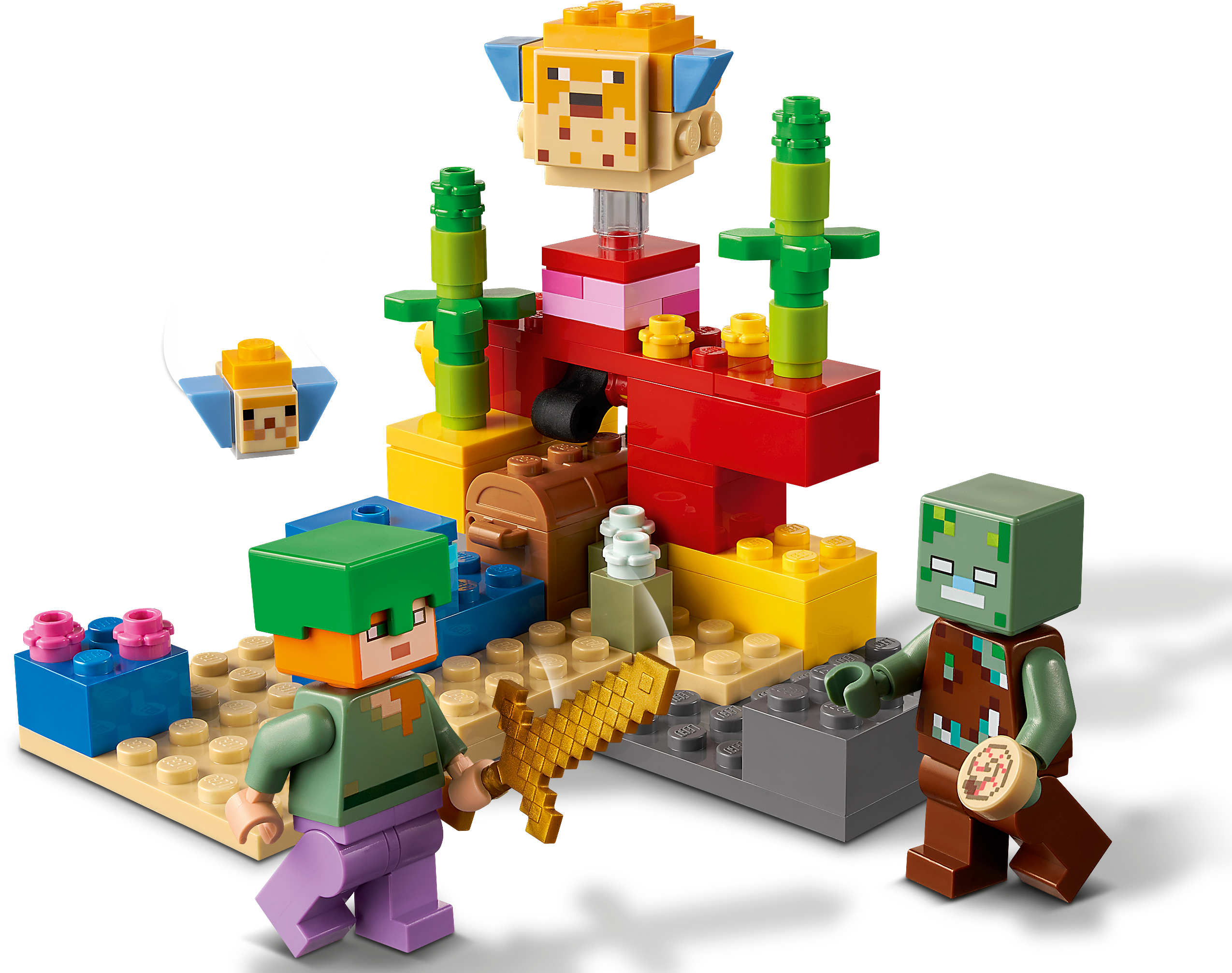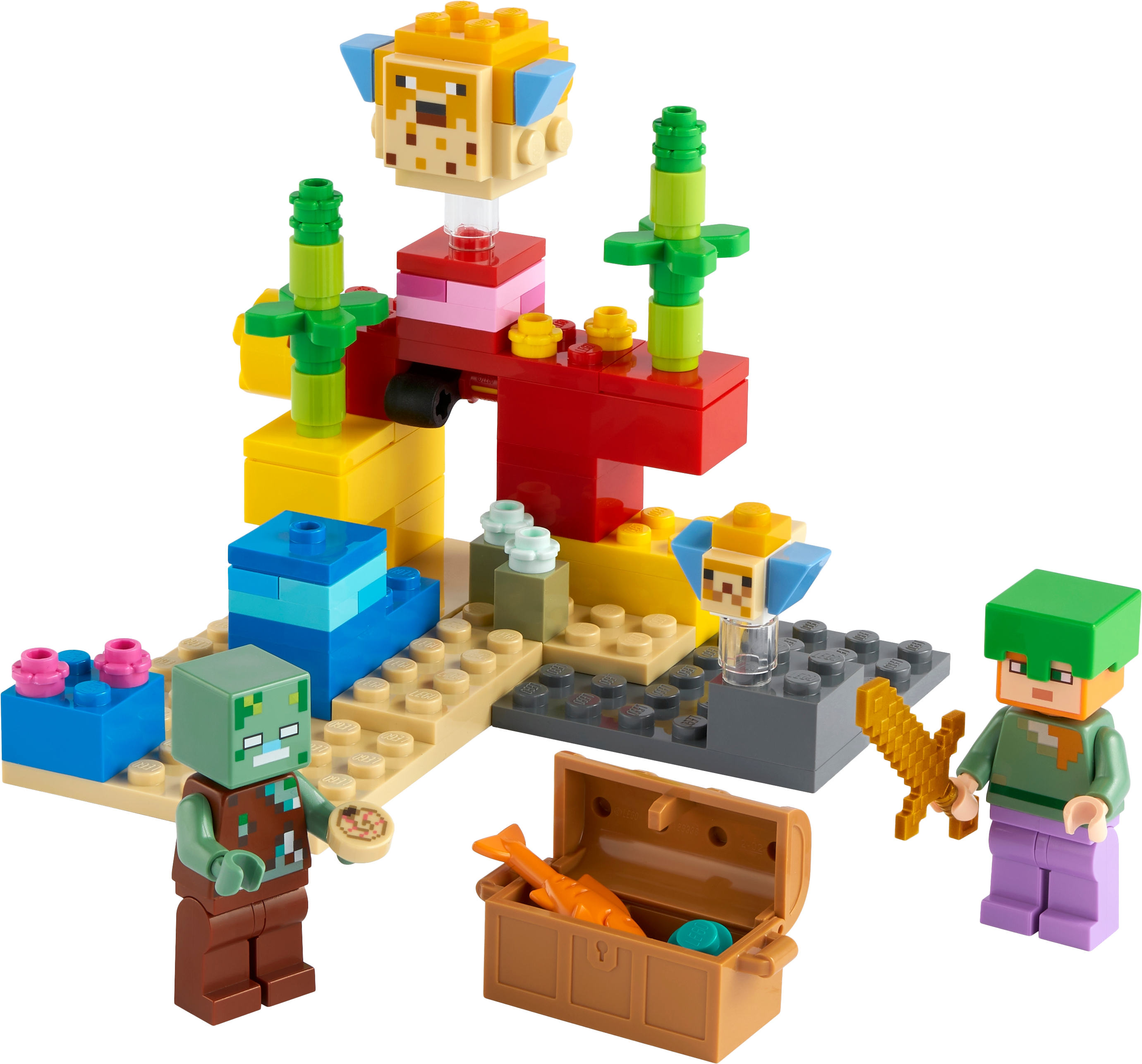 Bring Minecraft™, the hugely popular online kids’ game, to life in the real world with hands-on LEGO® Minecraft The Coral Reef (21164). With endlessly reconfigurable LEGO bricks, the creative-building fun never stops.Authentic Minecraft action in an underwater adventureKids join Minecraft's popular daredevil, Alex, as she dives beneath the Minecraft ocean to search for hidden treasure among the colorful coral reef. The set is packed with imaginative Minecraft features – from the passing puffer fish to the surprise appearance of the treasure chest. And, like all exciting Minecraft stories, there’s a thrilling sword battle with a drowned zombie.LEGO® Minecraft™ The Coral Reef (21164) is a hands-on treat for Minecraft players that brings the game’s underwater adventures to life with endlessly reconfigurable LEGO bricks.Durable LEGO® Minecraft™ set featuring popular gaming character Alex, with diving helmet, magic pants and sword, plus a drowned, 2 puffer fish (1 ‘inflated', 1 normal) and accessories.Kids join Alex, the Minecraft™ daredevil, as she dives beneath the ocean to search for hidden treasure among the colorful coral reef and fight off a surprise attack by a drowned.For ages 7 and up. Delight Minecraft™ players with a real-world Minecraft building playset. The perfect surprise for gamers wanting to take their Minecraft play to the next level.The set measures over 3 in. (7 cm) high, 4 in. (10 cm) wide and 3.5 in. (10 cm) deep – small enough for hands-on fun and big enough for an impressive display.The colorful coral reef scene is packed with authentic Minecraft™ details and awesome accessories, such as the hidden treasure chest which opens to reveal a fish and a pearl.This LEGO® Minecraft™ set is made to last, endlessly reconfigurable, and easy to combine with other LEGO Minecraft sets.The extensive range of LEGO® Minecraft™ playsets bring the online Minecraft game to life with characters, scenes and features recreated with an imaginative mix of long-lasting LEGO bricks.LEGO® components meet stringent industry standards to ensure they are consistent, compatible and connect and pull apart perfectly every time – and it’s been that way since 1958.LEGO® components are dropped, heated, crushed, twisted and analyzed to make sure they satisfy rigorous global safety standards.