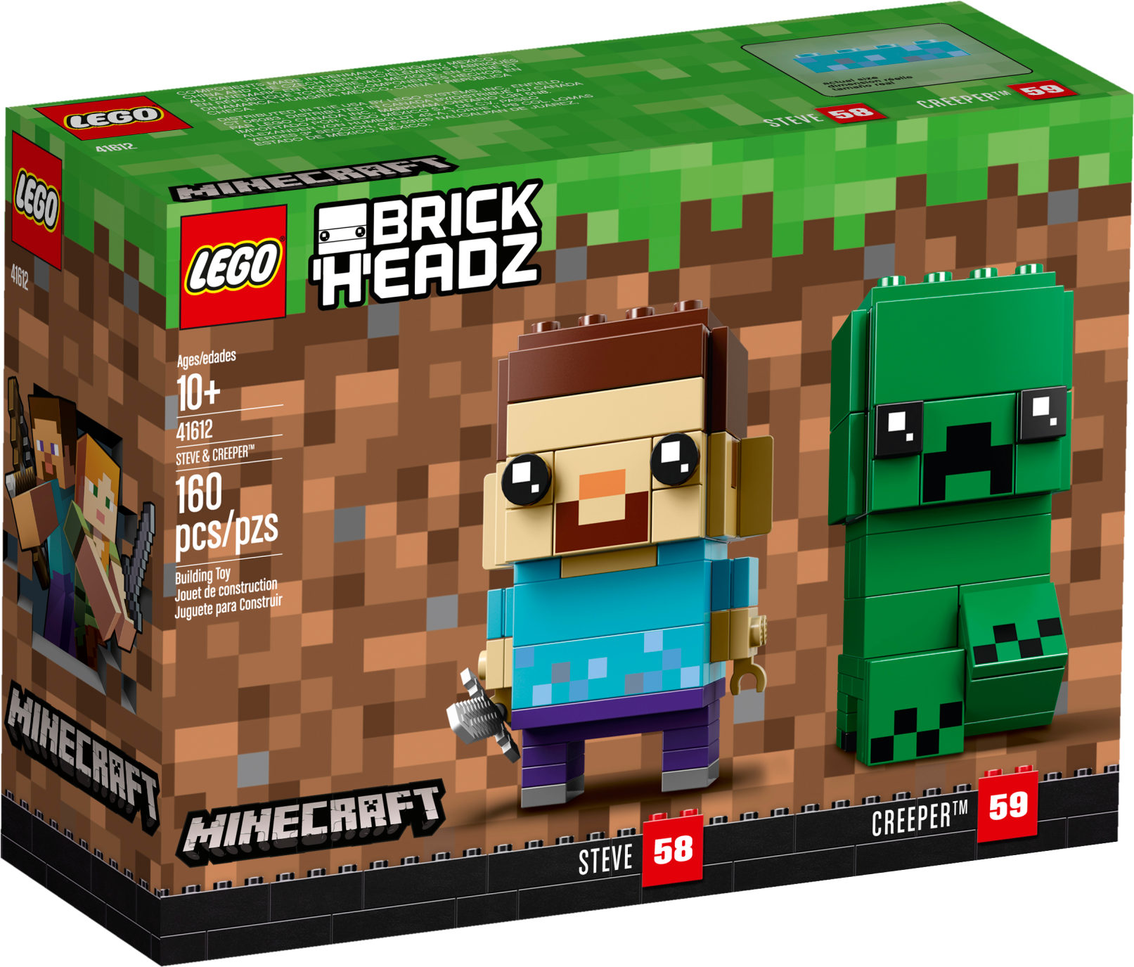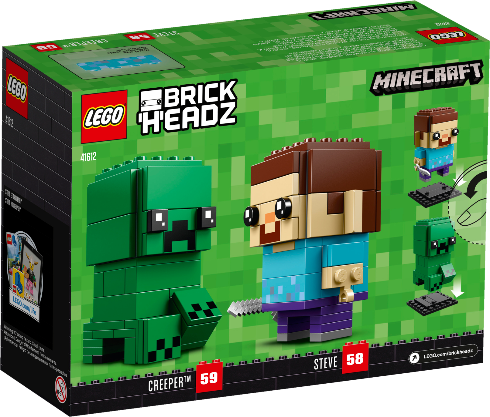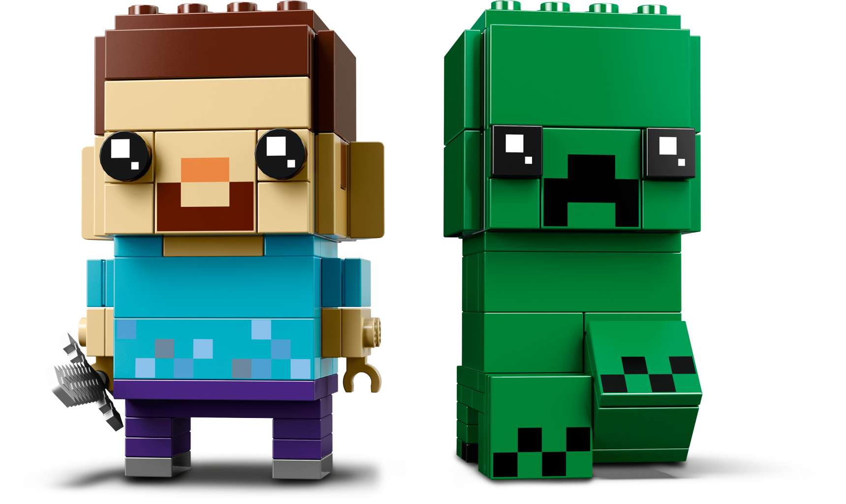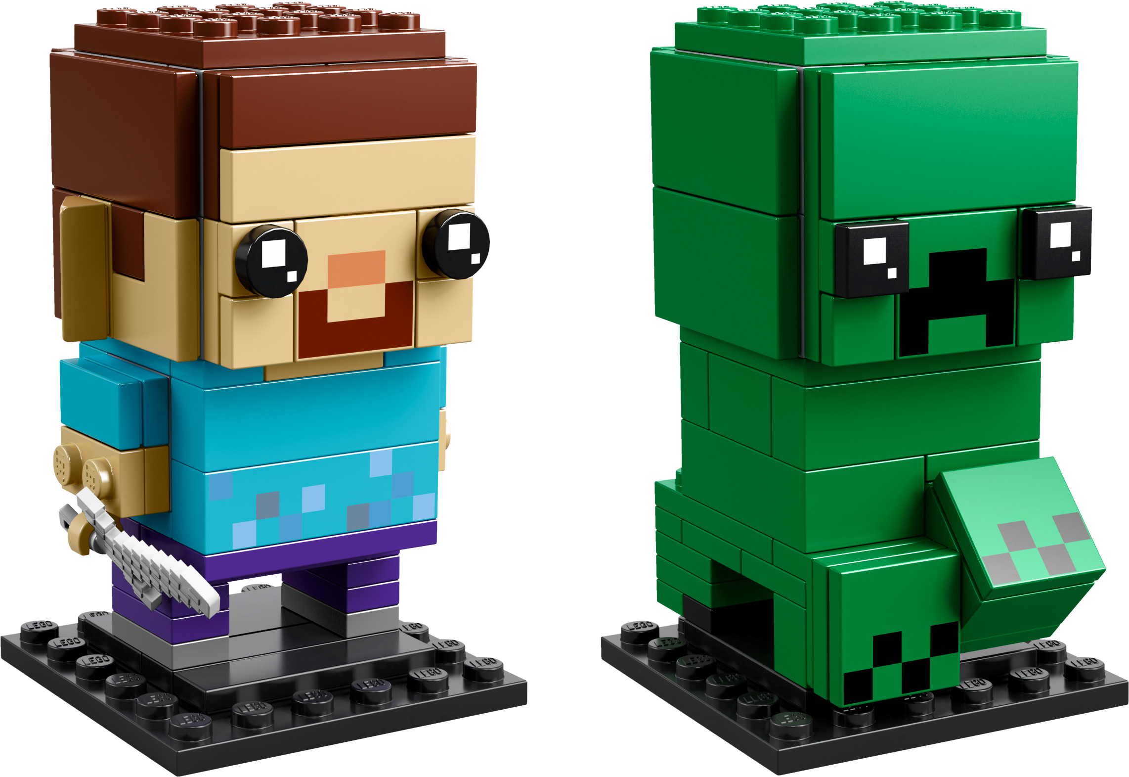 Buildable Steve and Creeper™ LEGO® BrickHeadz™ construction characters feature decorated eyes and authentic details from the smash hit Minecraft™ game, including a pickaxe and a detachable ‘diamond’ sword.