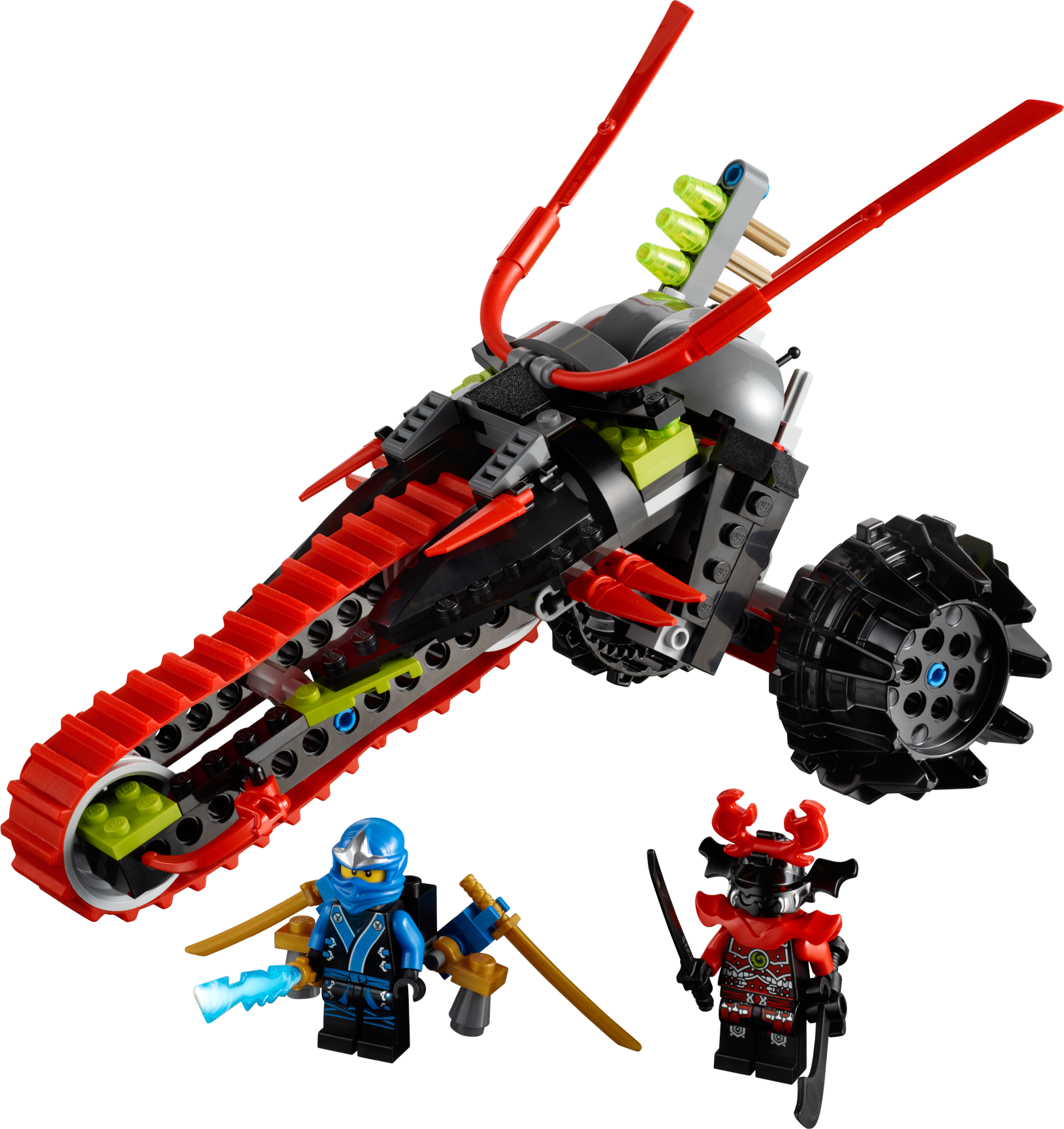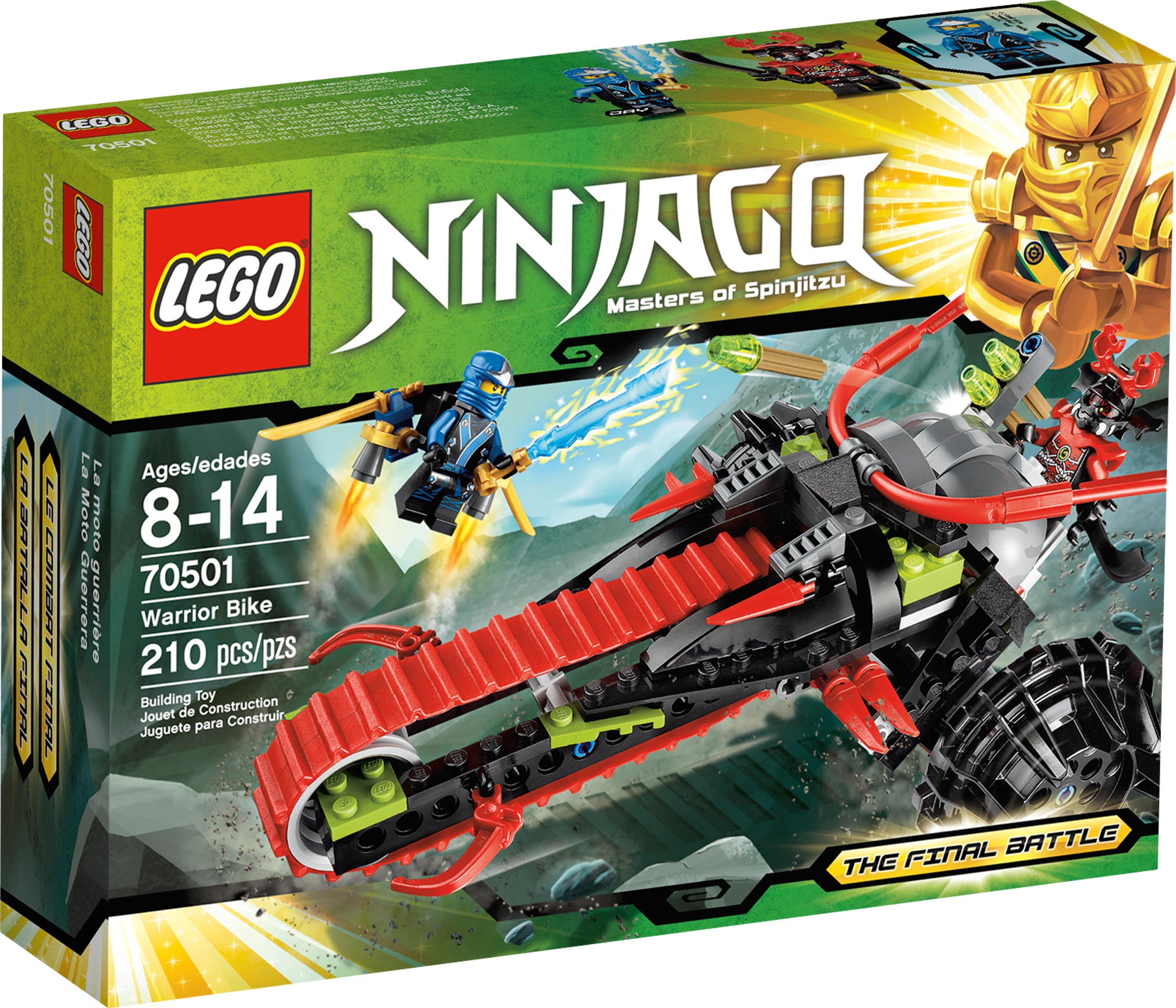 Protect Jay's elemental lightning blade! Lord Garmadon's warrior is in hot pursuit of Jay and the elemental lightning blade! If the warrior takes it to the underworld, the ninjas will never be able to unite the 4 elemental blades and awaken the golden mech to stop Lord Garmadon forever! Help Jay to outrun the Warrior Bike’s quick-fire missile launcher by firing up his rocketpack and escape! Includes 2 minifigures with weapons: Jay and warrior.• Includes 2 minifigures with weapons: Jay and warrior• Features quick-fire flick missile launcher, big wheels and cool red track tire• Weapons include elemental lightning blade, 2 ninja swords, katana and a scimitar• Shoot the quick-fire missiles!• Escape with the rocketpack!• Handle any terrain with the tri-wheel tracked design!• Measures over 5" (15cm) high, 7" (20cm) long and 4" (12cm) wide