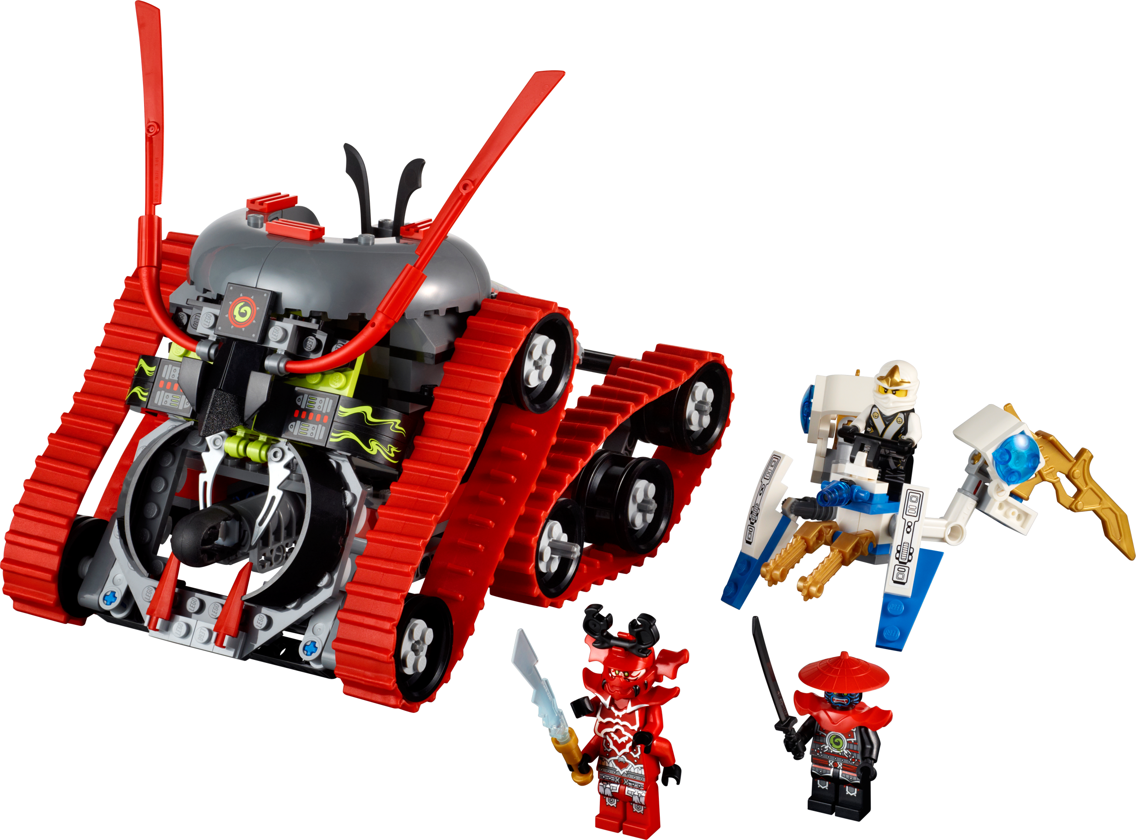 Help Zane to defeat the Garmatron and earn the elemental ice blade! Lord Garmadon's most fearsome soldier, General Kozu has stolen the elemental ice blade and is trying to escape in the Garmatron, a tracked-tire battle machine straight from the underworld. Chase after him with Zane on the ice spider and fire the ice shooter! Dodge the Garmatron’s hidden missile and get the elemental ice blade back without being locked up in the Garmatron’s prison! Includes 3 minifigures with weapons: Zane, General Kozu and swordsman.• Includes 3 minifigures with weapons: Zane, General Kozu and swordsman• Features hidden missile, prison cell with space for a minifigure at the rear, control display and cool rubber tracks• Other vehicles include ice spider with an ice shooter• Weapons include elemental ice blade, 2 scimitars and a katana• Ride the ice spider with Zane!• Fire the Garmatron’s hidden missile!• Take back the elemental ice blade!• Lock a minifigure inside of the Garmatron’s prison cell!• Measures over 5" (15cm) high, 7" (20cm) long and 4" (12cm) wide• Ice spider measures over 2" (7cm) high, 5" (14cm) long and 5" (13cm) wide