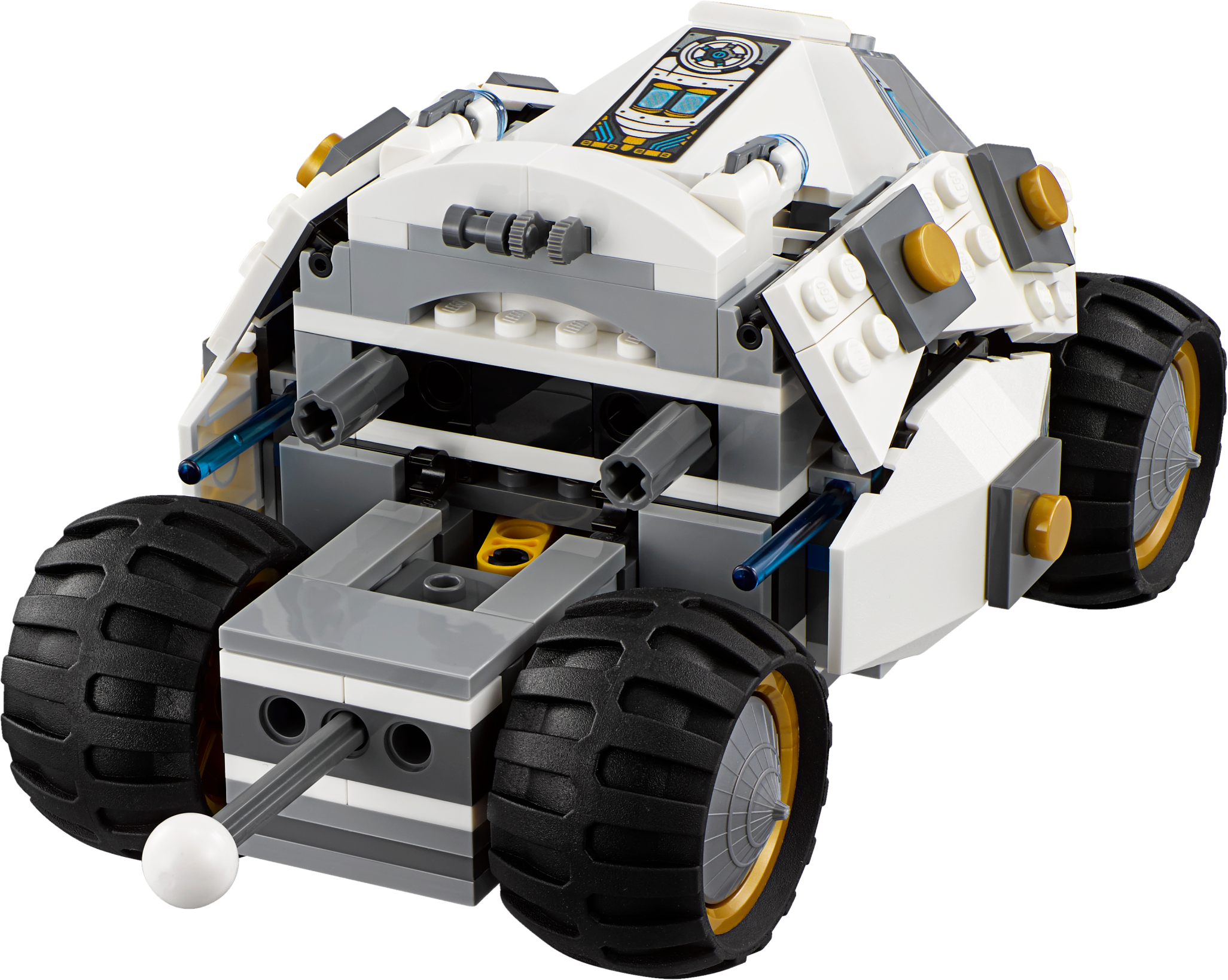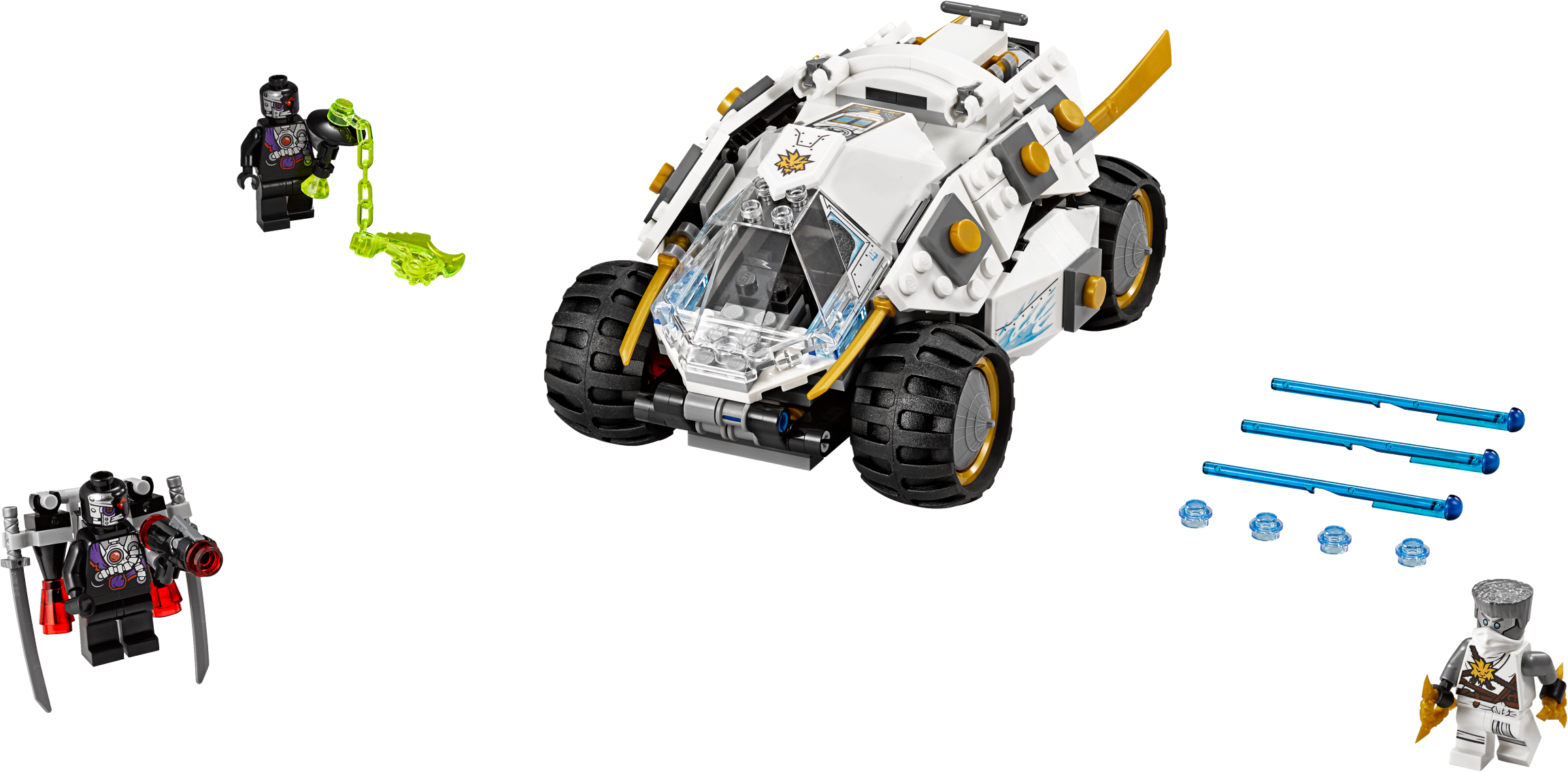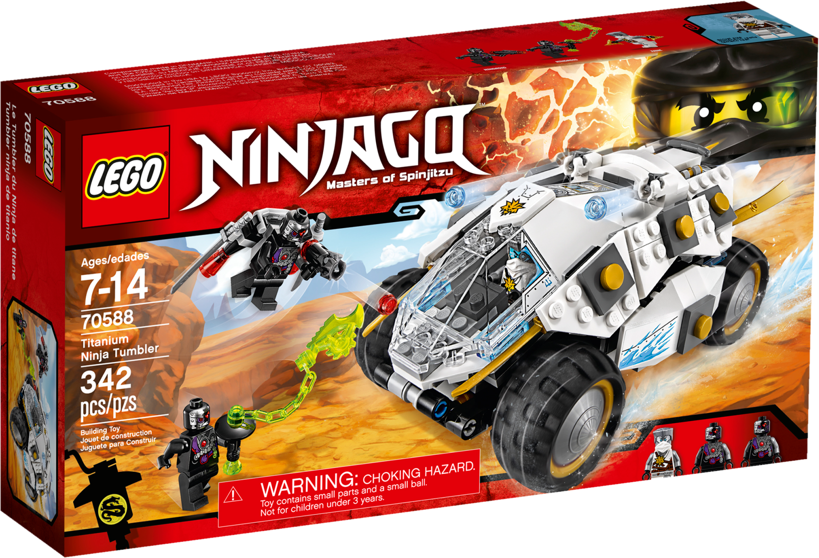Battle the Nindroids with Zane's powerful Titanium Ninja Tumbler! A Nindroid has strapped on his jetpack and is targeting the Titanium Ninja Tumbler, so get ready to fight back! Reveal and fire the Titanium Ninja Tumbler's hidden spring-loaded missiles and detach Zane's flyer to take the conflict to the sky. Evade the Nindroids' stud shooter and Techno-Blade attacks, then capture one of these dangerous villains in the TNT's prison! Includes 3 minifigures: Zane and 2 Nindroids. The Titanium Ninja Tumbler (TNT) vehicle features an opening cockpit, 4 wheels with rubber tires, 2 hidden spring-loaded missiles, 2 stud shooters and a detachable prison to capture a Nindroid. Press the button at the back of the TNT to reveal the hidden spring-loaded missiles and press down lightly on the end of each missile to fire them. The TNT also includes Zane's detachable flyer with golden ninja blades. The Nindroids' brick-builtjetpack features boosters and 2 detachable swords. Weapons include Zane's 2 golden shurikens and the Nindroids' stud shooter and Techno-Blade. Recreate and role-play epic scenes from the NINJAGO™: Masters of Spinjitzu TV show. This set offers an age-appropriate building experience for ages 7-14. Titanium Ninja Tumbler measures over 3” (8cm) high, 7” (20cm) long and 4” (12cm) wide. Zane's detachable flyer measures over 3” (8cm) long, 3” (8cm) wide and under 1” (2cm) high.