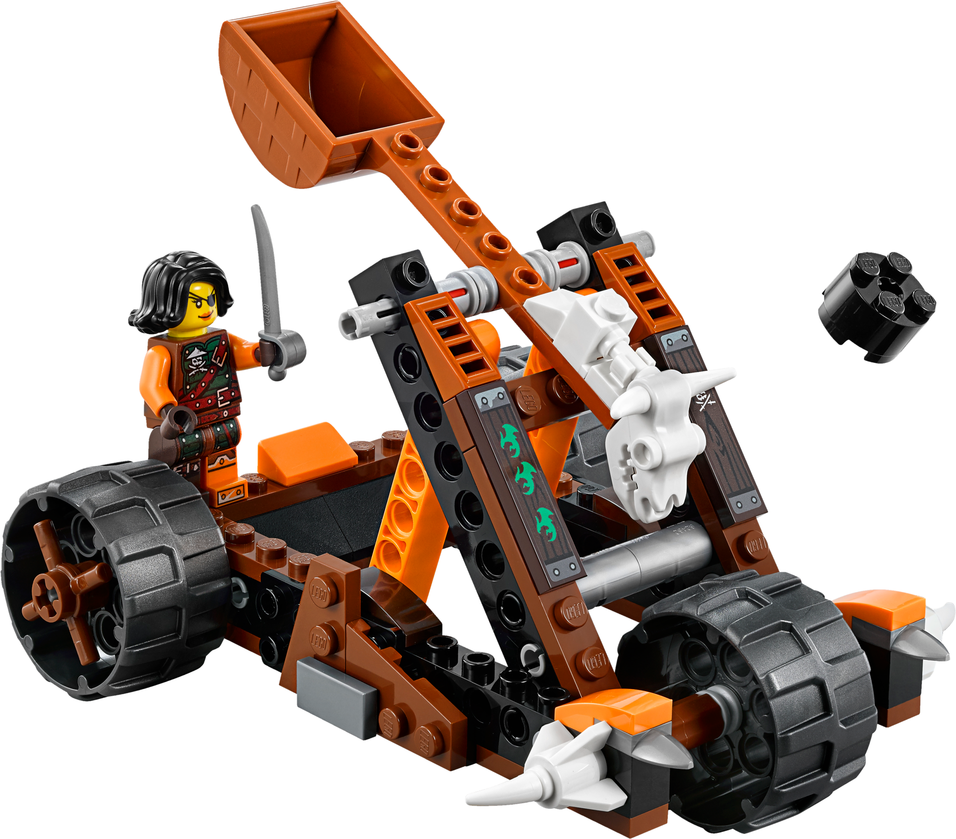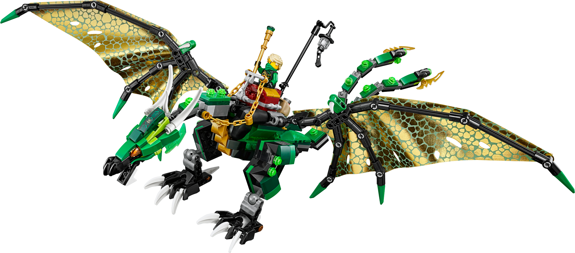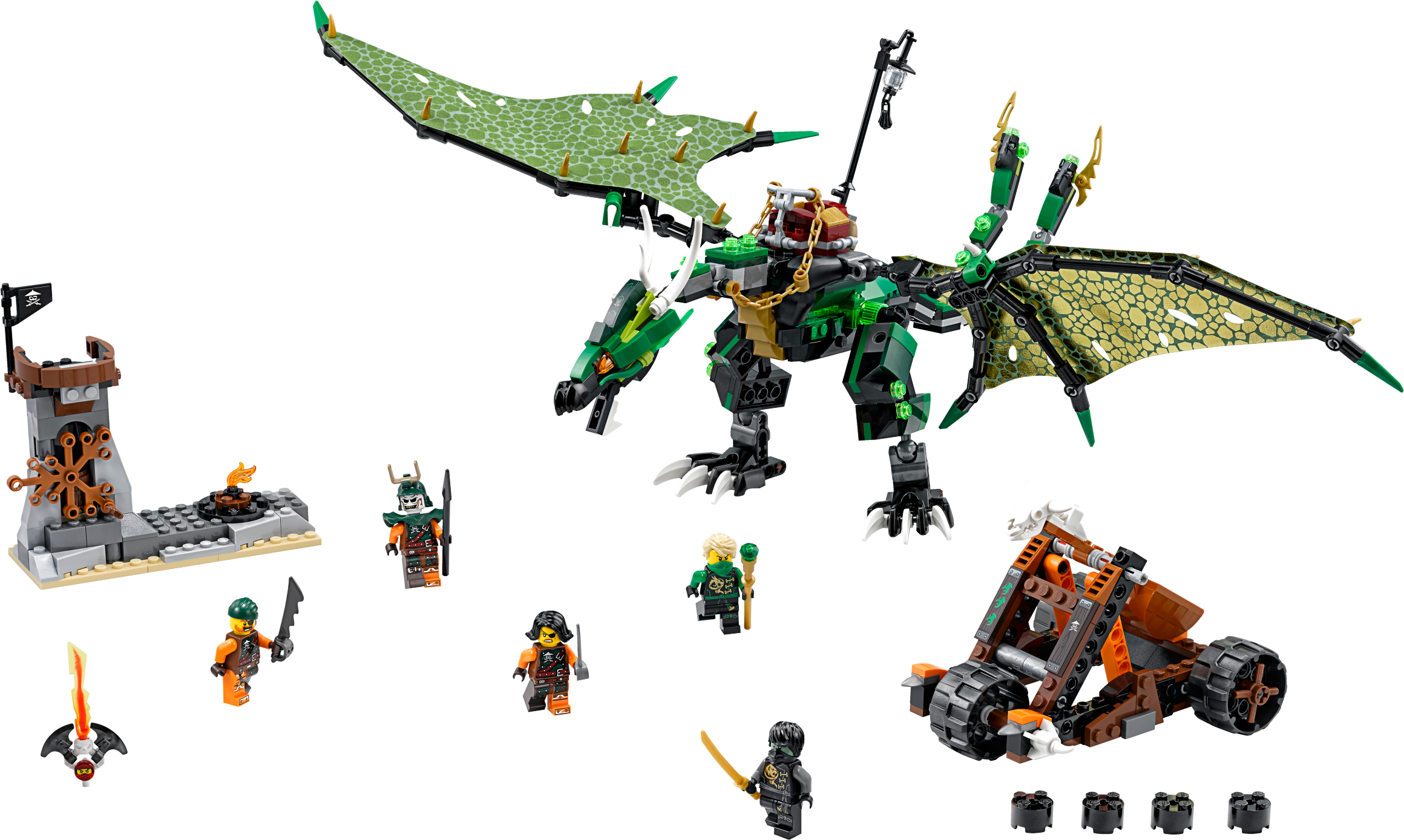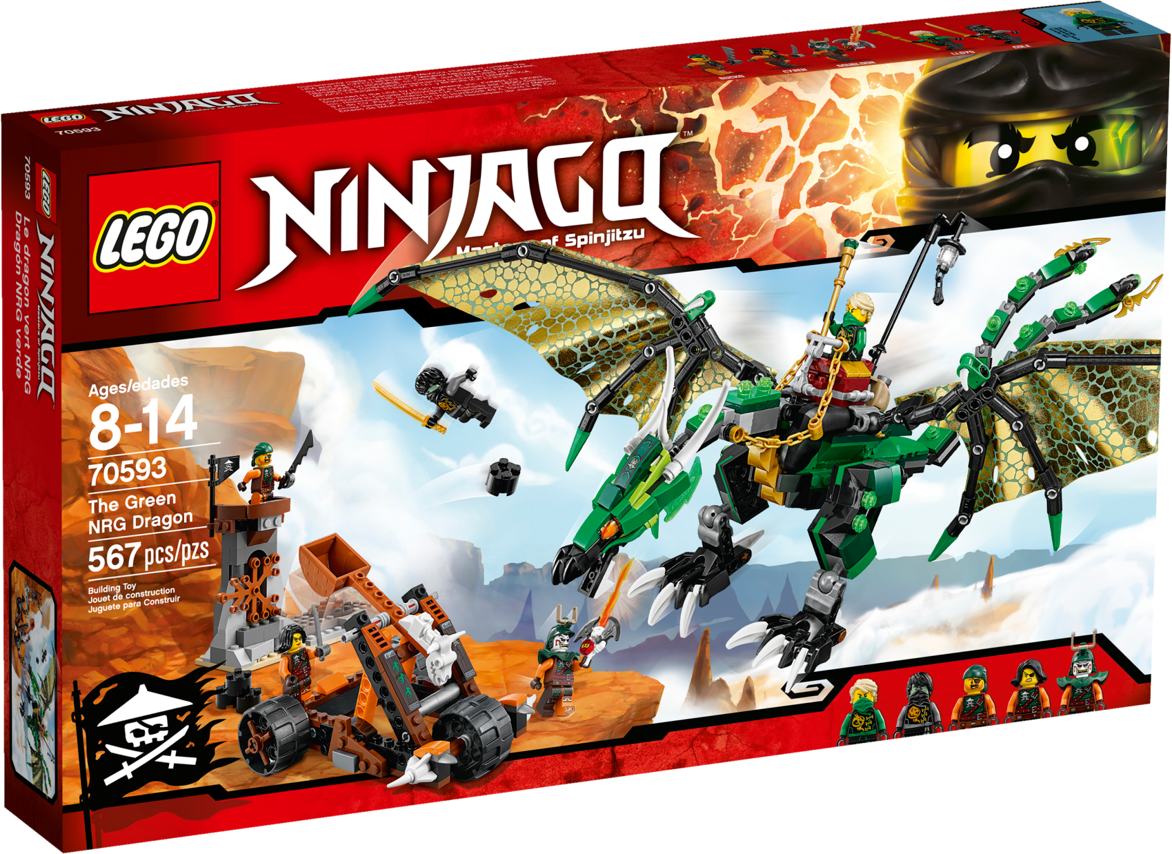 Battle the sky pirates with Lloyd's awesome flying dragon! Place Green Ninja Lloyd on the saddle, grab the chain reins and launch into the air. Flap the Green NRG Dragon's huge wings to fly high and attack the sky pirates' lookout tower with its snapping mouth and dangerous talons. Swerve through the air to avoid shots from the pirates' mobile catapult and fire back with the stud shooters in the dragon's tail. Team up with Ghost Cole to triumph over Battle Doubloon and his crewmates and claim the Djinn Blade!Includes 5 minifigures: Lloyd in Skybound outfit, Ghost Cole in Skybound outfit, Bucko, Cyren and Battle Doubloon.Lloyd's Green NRG Dragon features a saddle for Lloyd, golden chain-style reins, posable head with translucent orange eye elements and snapping mouth, foldable printed textile wings with spike details, posable legs, talons, and posable split tail with 2 stud shooters.The sky pirates' lookout tower has a flag, hidden barrel with 2 golden coin elements, and a campfire with a translucent flame element.The sky pirates' catapult includes 3 turning wheels and 4 round 2x2 LEGO® bricks for ammunition.Weapons include Cole's golden sword, the sky pirates' sword, standard sword, spear and the Djinn Blade.Includes a lantern accessory element.Recreate and role-play epic scenes from the NINJAGO™: Masters of Spinjitzu TV show.This set offers an age-appropriate building experience for ages 8-14.The Green NRG Dragon measures over 5” (15cm) high, 14” (37cm) long and 8” (21cm) wide with folded wings, and 22” (57cm) wide with unfolded wings.The sky pirates' catapult measures over 3” (10cm) high, 5” (13cm) long and 4” (11cm) wide.The sky pirates' lookout tower measures over 4” (12cm) high, 1” (5cm) long and 4” (12cm) wide