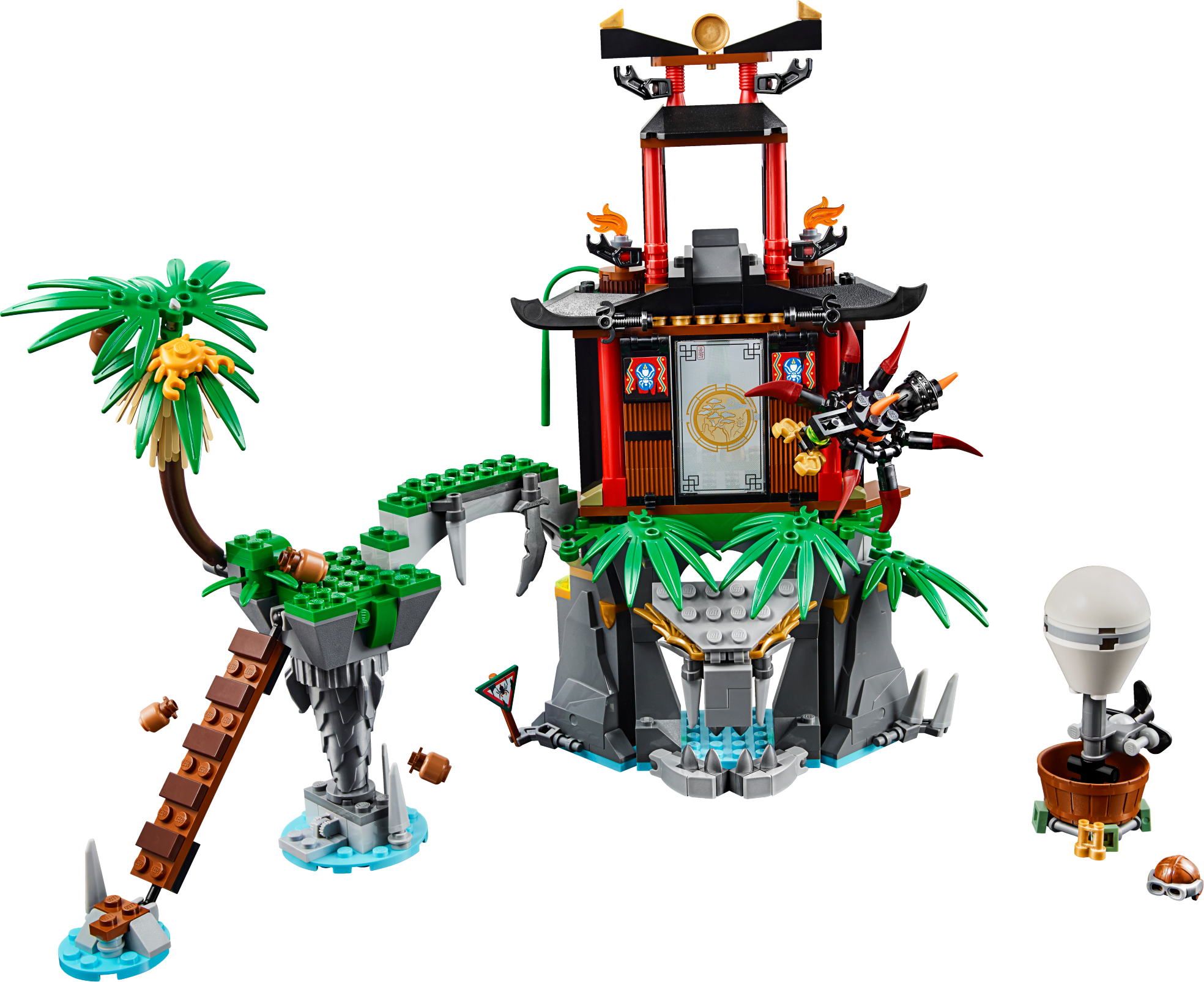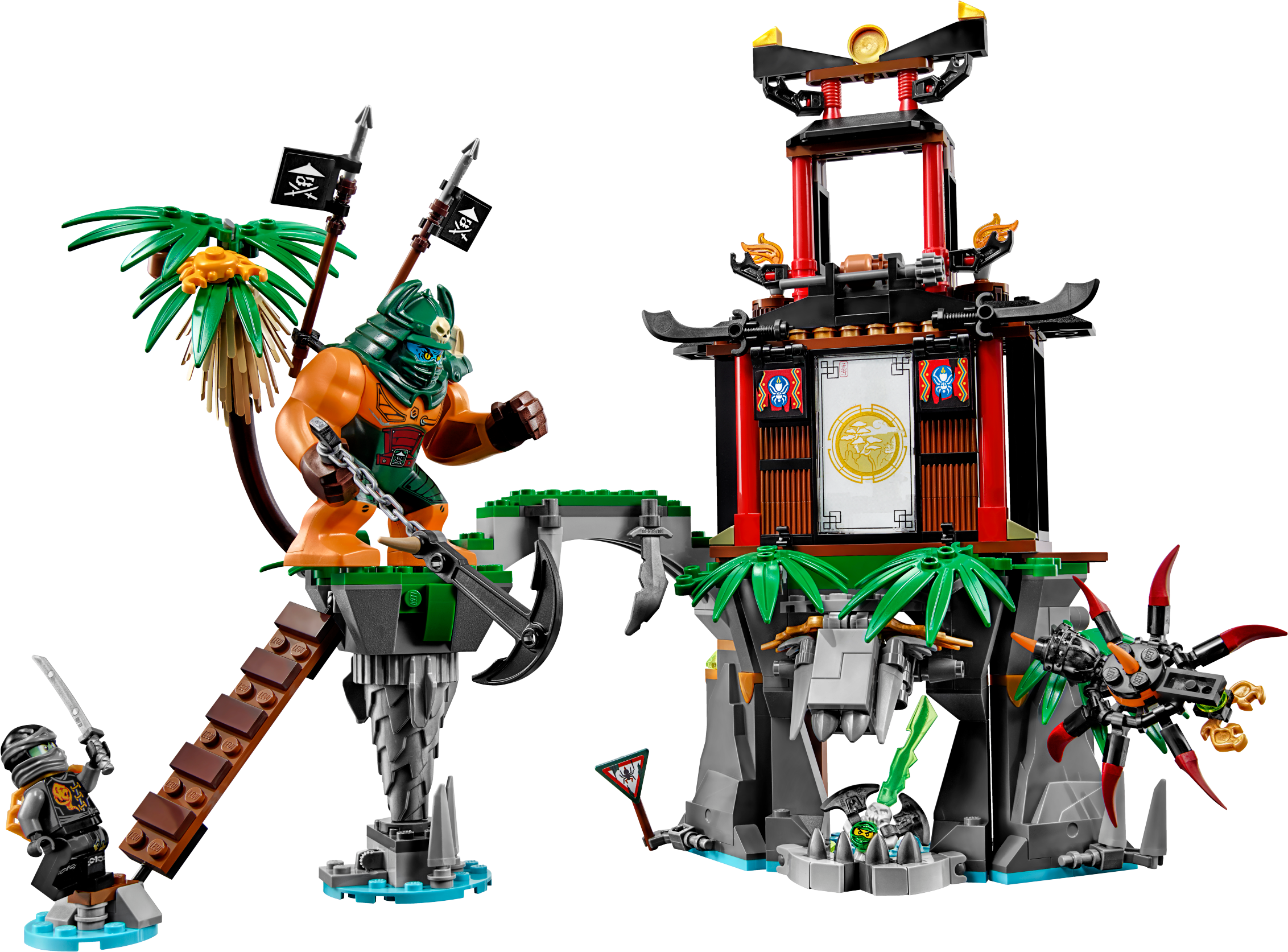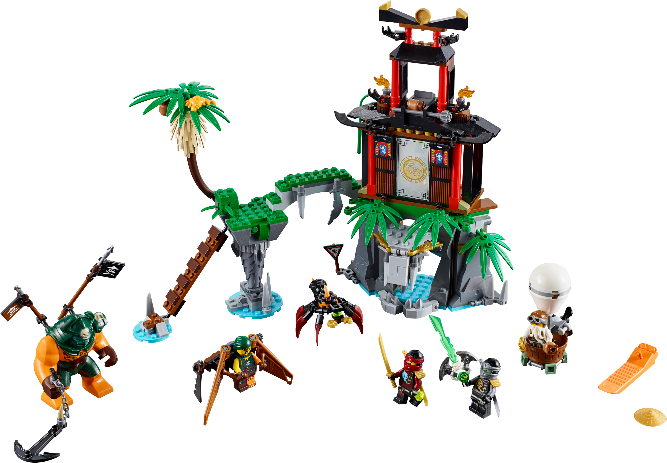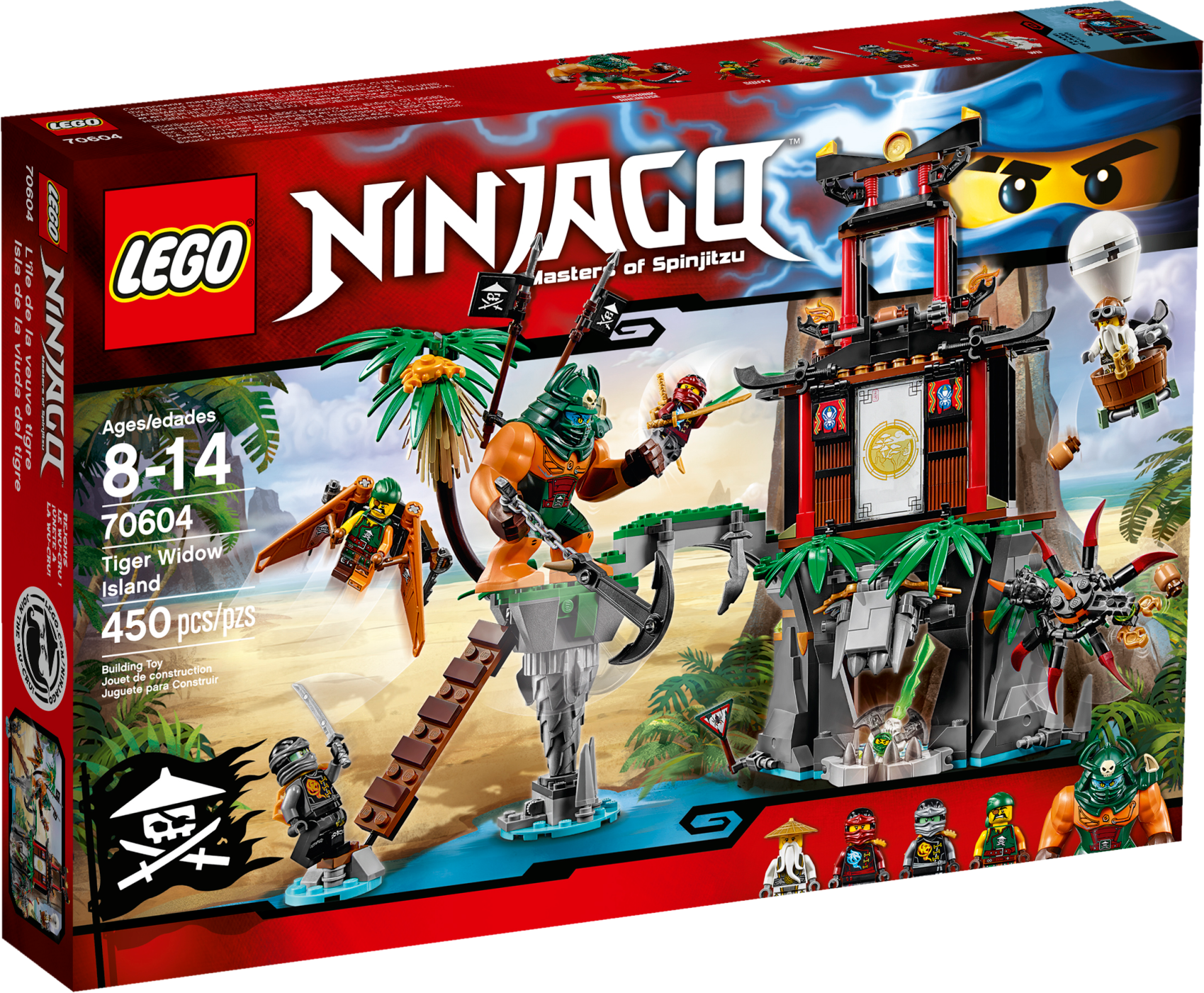 Ninja alert! Tiger Widow Island is under attack! Mighty Dogshank is approaching carrying her huge anchor weapon. Fight back with Nya’s katana and drop coconuts on Dogshank from the tower and Sensei Wu’s hot air balloon. Watch out for Sqiffy’s pirate flyer and make the palm tree fall to knock him off the ladder. Hide out in the cave—and beware of the giant venomous spider roaming the island! Defeat the pirate invaders and free trapped Lloyd from the special Djinn Blade! Includes 4 minifigures: Nya, Cole, Sensei Wu and Sqiffy, plus a Dogshank big figure. Tiger Widow Island features a tower with a coconut-dropping function, vine for a Ninja to swing down from, a Ninja mission room with swinging lantern, Ninjago map and mission instruction elements, a cave with lever-operated opening entrance and hidden crystal and golden elements, plus Ninja decorations, palm leaf and translucent fire elements. The island also features a bridge, ladder and falling-palm-treefunction to knock over intruders. The pirate flyer attaches to the Sqiffy minifigure’s back and has adjustable wings, blades and an attachment point for the Djinn Blade. Drop coconuts on the pirate invaders from Sensei Wu’s hot air balloon. The Dogshank big figure has posable arms and comes with a chained anchor weapon and 2 adjustable pirate flags on her back. The spider features pincers, posable legs and posable stinger. Other weapons include a translucent green Djinn Blade with ‘trapped Lloyd’ element, Nya’s 2 golden katanas, Cole’s silver katana, Sensei Wu’s battle staff and Sqiffy’s 2 guns. Accessory elements include Sensei Wu’s coconuts, binoculars and flyer helmet, and Nya’s vial of spider poison. Nya minifigure comes with a special water Ninja outfit. Cole minifigure features special ghost decoration. Sensei Wu minifigure comes with a spare flying hat with goggles. Recreate and role-play epic scenes from the NINJAGO™: Masters of Spinjitzu TV show. Tiger Widow Island measures over 9” (25cm) high, 12” (33cm) wide and 6” (17cm) deep. Sensei Wu’s hot air balloon measures over 3” (8cm) high, 1” (5cm) long and 1” (3cm) wide. Spider measures over 1” (3cm) high, 2” (6cm) long and 2” (7cm) wide. Pirate flyer measures over 1” (3cm) high, 1” (5cm) long and 3” (9cm) wide. Dogshank big figure stands over 2” (7cm) tall.