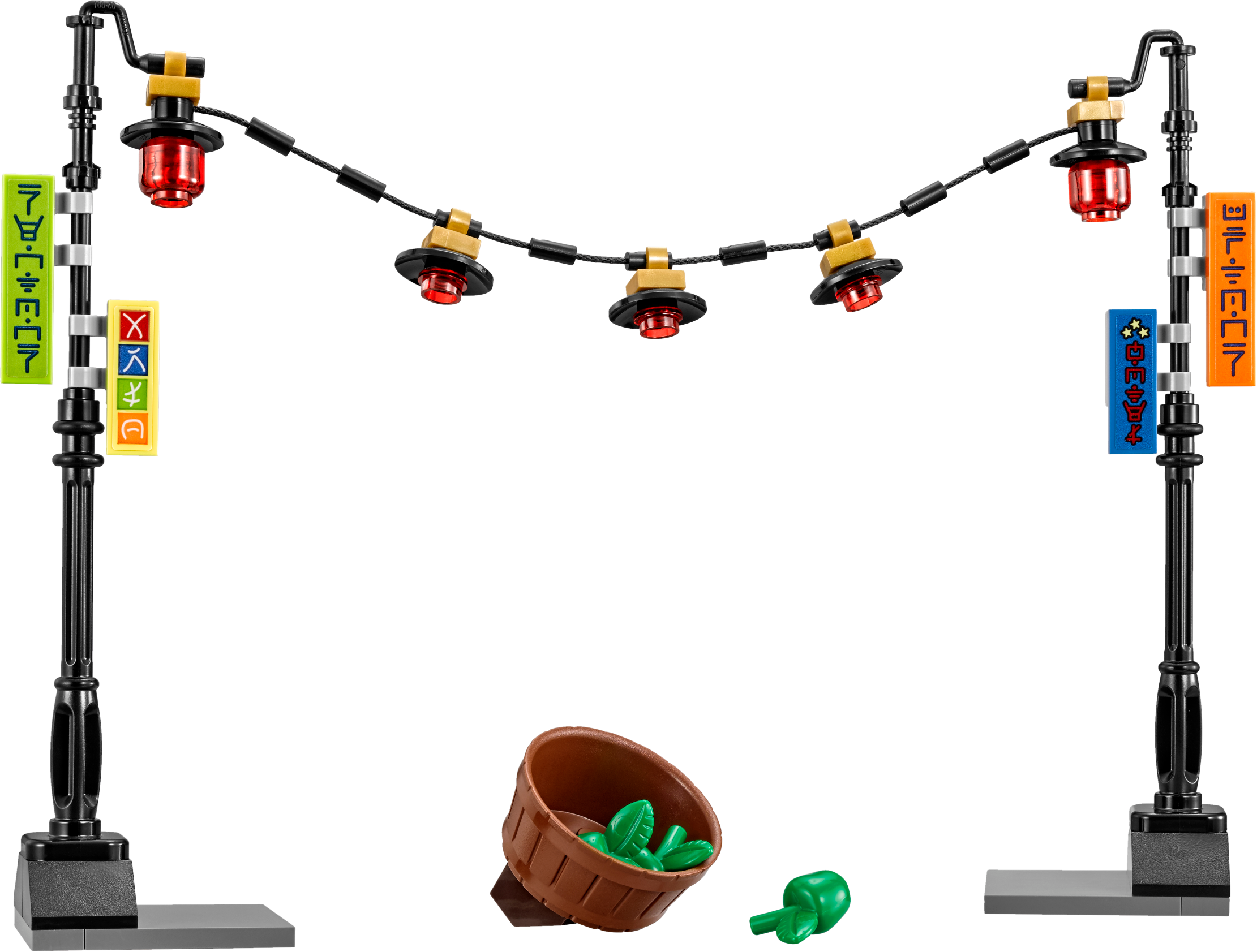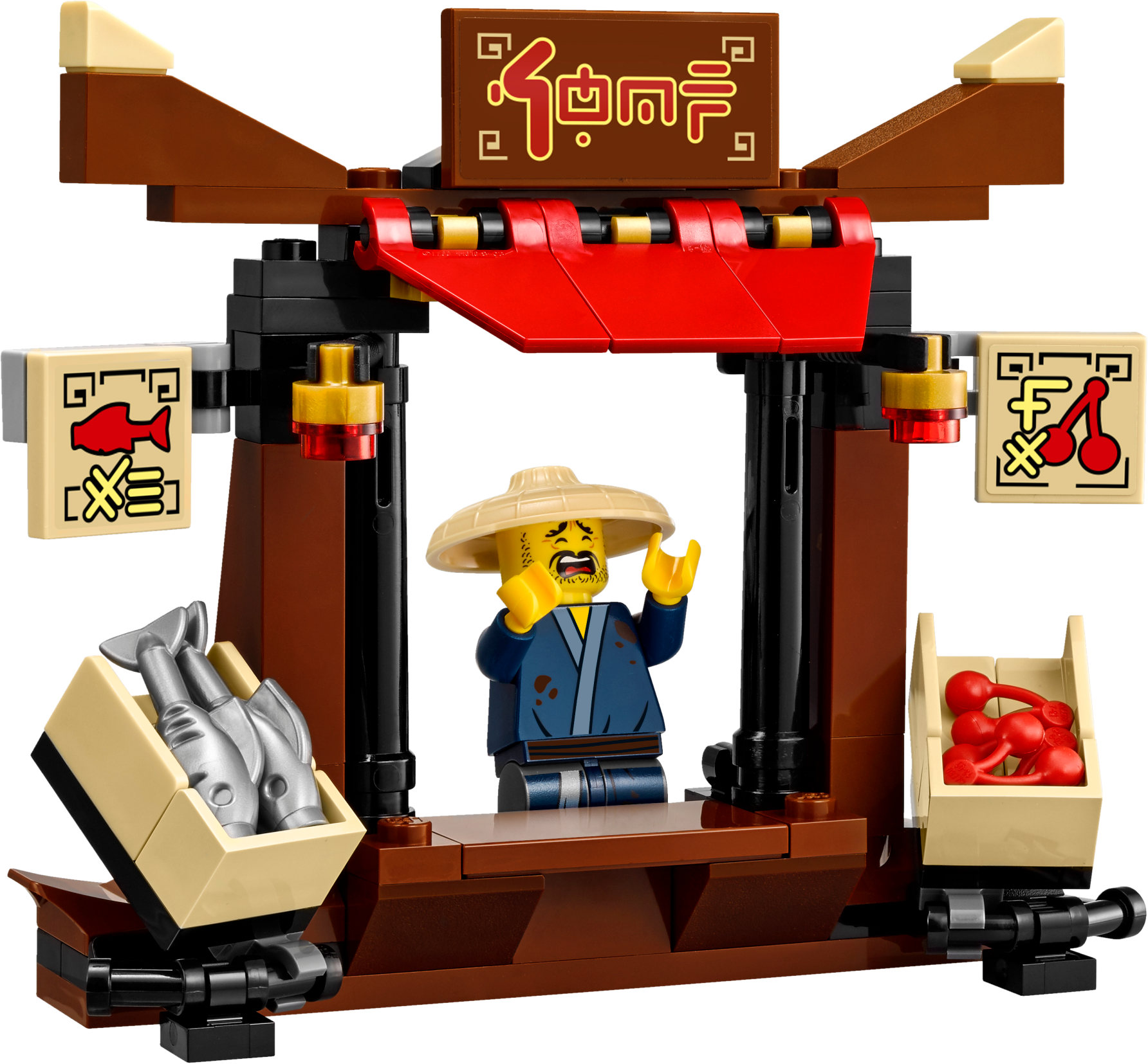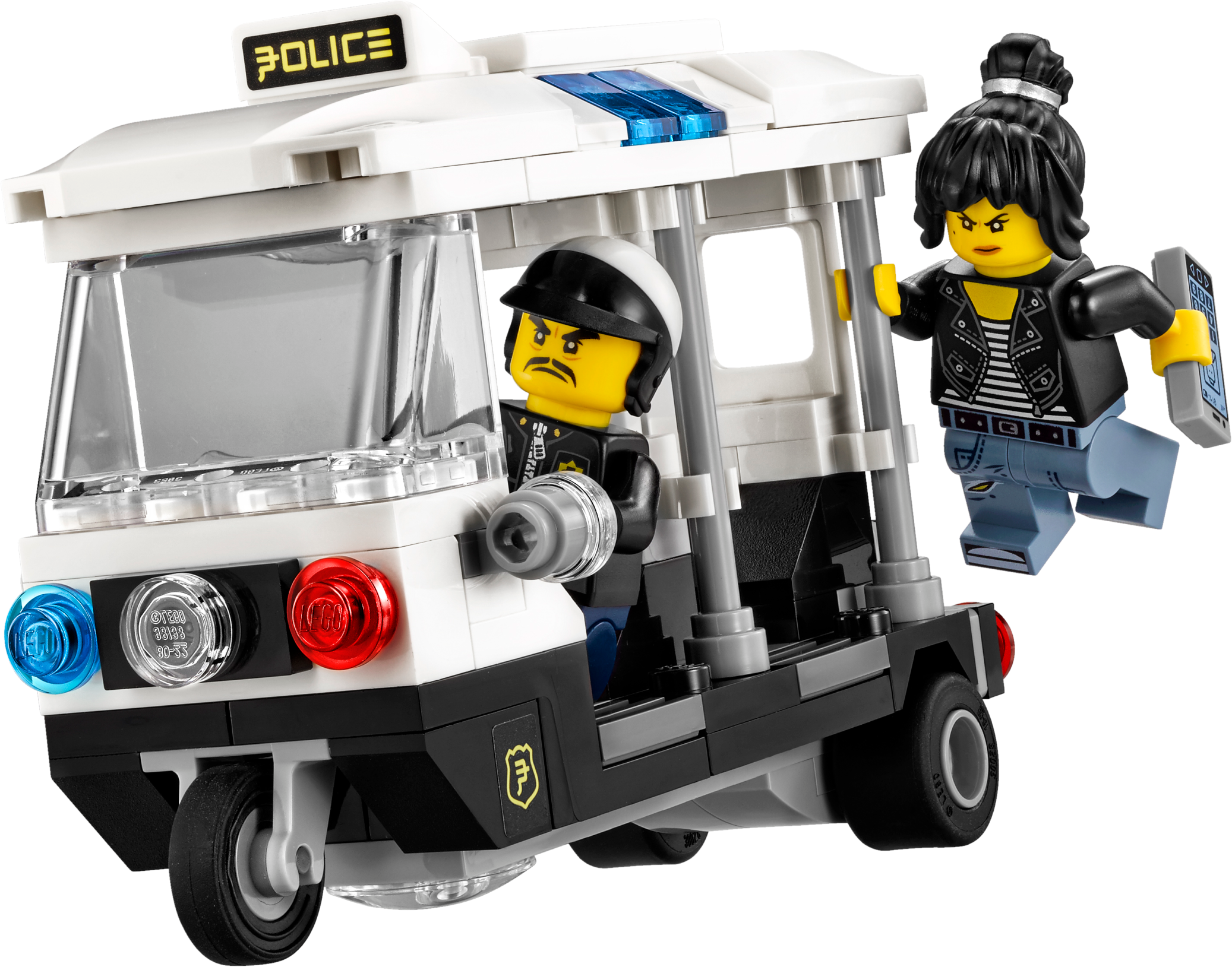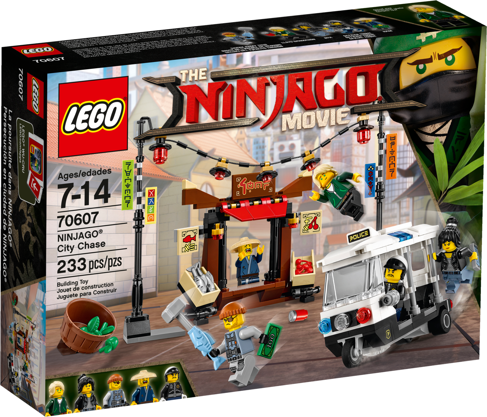 Team up with Lloyd Garmadon, Nya and Officer Toque to prevent Shark Army Thug robbing a street food stall vendor in NINJAGO® City Chase. This exciting THE LEGO® NINJAGO MOVIE™ set features a 3-wheel police tuc-tuc vehicle, street food stall with assorted food elements, plus 2 lampposts with a connecting chain of festive NINJAGO lanterns. The set also includes 5 minifigures with various weapons and accessories to add to the fun role-play possibilities. Includes 5 minifigures: Lloyd Garmadon and Nya (each with new-for-August-2017 high school outfit decoration), Officer Toque, Shark Army Thug and Ham. Police tuc-tuc vehicle features a driver seat and rear passenger seat for minifigures, 3 wheels and translucent-blue and red police light-style elements. Street food stall features a stall sign, red awning, fish and cherries for-sale signs, 2 crates and a half-barrel containing assorted elements including 3 cherries, 3 apples and 2 fish.Also includes 2 lampposts with translucent decorative elements and translucent-red light-style elements, plus a connecting chain of festive NINJAGO® lanterns with translucent-red light-style elements. Weapons include Shark Army Thug’s fish hammer with a fish handle. Accessory elements include Lloyd Garmadon's soda, Nya's mobile phone, Officer Toque's handcuffs and Ham's money. Recreate and role-play exciting THE LEGO® NINJAGO® MOVIE™ scenes. Police tuc-tuc measures over 2” (7cm) high, 2” (7cm) long and 1” (3cm) wide. Street food stall measures over 4” (11cm) high, 3” (9cm) wide and 1” (3cm) deep. Lampposts with lantern chain measure over 5” (14cm) high, 7” (19cm) wide and 1” (3cm) deep.