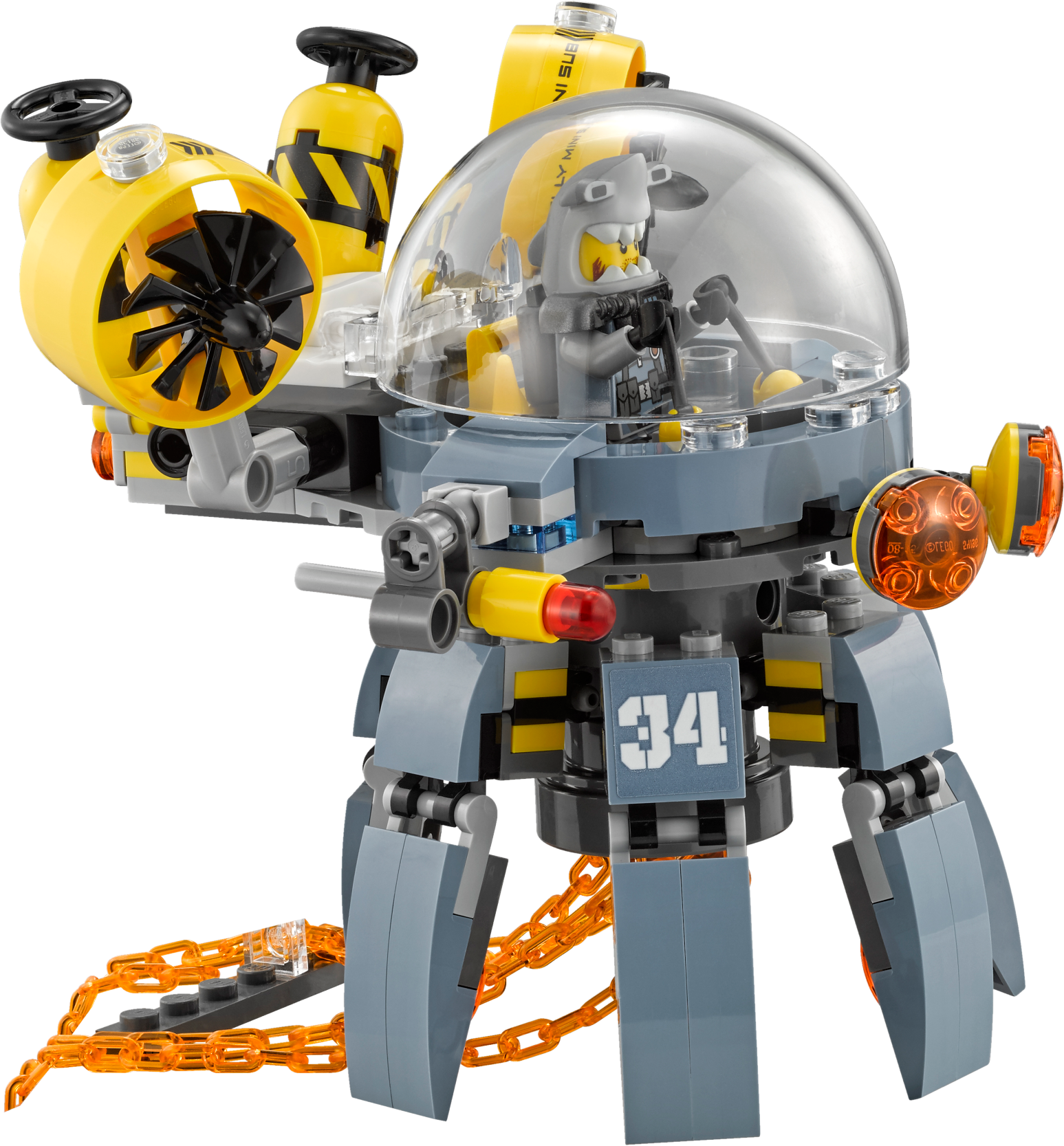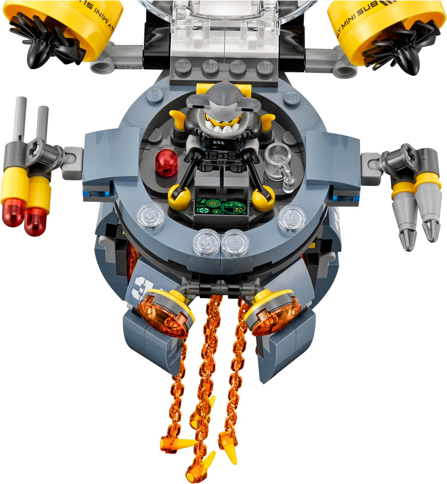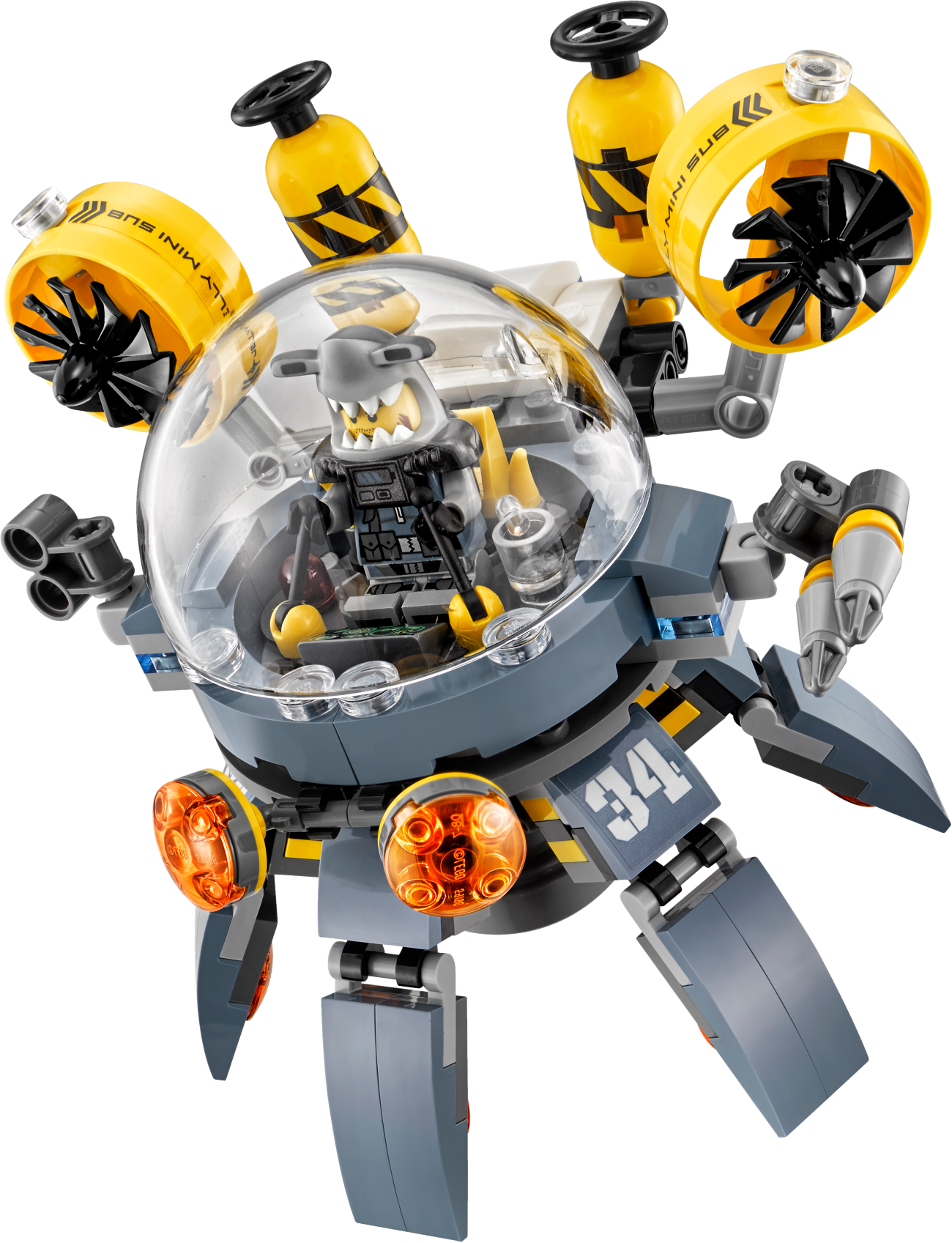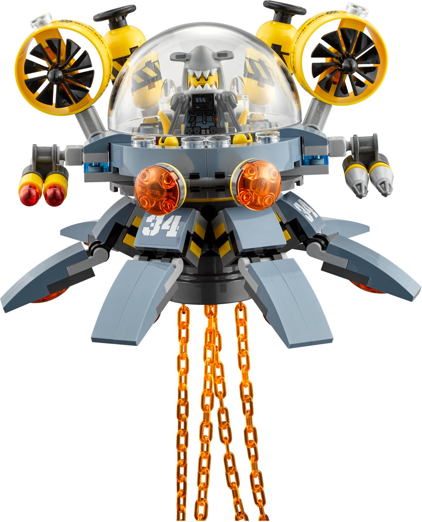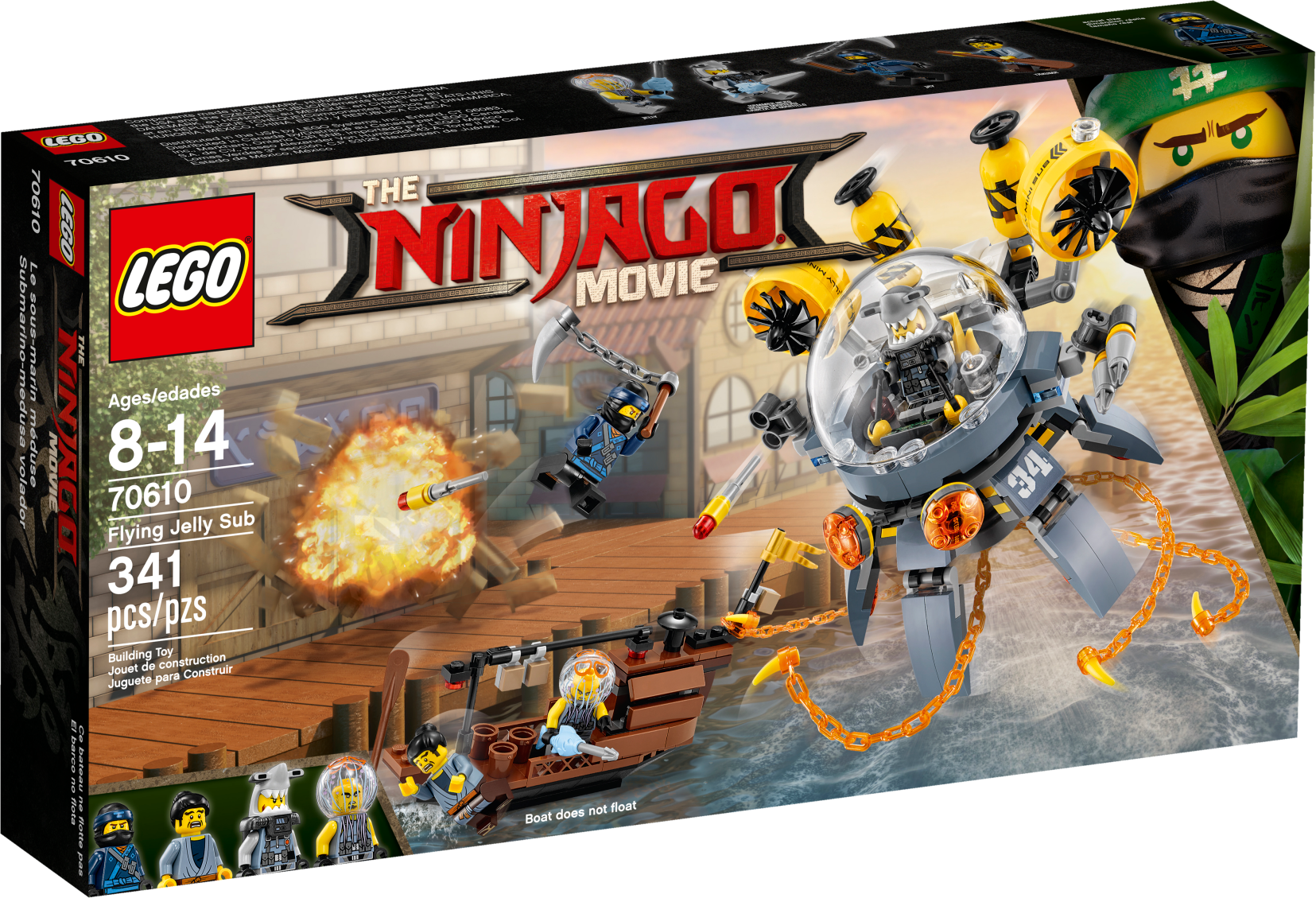 Join ninja Jay in battle against the shark army and protect Takuma’s boat from Flying Jelly Sub attacks, in this action-packed THE LEGO® NINJAGO® MOVIE™ set. The sub features an opening minifigure cockpit, rotating legs, 2 flick missiles and swinging ‘toxic’ tentacles. Also includes a boat, plus 4 minifigures with assorted weapons to add to the battle role-play options. Includes 4 minifigures: Jay, Takuma, Jelly and Hammer Head. Flying Jelly Sub features an opening minifigure cockpit with bubble windshield and detailed dashboard, rotating legs, 2 flick missiles, 2 spinning rotors, 2 canisters, swinging translucent-orange ‘toxic' tentacles and translucent-red eye elements. The boat features a flag, paddle and 3 buckets. Weapons include Jay's spiked flail, Jelly's fish spear and Hammer Head's fish blade. Recreate and role-play exciting THE LEGO® NINJAGO® MOVIE™ scenes. Flying Jelly Sub measures over 8” (21cm) high, 5” (14cm) long and 5” (14cm) wide. Boat measures over 3” (8cm) high, 6” (16cm) long and 1” (4cm) wide.