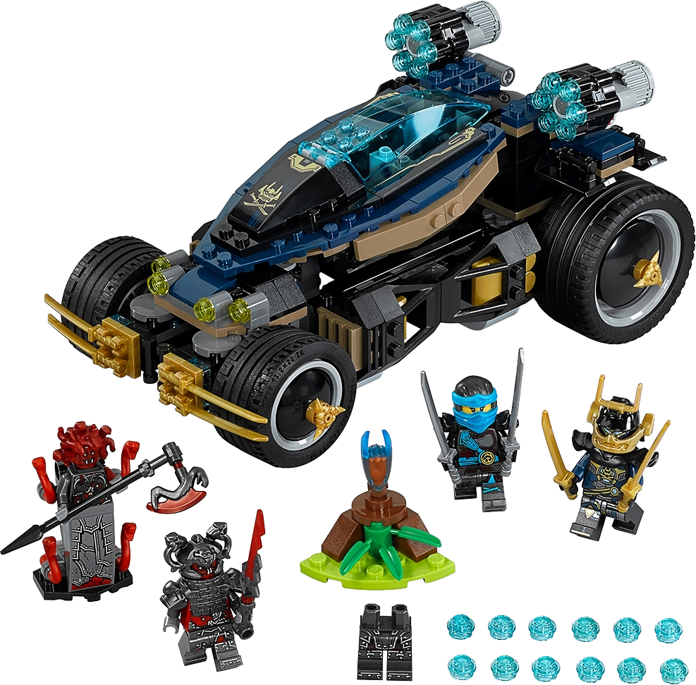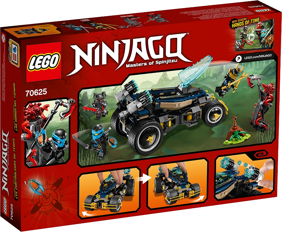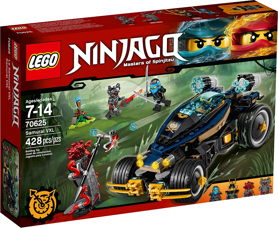 Steer the armored Samurai VXL vehicle to help Nya and new Samurai X defeat the Vermillion warriors and capture the Slow-Mo Time Blade. This detailed vehicle features an opening minifigure cockpit, special tilting four-wheel-drive steering and six-stud rapid shooters. This great set also includes four minifigures equipped with assorted weapons to intensify the role-play battle action. Includes four minifigures: Nya, General Machia, Rivett and new-for-spring-2017 Samurai X. The armored Samurai VXL vehicle features an opening minifigure cockpit with translucent-blue windshield, big rubber wheels, dual six-stud rapid shooters, a special tilting four-wheel-drive steering system and golden ninja blade elements. Tilt the cockpit to steer the Samurai VXL around any obstacle. The Time Blade stand has the detachable translucent-blue Slow-Mo Time Blade and swamp reed elements. Weapons include Nya’s two katanas, Samurai X’s two golden katanas, General Machia’s Vermillion axe and Rivett’s Vermillion sword. Accessory elements include General Machia’s Medusa hair with snake elements and Rivett’s Vermillion helmet. Recreate and role-play epic scenes from the NINJAGO®: Masters of Spinjitzu TV show. This set offers an age-appropriate build and play experience for ages 8+. Samurai VXL measures over 3” (10cm) high, 7” (20cm) long and 5” (13cm) wide. Vermillion egg measures over 1” (3cm) high, 1” (3cm) wide and 1” (3cm) deep.