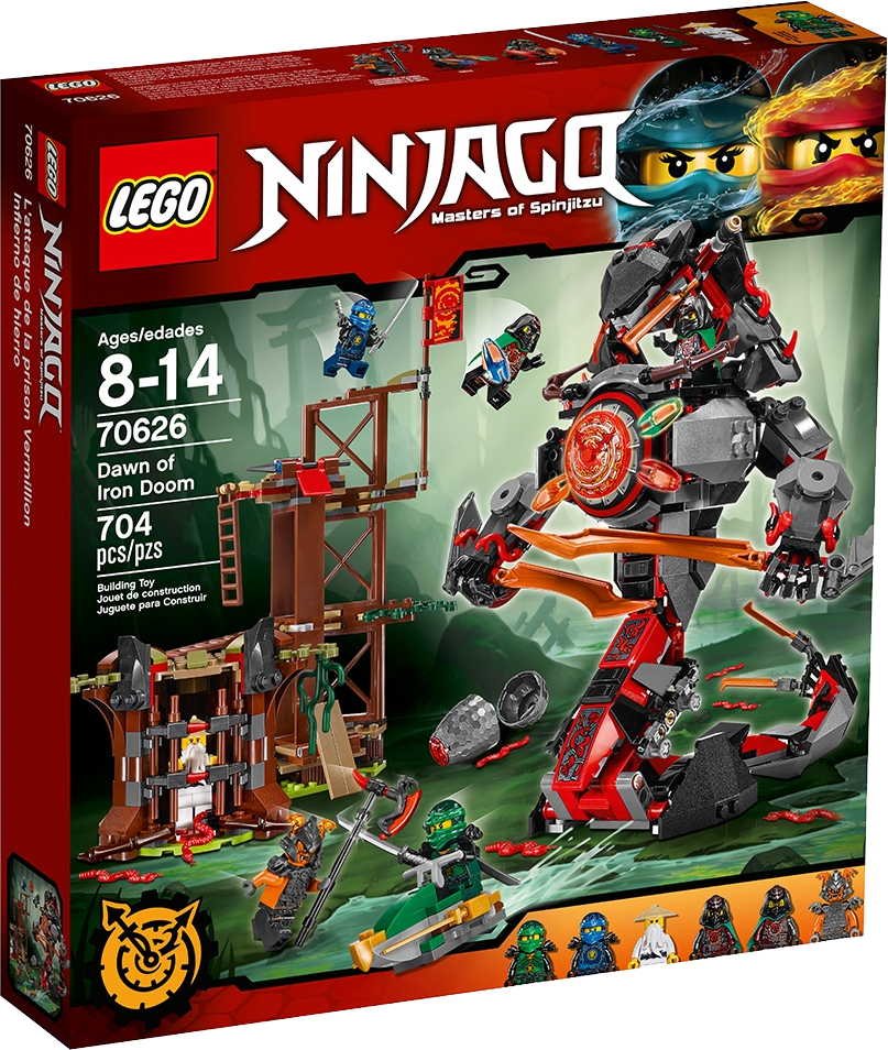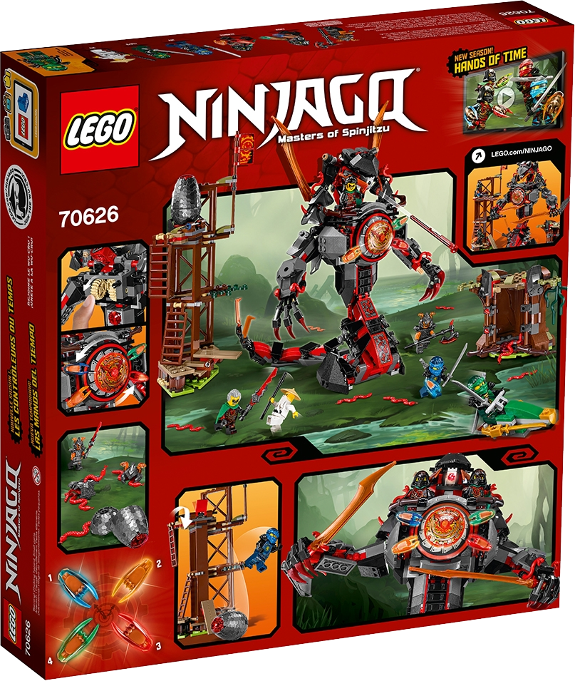 Join Lloyd and Jay’s mission to free Master Wu and stop the Time Twins taking control of time in this Dawn of Iron Doom set, which includes the highly posable Snake Mech with wheel-operated spinning Time Portal and plug-in points for the four included translucent-colored Time Blades, a missile-shooting eye and two big detachable blade weapons. The Vermillion swamp fort has an egg-drop function and opening prison, and can be built in different ways for alternative layouts. Includes six minifigures with assorted weapons to intensify the role-play battles. Includes six minifigures: Lloyd, Jay, Acronix, Krux, Commander Blunck and Master Wu. The Snake Mech features a dual minifigure cockpit, missile-shooting eye, posable head and arms, swishing tail, two big detachable blade weapons and spinning Time Portal with plug-in points for the four included translucent-colored Time Blades—Forward (green), Slow-Mo (blue), Pause (red) and Reversal (orange). Turn the wheel on the back of the mech to spin the Time Portal on the front. Detach the giantblades from the back of Snake Mech and place them in its hands. The swamp fort features a Vermillion egg, egg-drop function, an opening prison, and various decorative elements including a Vermillion flag, swamp reeds and snakes Clip the swamp fort together in alternative ways for different layouts. Weapons include Lloyd's two katanas, Jay's two katanas and Commander Blunck's Vermillion axe and Vermillion sword. Accessory elements include Acronix and Krux's Time Twin hoods and capes,Commander Blunck’s Vermillion helmet, plus six red snake elements. Recreate and role-play epic scenes from the NINJAGO®: Masters of Spinjitzu TV show. This set offers an age-appropriate build and play experience for ages 8+. Snake Mech stands over 9” (23cm) tall. Swamp fort measures over 7” (19cm) high, 7” (20cm) wide and 4” (11cm) deep.