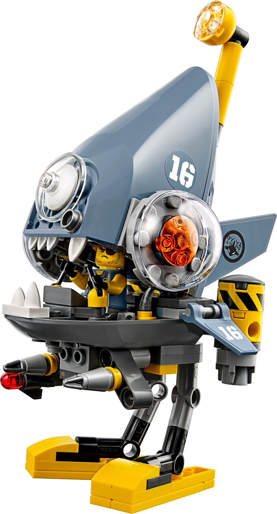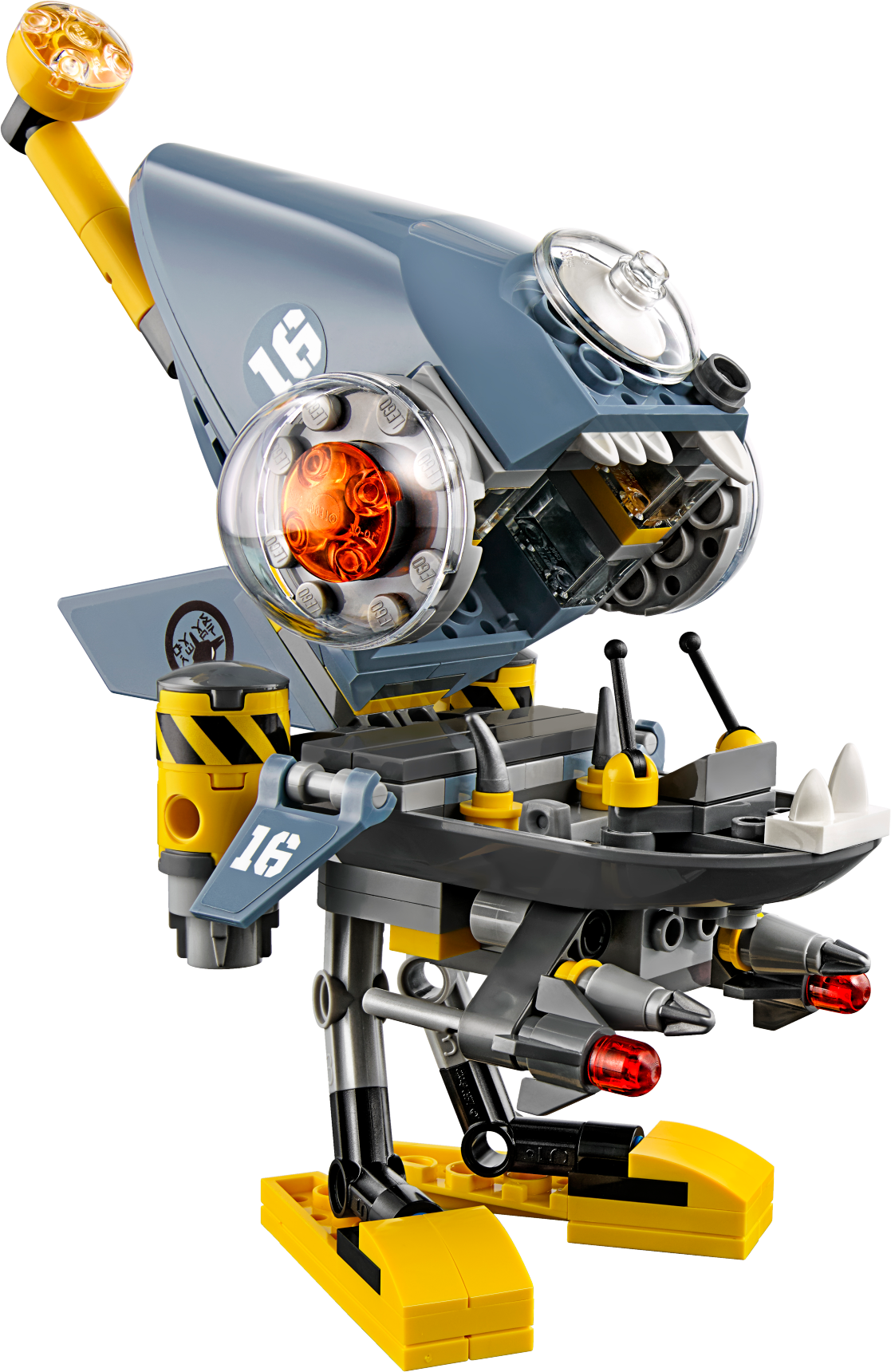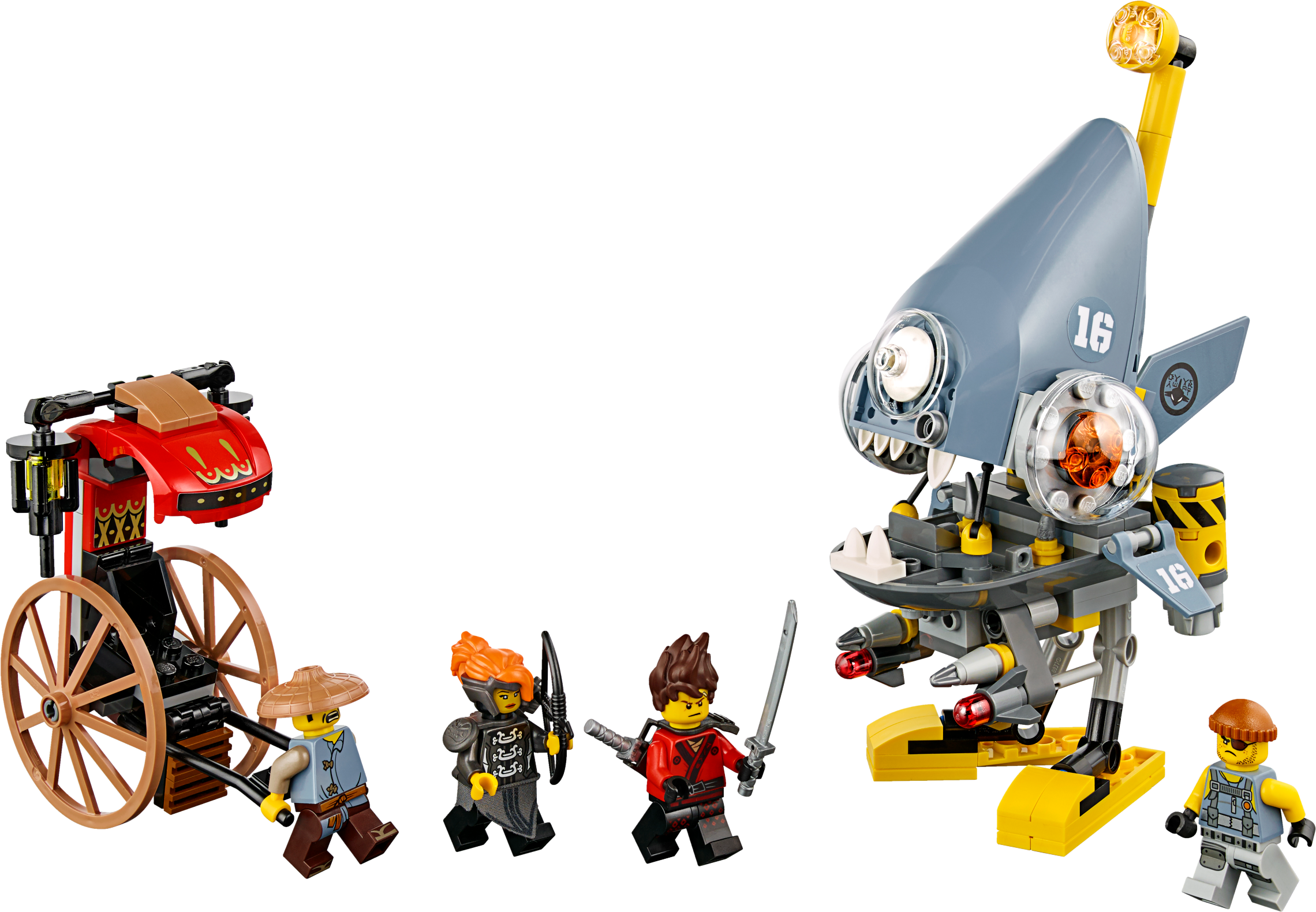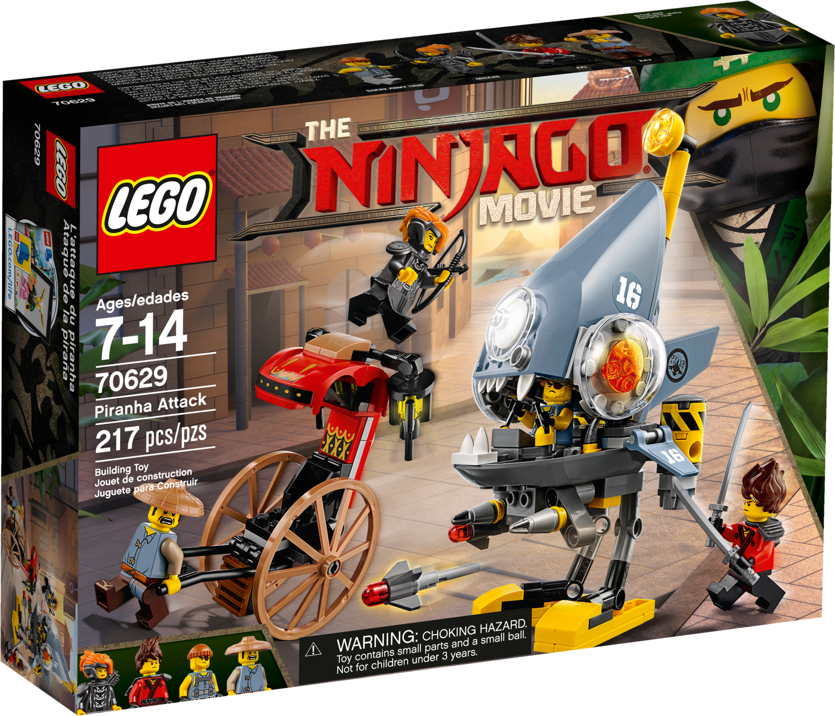 Play out an action-packed Piranha Mech pursuit of a rickshaw through NINJAGO® City with THE LEGO® NINJAGO MOVIE™ Piranha Attack set. The Piranha Mech features opening jaws with a minifigure cockpit inside, plus 2 flick missiles. This fun toy also includes 4 minifigures with assorted weapons to dial up the chase action. Includes 4 minifigures: Kai, Misako (in Iron Dragon costume), Shark Army Thug and Ray. Piranha Mech features opening jaws with a minifigure cockpit inside, 2 flick missiles, adjustable fins and a periscope. Rickshaw features a minifigure seat, large wheels and 2 lanterns. Weapons include Kai's 2 katanas and Misako's bow and arrow. Also includes Misako's quiver element. Recreate and role-play exciting THE LEGO® NINJAGO® MOVIE™ scenes. This fun toy is suitable for ages 7-14. Piranha Mech measures over 6” (17cm) high, 4” (11cm) long and 3” (9cm) wide. Rickshaw measures over 3” (10cm) high, 4” (11cm) long and 2” (7cm) wide.