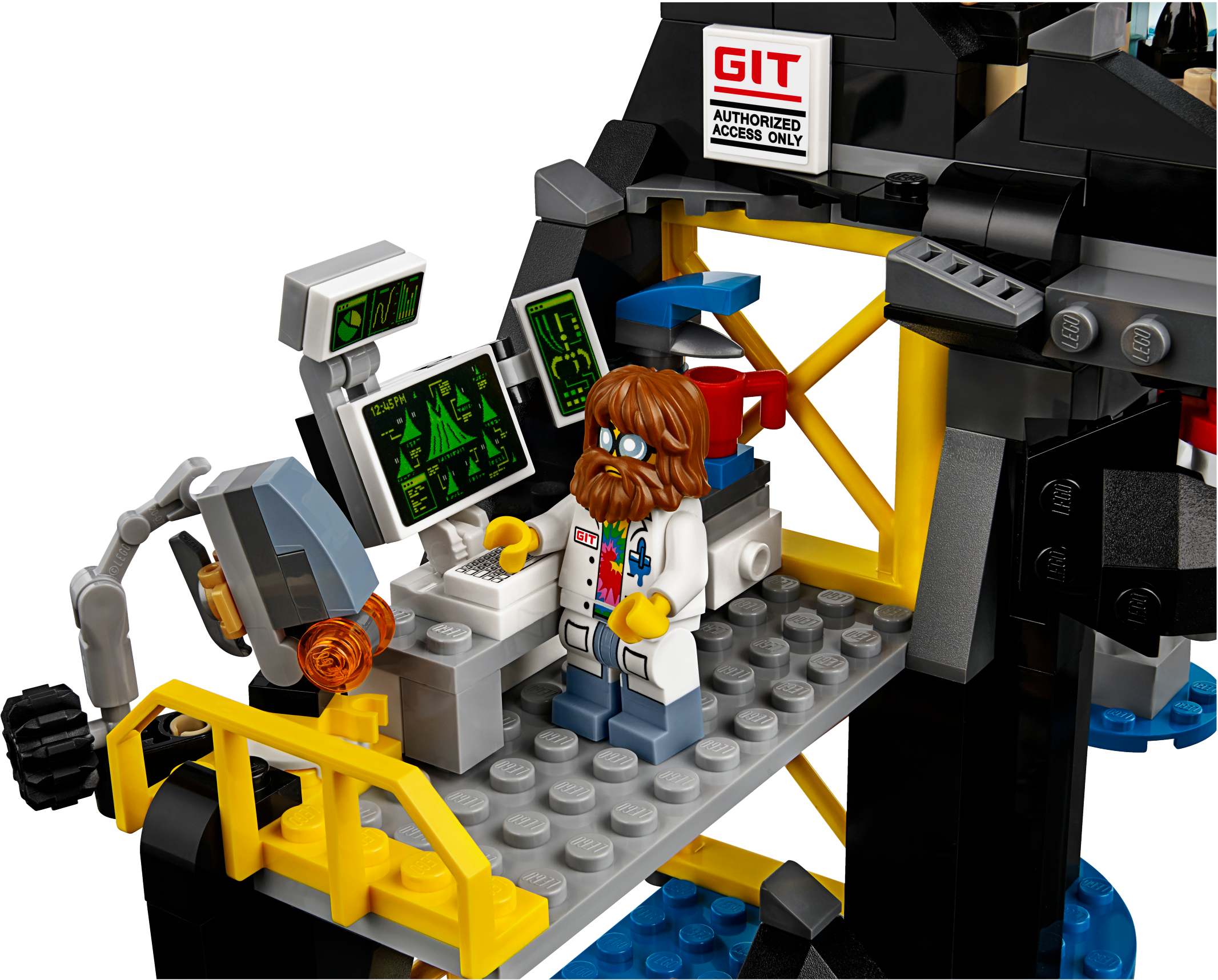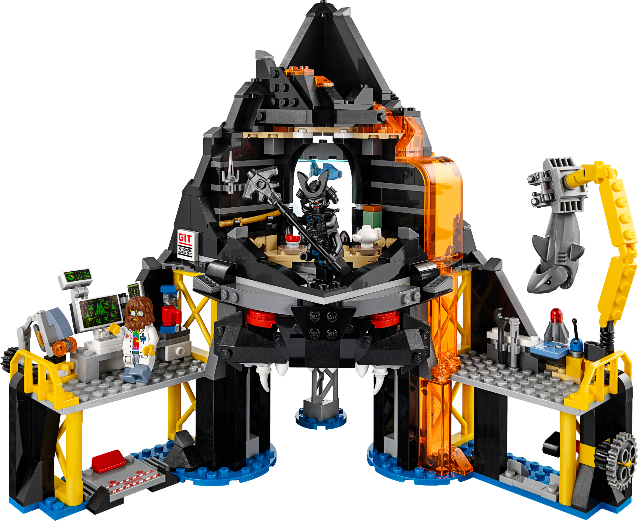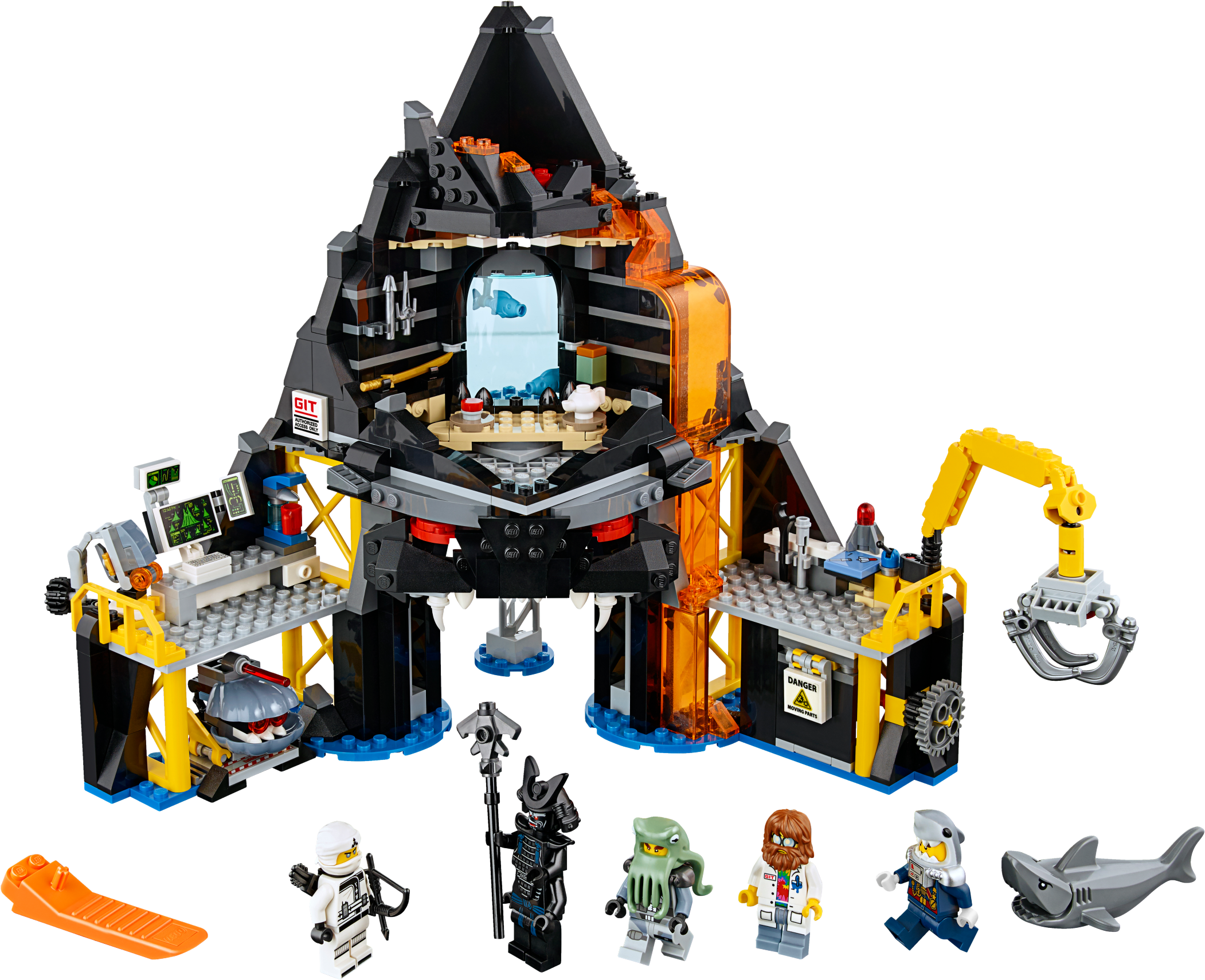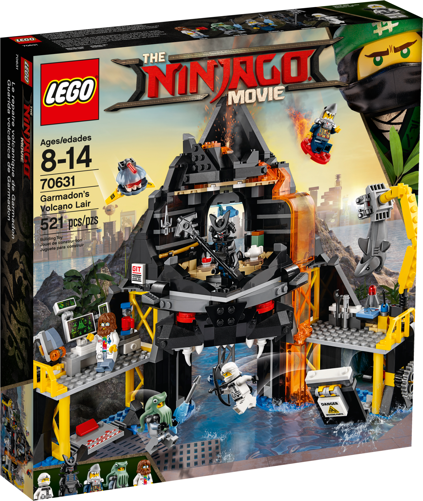 Join Zane’s mission to infiltrate evil Garmadon’s Volcano Lair and take on the shark army, with this exciting THE LEGO® NINJAGO® MOVIE™ set. The base includes a minifigure-launch function at the tip of the volcano, Garmadon’s throne room, computer lab with a mini piranha mech prototype, construction zone with an exploding wall function and rotating crane to lift the included shark figure, plus a drone launch pad. This building toy also includes 5 minifigures. Includes 5 minifigures: Garmadon, Zane, General #1, Steve and Four Eyes, plus a shark figure. Garmadon’s Volcano Lair features an entrance shaped like Garmadon’s face, minifigure-launch function at the tip of the volcano, Garmadon’s throne room, computer lab, construction zone, drone launchpad, translucent-orange lava elements and blue water-style baseplates. Garmadon's throne room features a big seat, teapot and pot elements, fish tank with 2 fish elements and a weapon rack with arrow and sai weapons. Use the fish elements to create a buildable shark army weapon. Computer lab features a computer keyboard and screen elements, mini piranha mech prototype and a coffee machine with cup element. Construction zone features a rotating crane to lift the shark figure, a wheel-operated exploding wall function and a flick missile. Also includes a drone launchpad and shell drone with foldout wings. Evade the shark's snapping jaws. Weapons include Garmadon's staff and katana, Zane’s bow and arrow, General #1’s fish sai and Four Eyes’ fish spear. Also includes Zane’s quiver element. General #1, Steve and Four Eyes minifigures are all new for December 2017. Recreate and role-play exciting THE LEGO® NINJAGO® MOVIE™ scenes. This building toy is suitable for ages 8-14. Measures over 10” (26cm) high, 12” (31cm) wide and 6” (16cm) deep.