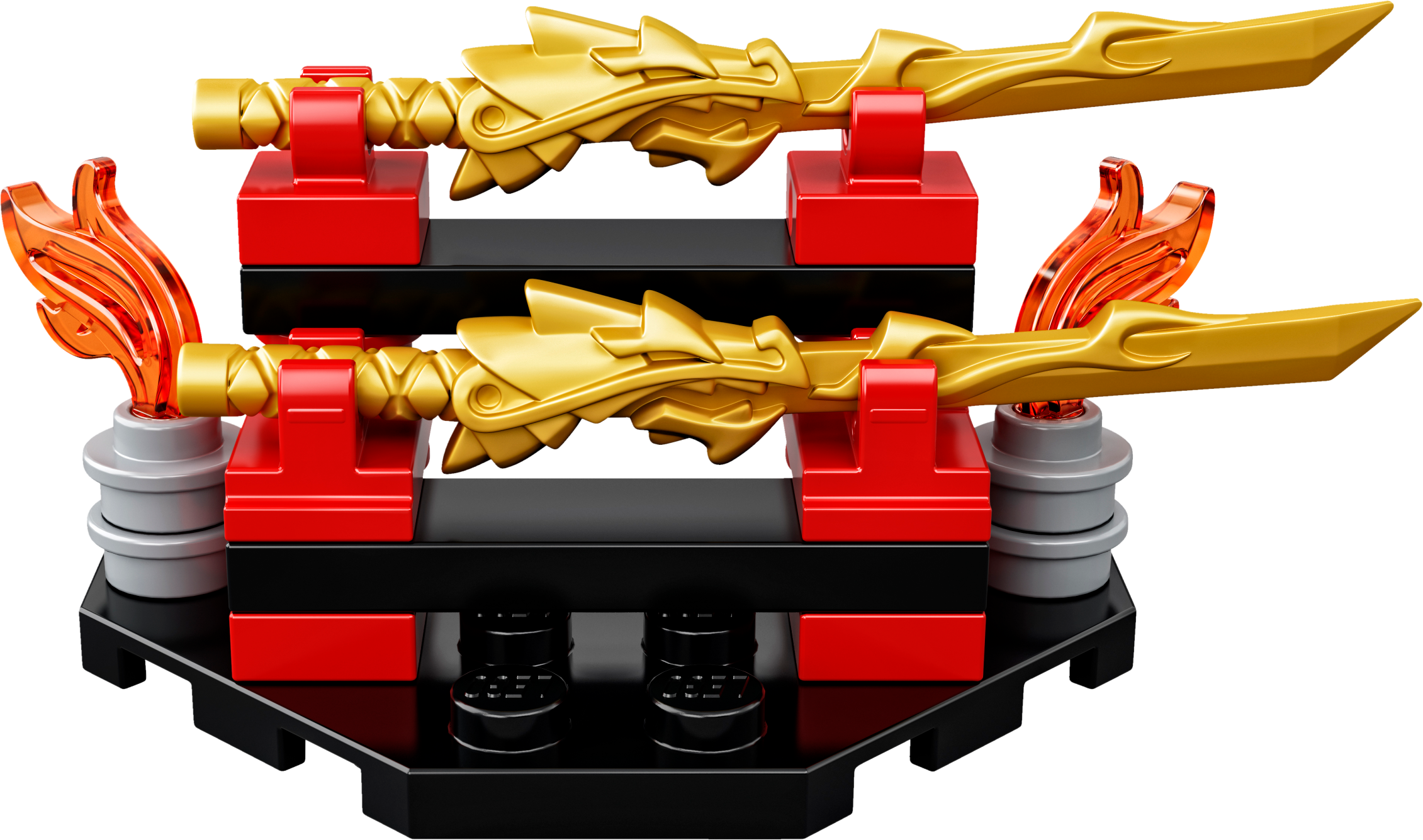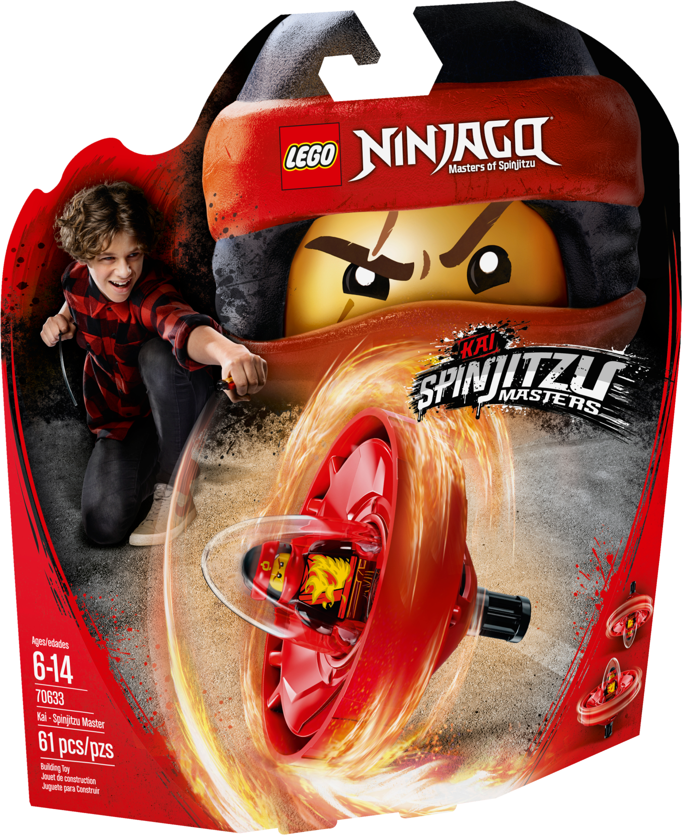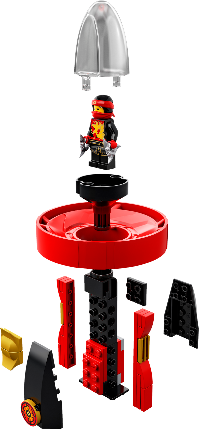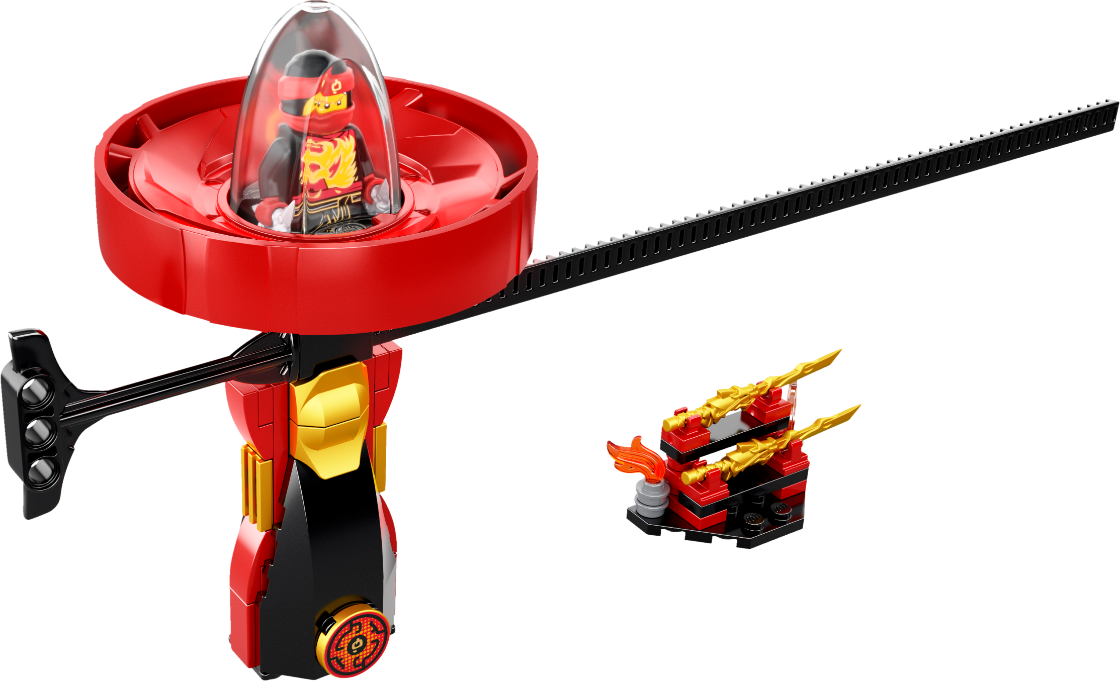 Features a Spinjitzu spinner with buildable LEGO® brick handle, spinner element with minifigure capsule and rip cord, weapon rack with 2 dragon swords, and Kai’s 2 shurikens.