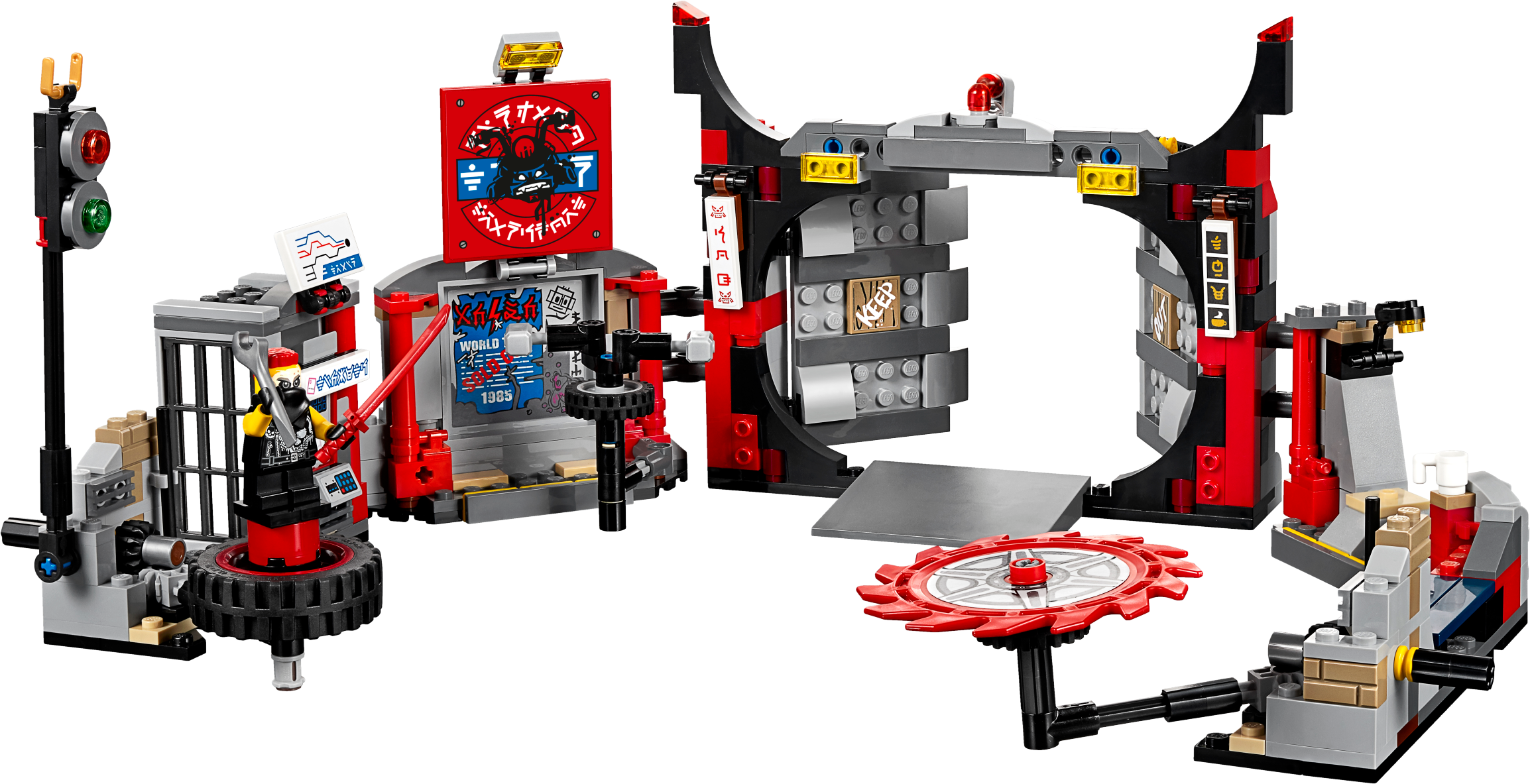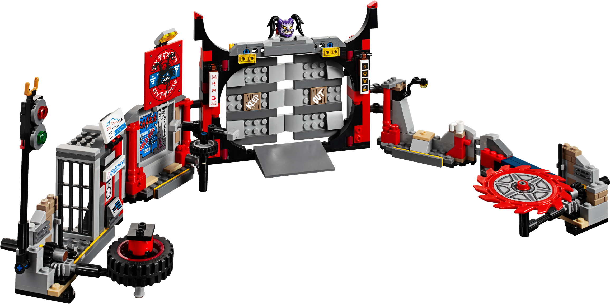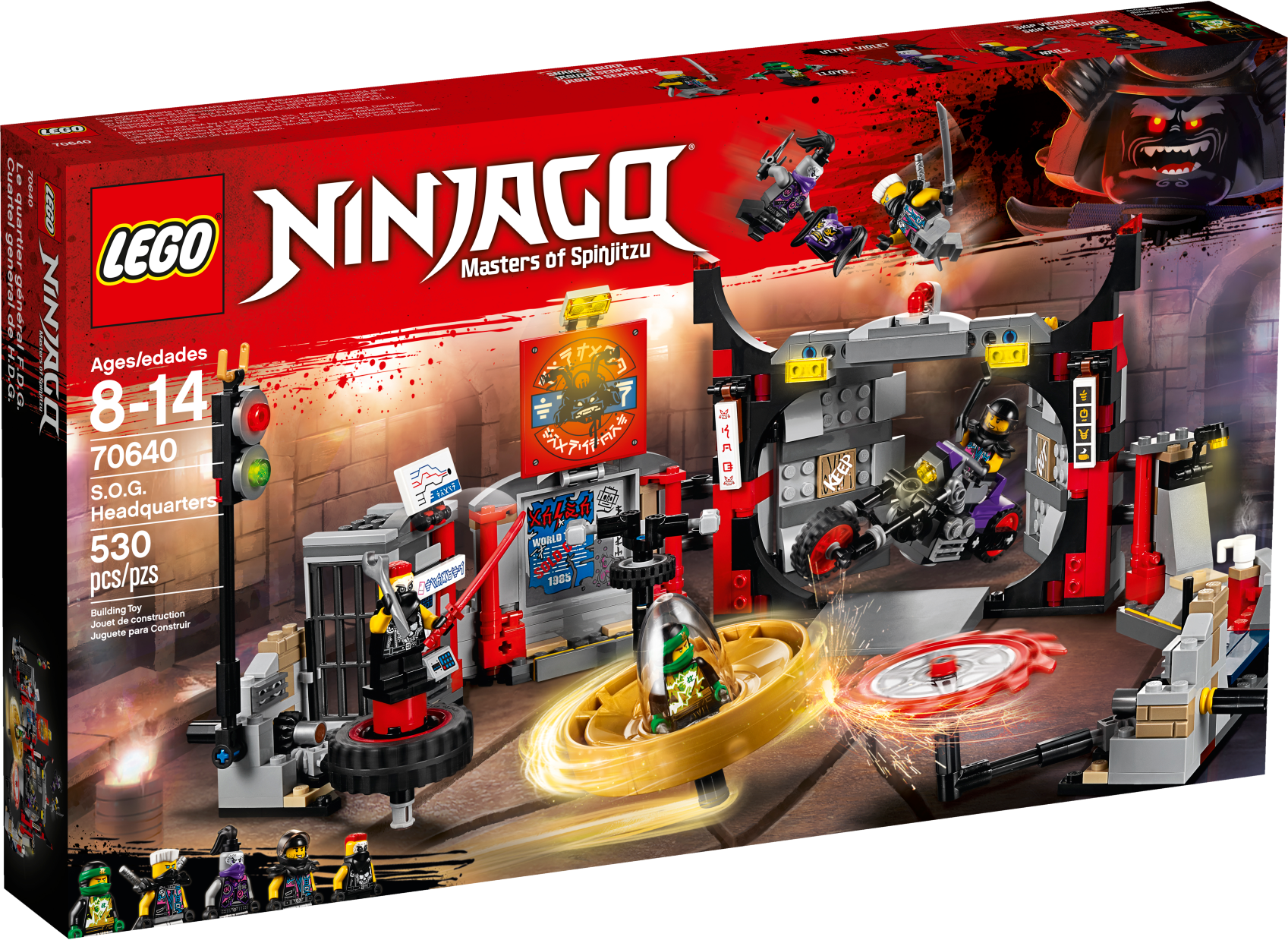 S.O.G. Headquarters features movable sides for action play, an explode-function entrance with the Oni Mask of Hatred element and a ramp, spinning blade, spinning wheel with an attachment point for a minifigure, spinning hammers, ATM, ‘Sons of Garmadon' sign element, and a bike workshop with an Oni Bike.