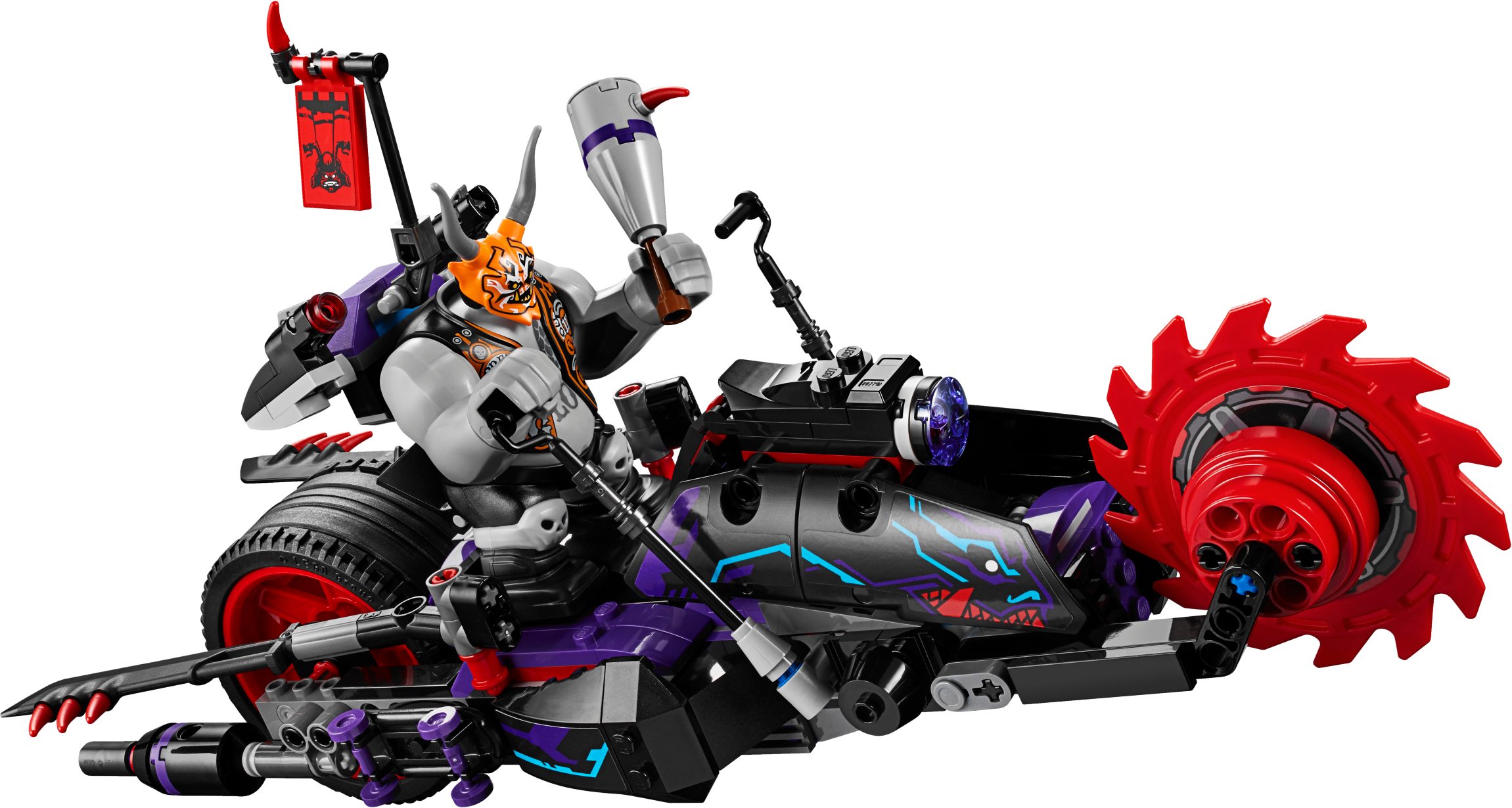 Oni Chopper features a driver’s seat for Killow, spinning front saw blade, 2 flip-out blades, 2 detachable skateboards and a storage compartment with a spiked baseball bat.