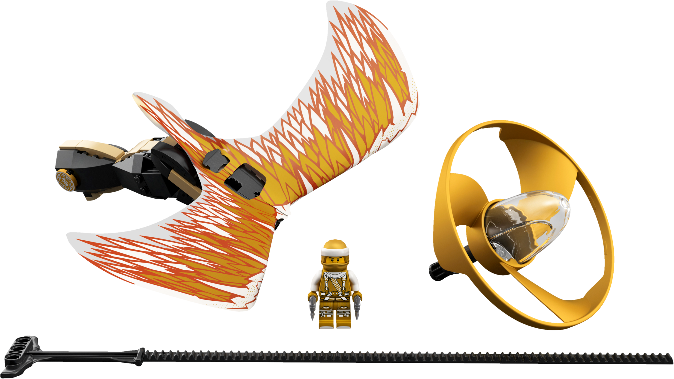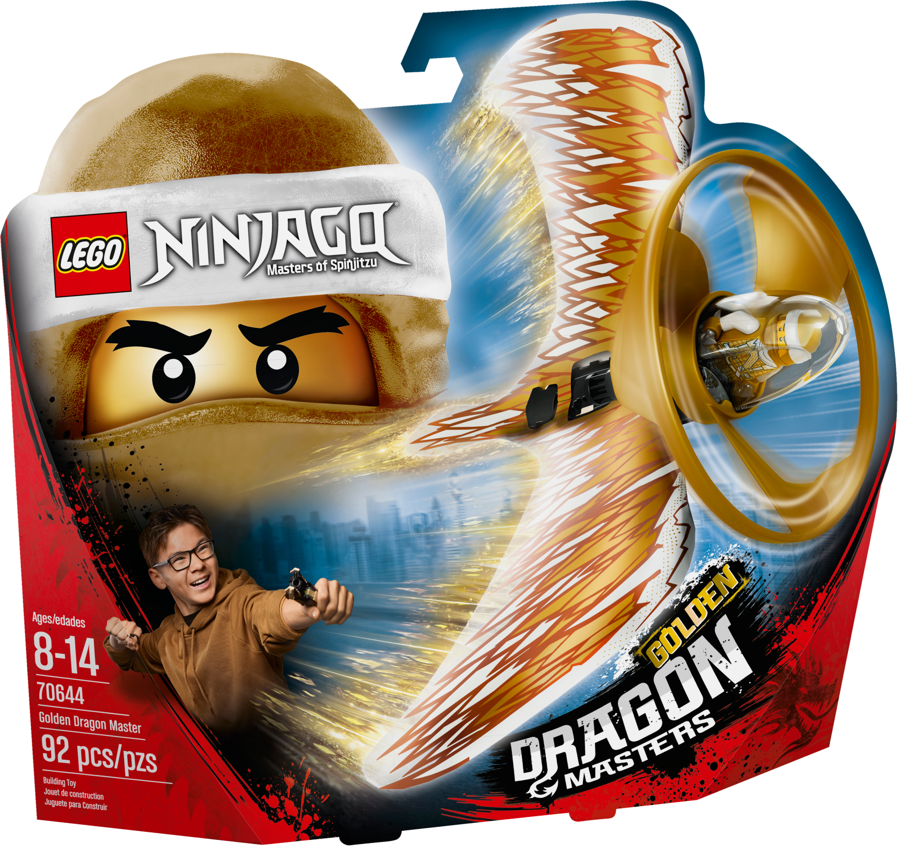 Learn the aerial skills of a true Dragon Master with the LEGO® NINJAGO® 70644 Golden Dragon Master flyer, featuring a buildable LEGO brick handle, minifigure capsule, blade element, dragon wings and rip cord. Perform solo tricks, compete against friends, and use your environment to create countless fun ninja challenges. This LEGO NINJAGO toy includes a Golden Master minifigure. Includes a Golden Master minifigure. Features a buildable LEGO® brick handle, minifigure capsule, blade element, foil dragon wings, rip cord, and a 2x2 round LEGO tile with Golden Master logo. Perform The Dragon Strike, The Dragon Flip, The Dragon Nest, The Eye of The Dragon, The Nosediving Dragon and other masterful moves. Compete against your friends in The Dragon Duel, Dragon Darts, The Flight of the Dragon, The Dragon Switch and The Dragon Hunter. Use your environment to create your own fantastic flyer challenges. Go online for even more Dragon Masters tricks and inspiring videos. Add 70645 Cole - Dragon Master, 70646 Jay - Dragon Master, 70647 Kai - Dragon Master and 70648 Zane - Dragon Master for even more aerial ninja action. Flyer (without rip cord) measures over 7” (19cm) high, 8” (22cm) wide and 6” (17cm) deep.