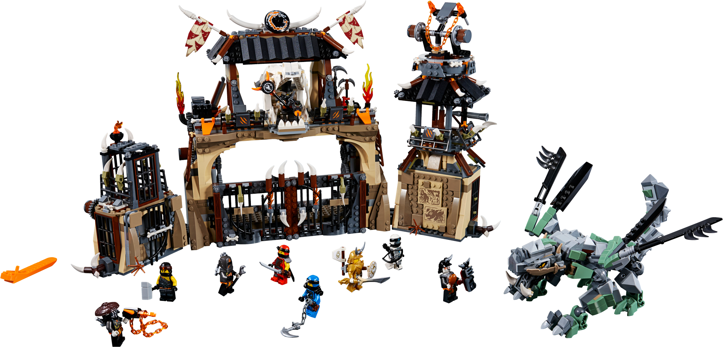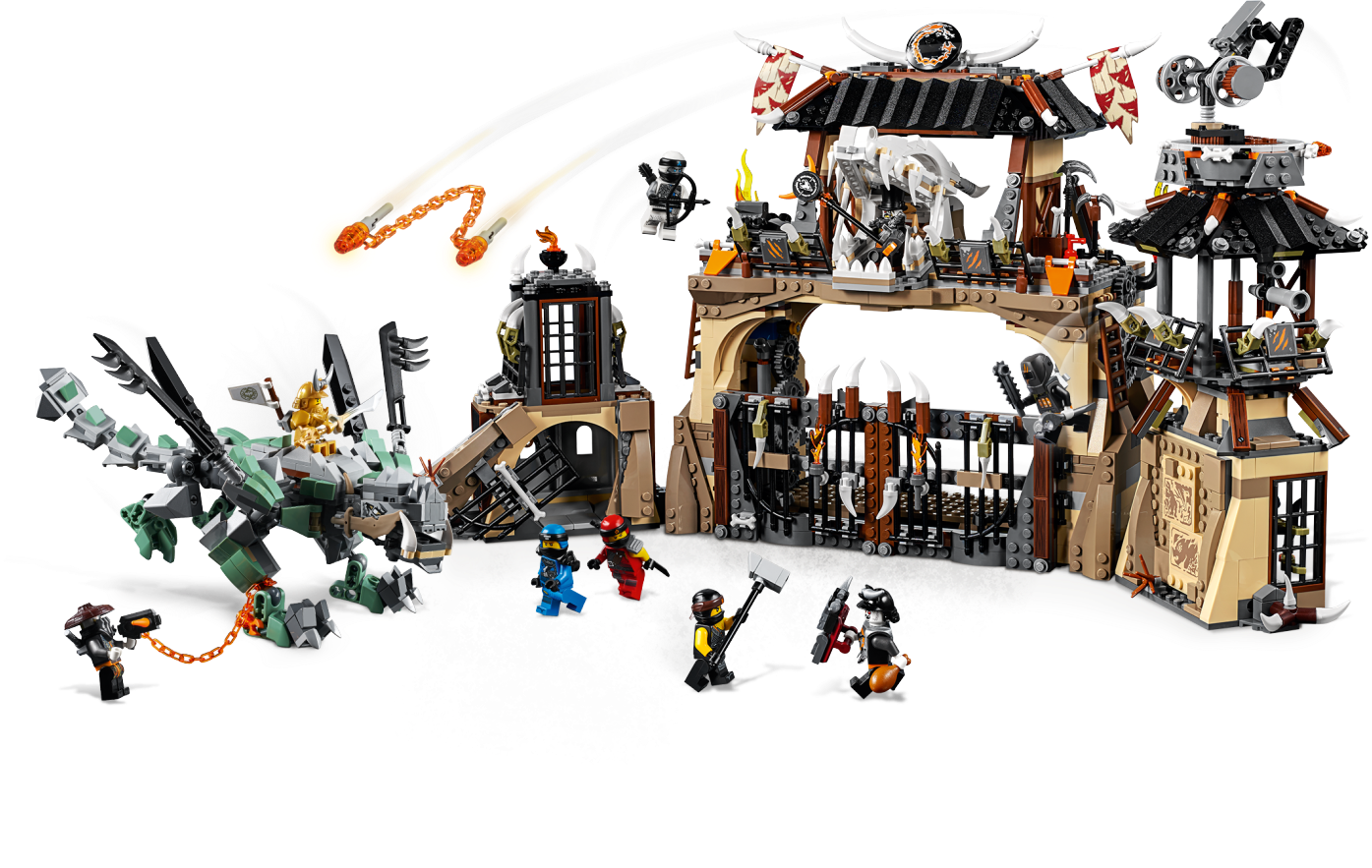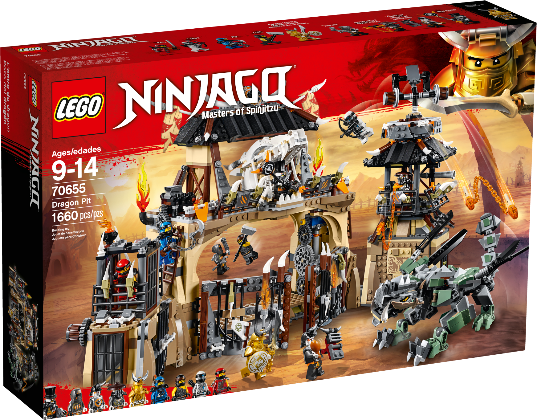 Join the ninja heroes in a battle against Iron Baron and the Dragon Hunters at the LEGO® NINJAGO® 70655 Dragon Pit, with 3 detachable sections for easy play. The viewing gallery features a throne for Iron Baron, weapon rack and a gate-opening function to let the posable Earth Dragon into the pit. There's also a watchtower with rooftop dual missile shooter, buildable telescope and a blacksmith's workshop, plus a jail with a trapdoor function to drop a minifigure into the pit. Fight for all 4 of the collectible Dragon Armor elements (worn in this set by Dragon Master) with 9 minifigures and their assorted weapons. Includes 9 LEGO® NINJAGO® minifigures: Dragon Master, Jay, Zane, Cole, Kai, Iron Baron, Arkade, Heavy Metal and Chew Toy. Dragon Pit features 3 detachable sections: a viewing gallery, watchtower and a jail. Viewing gallery features an arch with wheel-operated opening entrance gate, dragon-head-shaped throne for Iron Baron, weapon rack with a scythe and moon blade, plus decorative dragonbone and translucent flame-style elements. Watchtower has a rooftop dual missile shooter, buildable telescope on the second level, and a blacksmith’s workshop with a hammer and 2 swords. Jail features a cell with an opening dragonbone door and a trapdoor function to drop a minifigure into the dragon pit. Earth Dragon features posable jaws, neck, blade wings, legs, feet and hammer tail. Dragon Master comes with all 4 collectible Dragon Armor elements: the Dragon Helmet, Dragon Chestplate, Dragonbone Blade and Dragon Shield. Weapons include Jay's kusarigama and katana; Zane's bow & arrow; Cole’s hammer; Kai’s katana and buildable katana; Iron Baron’s staff, tanto and cyborg arm; Arkade’s wrench and saw blade; and Heavy Metal’s Vengestone Chain Rifle. Accessory elements include Zane’s quiver and Chew Toy’s shield. Recreate and role-play epic scenes from the NINJAGO® Masters of Spinjitzu TV show. Find more collectible Dragon Armor in 70650 Destiny's Wing, 70652 Stormbringer, 70653 Firstbourne and 70654 Dieselnaut. Dragon Pit measures over 10” (27cm) high, 20” (51cm) wide and 7” (20cm) deep. Dragon measures over 3” (9cm) high, 9” (25cm) long and 11” (28cm) wide.
