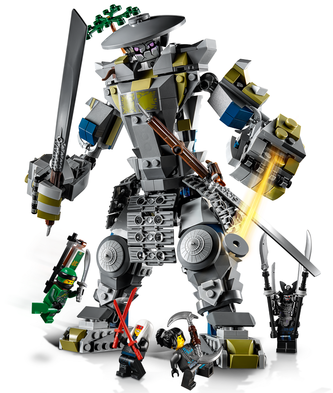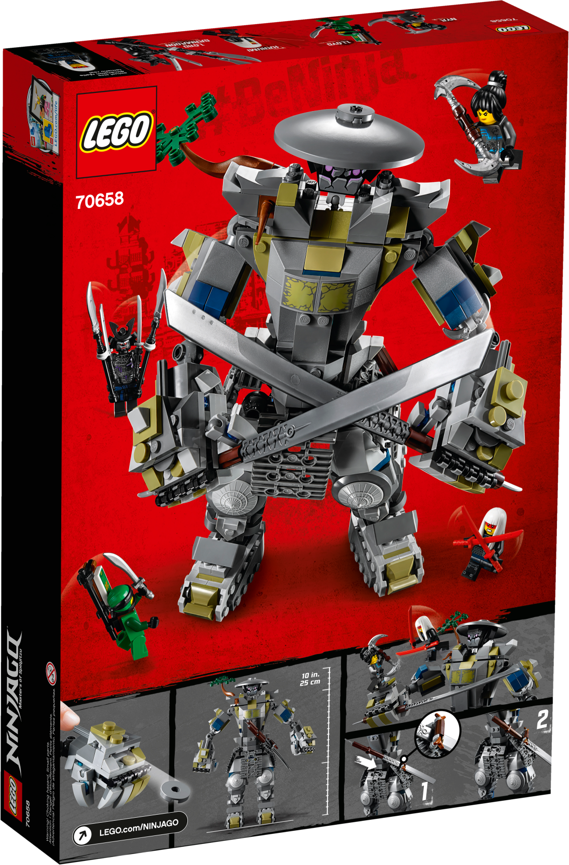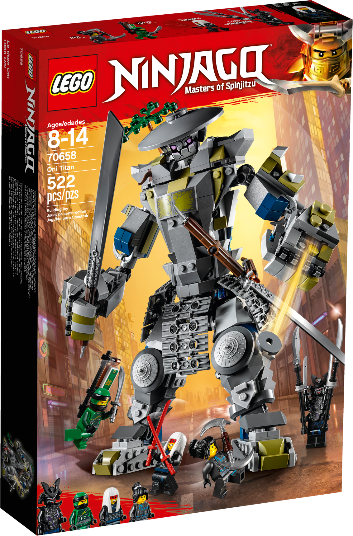 Help our ninja heroes rid NINJAGO® City of evil Lord Garmadon and the huge LEGO® NINJAGO 70658 Oni Titan. The highly posable Titan features disc shooters and huge katanas that it can grip in its hands. This set also includes 4 LEGO NINJAGO minifigures with assorted weapons—including Nya's double scythe and Lord Garmadon's buildable katanas—to inspire countless role-play battles. Includes 4 LEGO® NINJAGO® minifigures: Lloyd, Nya, Lord Garmadon and Harumi. Oni Titan features posable arms and legs, gripping hands, a disc shooter on each arm and a holster with 2 big katanas. Weapons include Lloyd’s sword, Nya’s double scythe, Lord Garmadon's 2 buildable katanas and 2 buildable spears, and Harumi's 2 katanas. Also includes Lloyd's buildable flag. Recreate and role-play epic ninja action scenes from the NINJAGO® Masters of Spinjitzu TV show. Measures over 9” (25cm) high, 2” (7cm) long and 7” (18cm) wide.