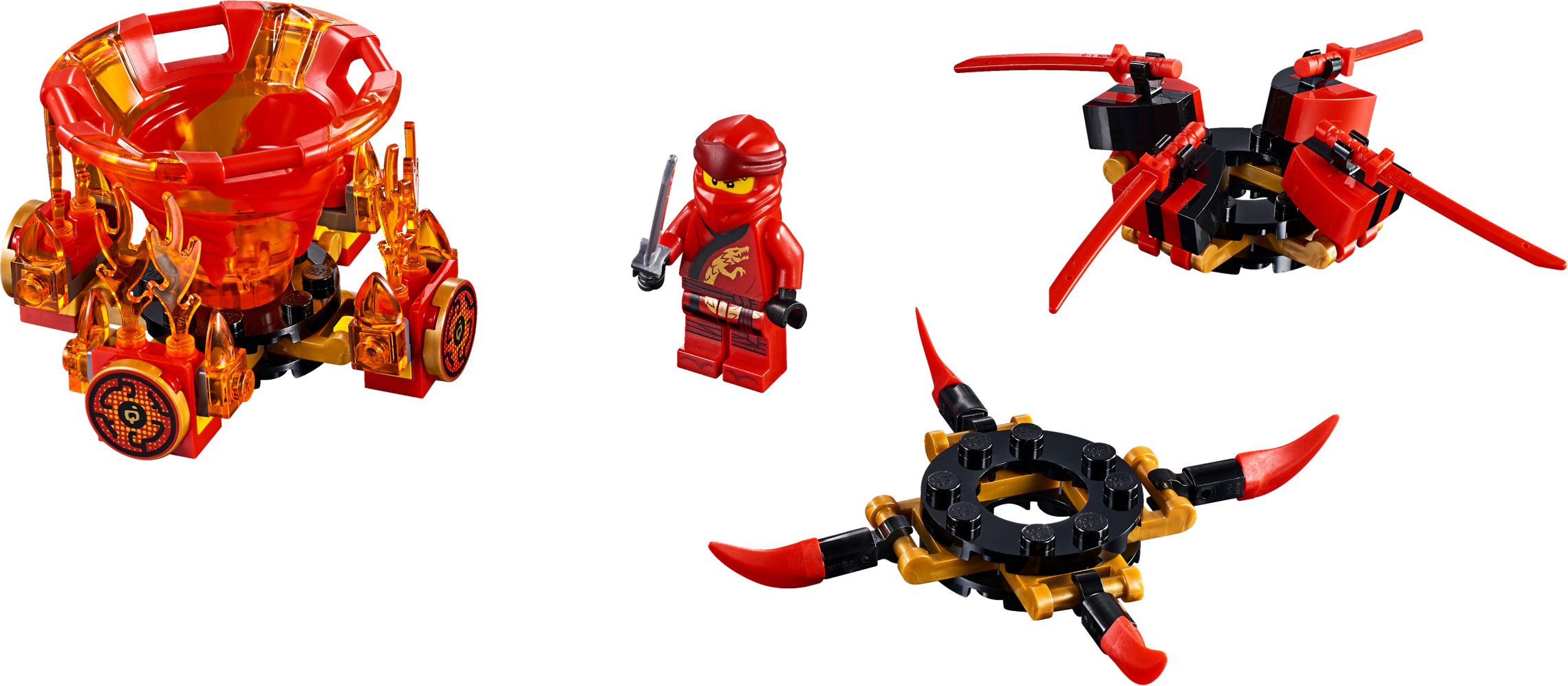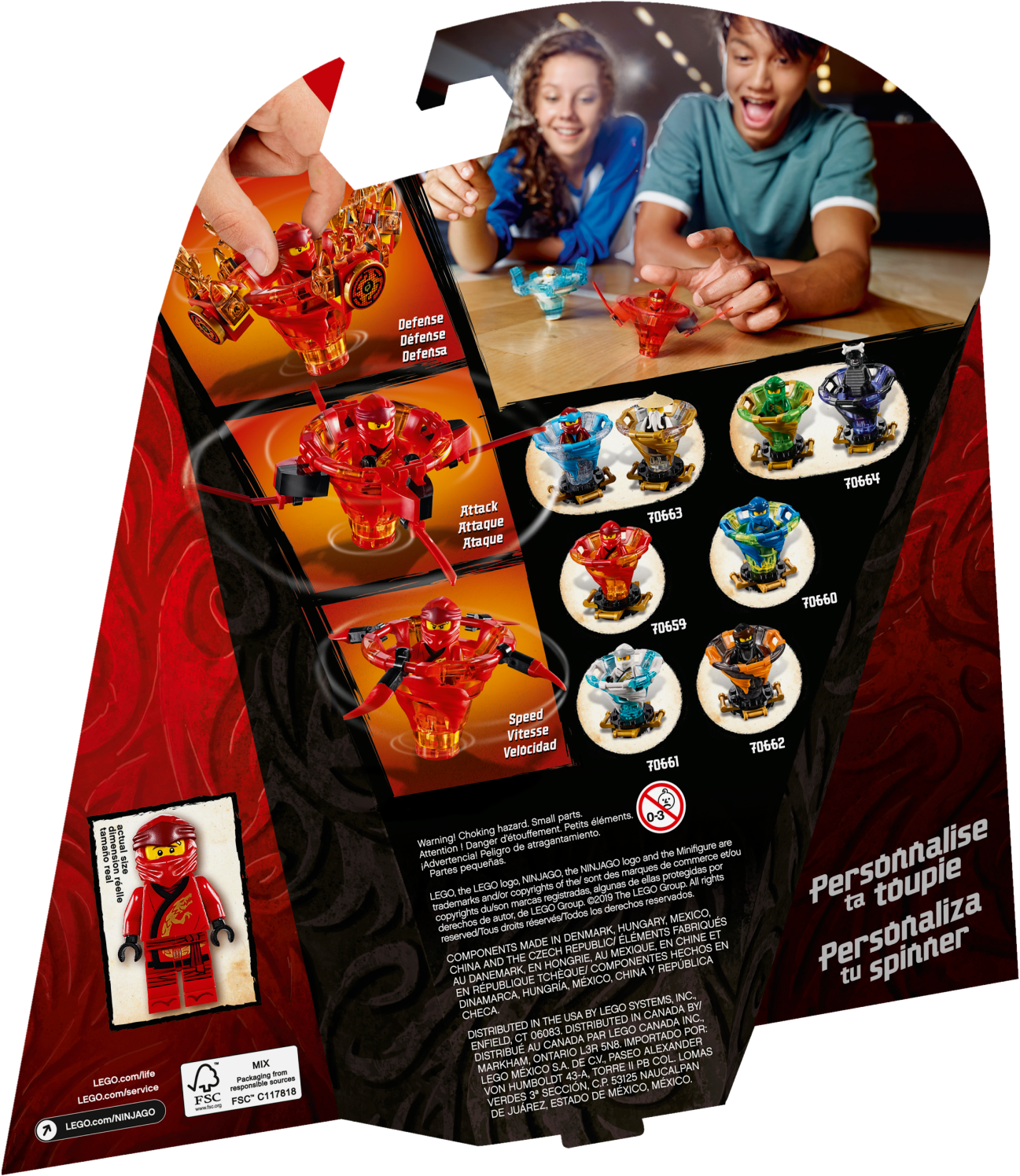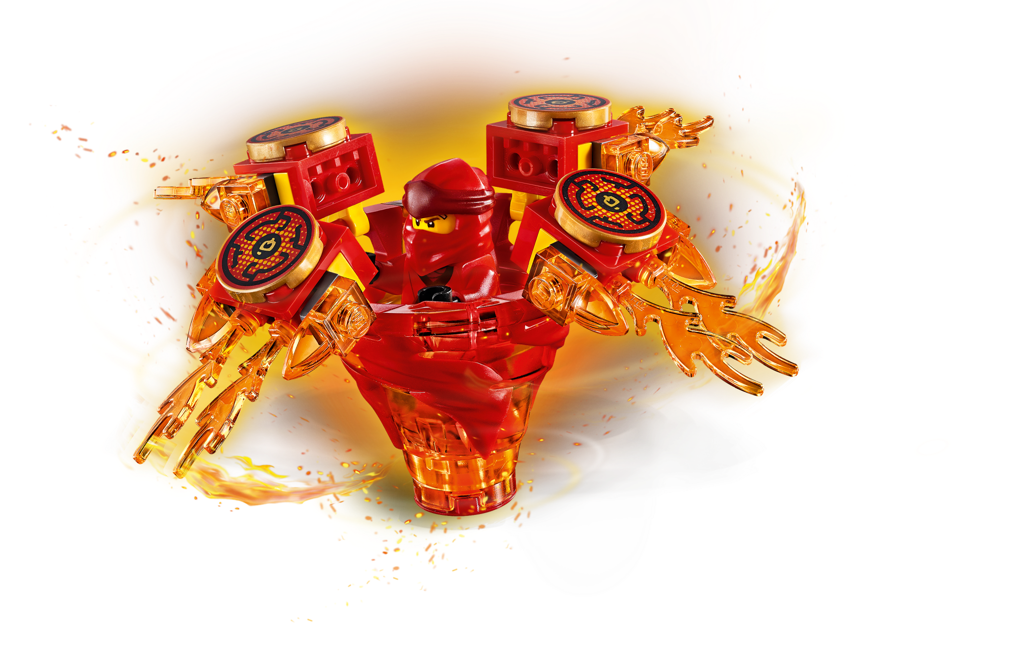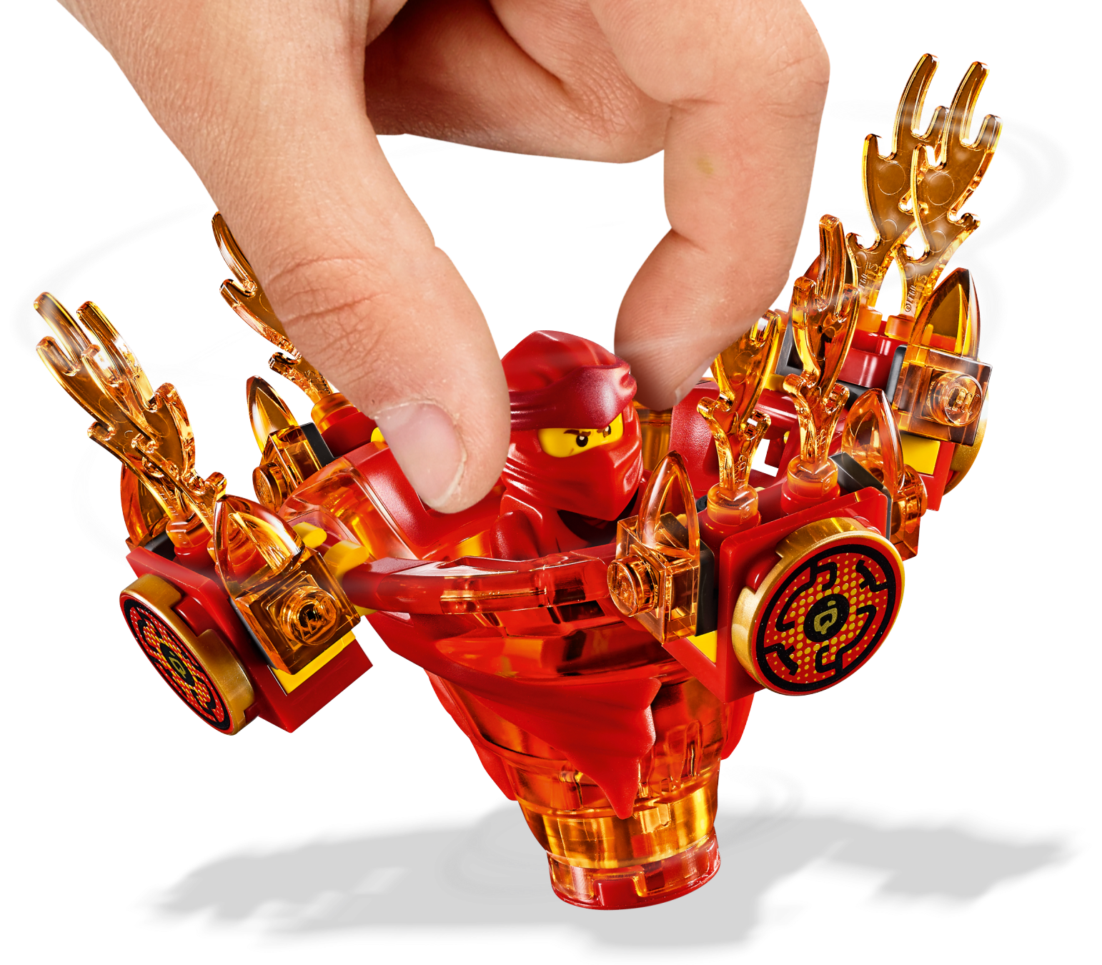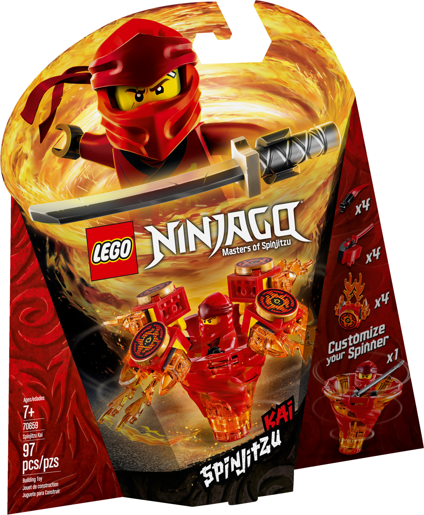 Master the art of Spinjitzu with 70659 Spinjitzu Kai LEGO® NINJAGO® spinner. This ninja toy features Kai’s NINJAGO Spinjitzu Tornado of Fire spinner with a new-for-January-2019 spinner element and 3 attachments for attack, defense and speed Spinjitzu modes. Experiment with different techniques, create your own challenges and compete against your friends—the possibilities are endless. This creative toy includes a Kai minifigure with a katana, plus 3 buildable display racks for attachment weapons and elements. Includes a LEGO® NINJAGO® Kai minifigure with a silver-colored katana. The LEGO® NINJAGO® Spinjitzu Kai Tornado of Fire spinner features a new-for-January-2019 spinner element and 3 different attachments for attack, defense and speed modes. Attack mode attachment features 4 fire katanas; defense mode attachment features 4 flame elements; speed mode attachment features 4 spikes. This LEGO® NINJAGO® Spinjitzu toy also includes 3 buildable display racks for attachment weapons and elements. Create your own ninja Spinjitzu challenges and compete against your friends. Combine with 70660 Spinjitzu Jay, 70661 Spinjitzu Zane, 70662 Spinjitzu Cole, 70663 Spinjitzu Nya & Wu and 70664 Spinjitzu Lloyd vs. Garmadon LEGO® NINJAGO® toys for thrilling LEGO Spinjitzu showdowns. Recreate the ninja tornado effect as seen on the NINJAGO® Masters of Spinjitzu TV show with this action-packed LEGO® NINJAGO set. Tornado of Fire spinner (without attachments) measures over 1” (4cm) high, 1” (5cm) long and 1” (5cm) wide.