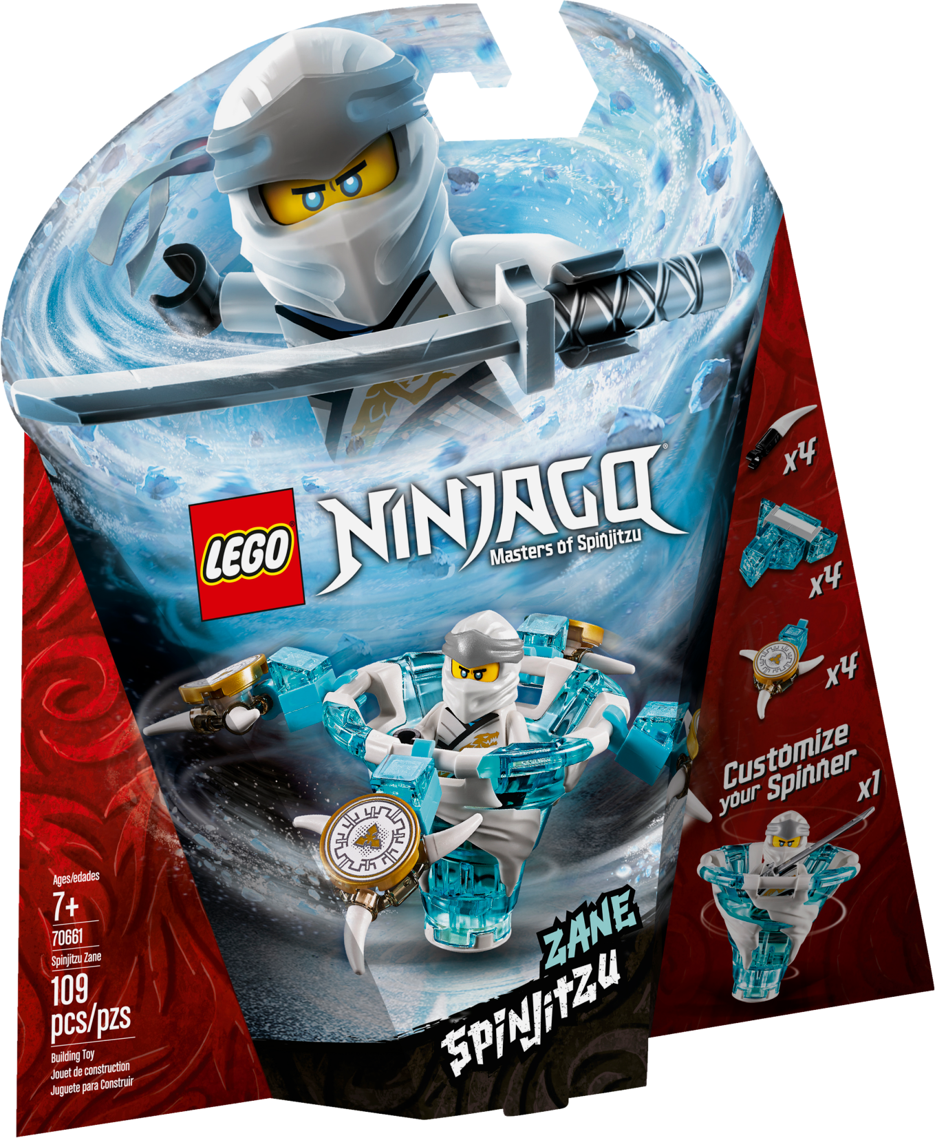 Display cool ninja skills with LEGO® NINJAGO® 70661 Spinjitzu Zane. This ninja toy features Zane’s Spinjitzu Tornado of Ice spinner with a new-for-January-2019 LEGO NINJAGO spinner element and 3 attachments for attack, defense and speed modes. Experiment with different techniques, create your own challenges and compete against your friends—the possibilities are endless. This creative building toy includes a Zane minifigure with a katana, plus 3 buildable display racks for attachment weapons and elements. Includes a LEGO® NINJAGO® Zane minifigure with a silver-colored katana. Zane’s Spinjitzu Tornado of Ice spinner features a new-for-January-2019 spinner element and 3 different attachments for attack, defense and speed modes. Attack mode attachment features 4 ice shurikens; defense mode attachment features 4 ice elements; speed mode attachment features 4 spikes. This LEGO® NINJAGO® toy also includes 3 buildable display racks for attachment weapons and elements. Create your own ninja Spinjitzu challenges and compete against your friends with this creative toy building set. Combine LEGO® NINJAGO® Spinjitzu Zane with 70659 Spinjitzu Kai, 70660 Spinjitzu Jay, 70662 Spinjitzu Cole, 70663 Spinjitzu Nya & Wu and 70664 Spinjitzu Lloyd vs. Garmadon LEGO NINJAGO sets for thrilling Spinjitzu showdowns. Recreate the ninja tornado effect as seen on the NINJAGO® Masters of Spinjitzu TV show with this action-packed construction toy. Tornado of Ice spinner (without attachments) measures over 1” (4cm) high, 1” (5cm) long and 1” (5cm) wide.