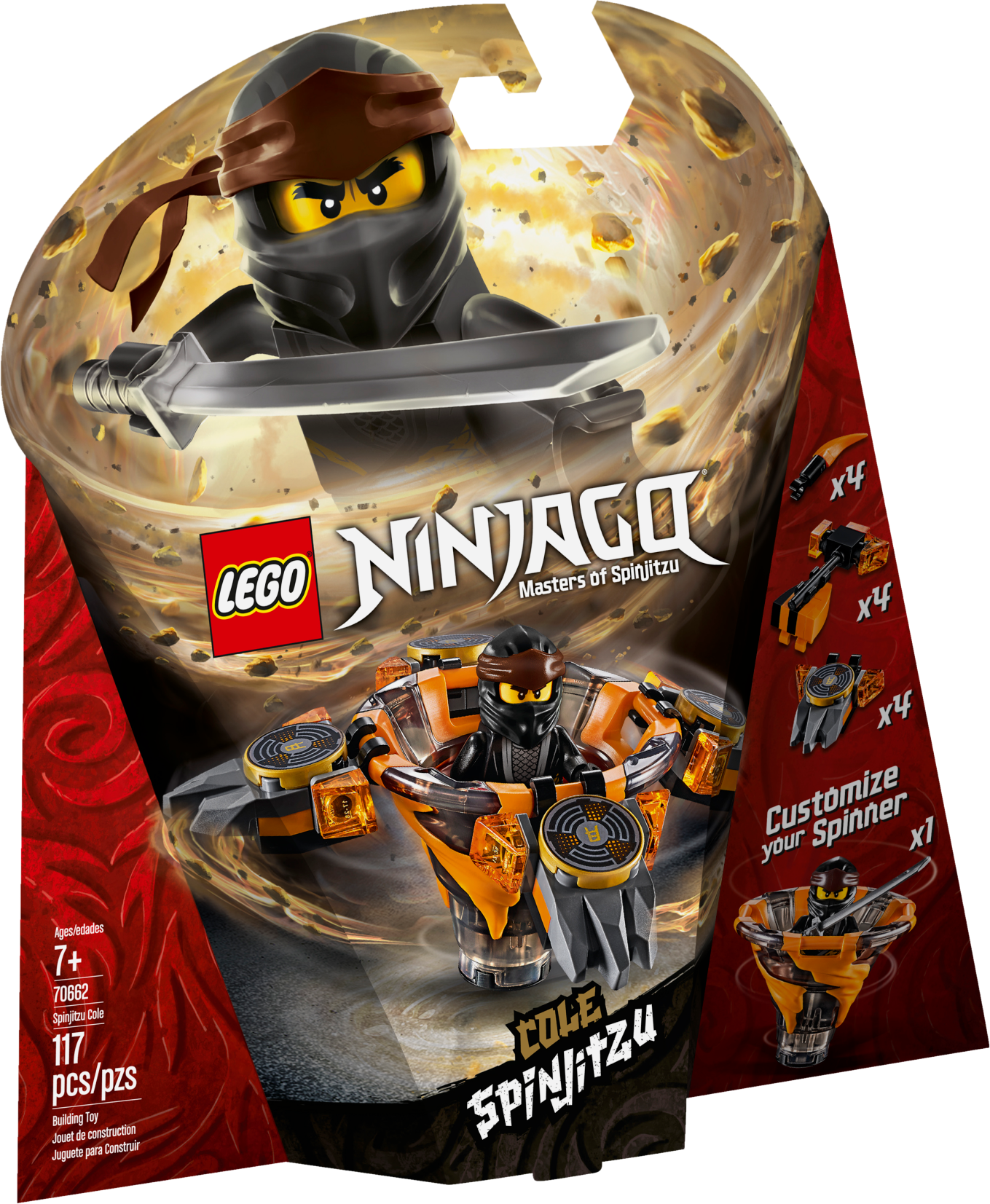 Create earth-shaking ninja tricks with LEGO® NINJAGO® 70662 Spinjitzu Cole! This awesome ninja toy features Cole’s Spinjitzu Tornado of Earth spinner with a new-for-January-2019 LEGO NINJAGO spinner element and 3 attachments for attack, defense and speed modes. Experiment with different techniques, create your own challenges and compete against your friends—the possibilities are endless. This creative toy building set includes a Cole minifigure with a katana, plus 3 buildable display racks for attachment weapons and elements. Includes a LEGO® NINJAGO® Cole minifigure with a silver-colored katana. Cole’s Spinjitzu Tornado of Earth spinner building toy features a new-for-January-2019 spinner element and 3 different attachments for attack, defense and speed modes. Attack mode attachment features 4 Earth Hammers; defense mode attachment features 4 earth elements; speed mode attachment features 4 spikes. This LEGO® NINJAGO® toy also includes 3 buildable display racks for attachment weapons and elements. Create your own ninja Spinjitzu challenges and compete against your friends with this action-packed LEGO® NINJAGO® set. Combine LEGO® NINJAGO® Spinjitzu Cole with 70659 Spinjitzu Kai, 70660 Spinjitzu Jay, 70661 Spinjitzu Zane, 70663 Spinjitzu Nya & Wu and 70664 Spinjitzu Lloyd vs. Garmadon LEGO NINJAGO toys for thrilling LEGO Spinjitzu showdowns. Recreate the ninja tornado effect as seen on the NINJAGO® Masters of Spinjitzu TV show with this creative toy building set. Tornado spinner (without attachments) measures over 1” (4cm) high, 1” (5cm) long and 1” (5cm) wide.