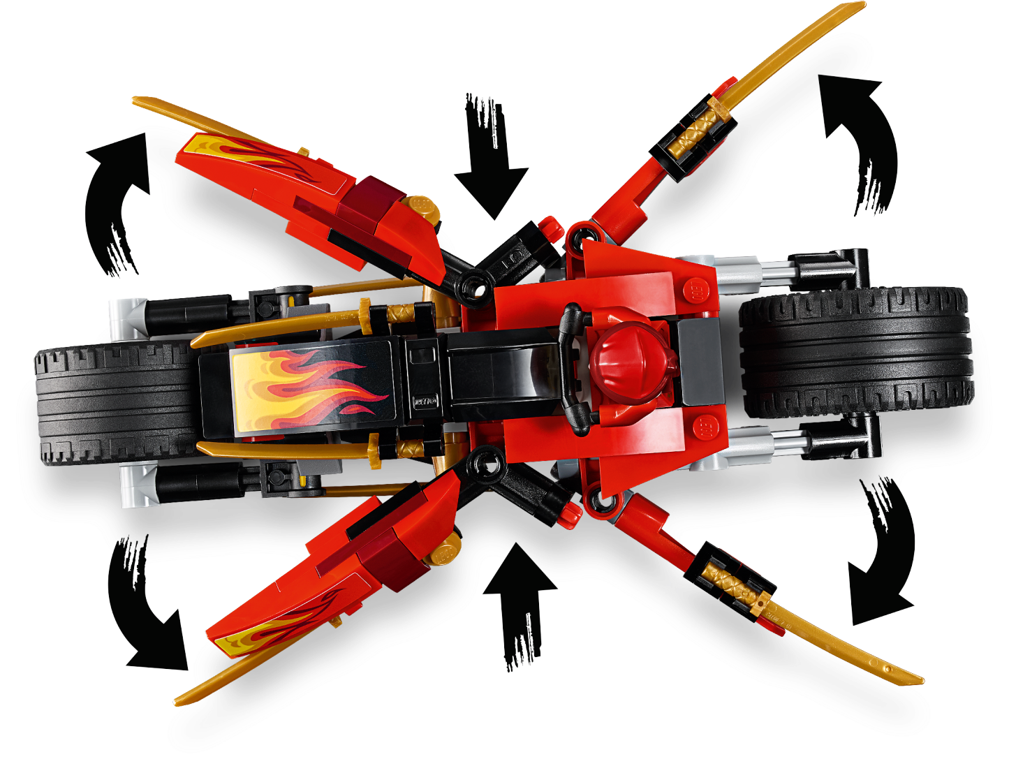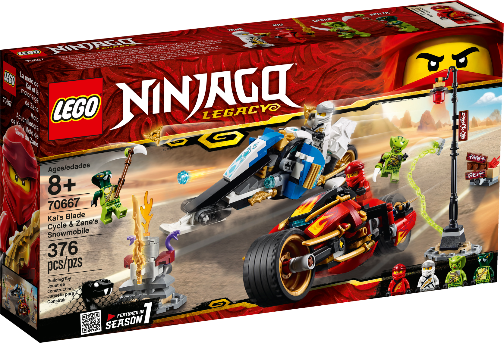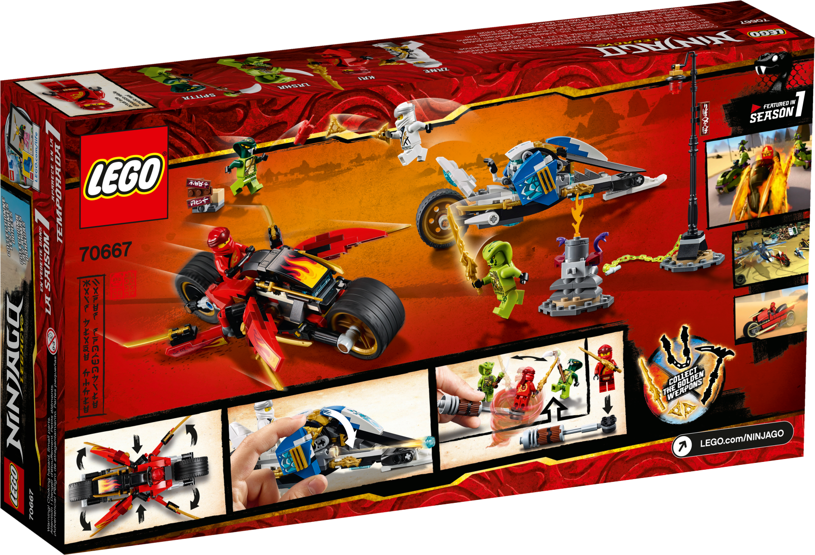 Power into battle with the LEGO® NINJAGO® Legacy 70667 Kai’s Blade Cycle & Zane’s Snowmobile and recover the stolen Sword of Fire from the Serpentine snakes. Ninja of Fire Kai’s bike features foldout blades and big wheels while Zane’s Elemental Snowmobile has 2 stud shooters and Zane's Golden Weapon—The Shurikens of Ice. These NINJAGO ninja vehicles come with a buildable dynamite ambush scene, another collectible Golden Weapon—The Sword of Fire—with a brick-built stand, and a Spinjitzu battle platform. This ninja toy also includes 4 minifigures to role-play and reimagine classic ninja battles from Season 1 of the NINJAGO Masters of Spinjitzu TV show. Includes 4 LEGO® NINJAGO® minifigures: Kai, Zane, Lasha and Spitta. Kai’s Blade Cycle features a minifigure seat, foldout gold-colored blades and big wheels with rubber tires. Zane’s Elemental Snowmobile features a minifigure seat, 2 stud shooters and Zane's Golden Weapon—The Shurikens of Ice. Ambush scene features a buildable lamppost with lantern element and a sign, a buildable box of dynamite and a chain. This LEGO® NINJAGO® toy includes Kai's Golden Weapon—The Sword of Fire—with a buildable stand and a Spinjitzu battle platform. Place a minifigure on the battle platform and turn the stick to make the platform rotate and recreate the LEGO® NINJAGO® ninja’s ‘tornado’ fighting style. Weapons include Lasha’s short Serpentine dagger and Spitta's long Serpentine dagger. Find more collectible Golden Weapons in the 70668 Jay's Storm Fighter, 70669 Cole's Earth Driller and 70670 Monastery of Spinjitzu LEGO® NINJAGO® sets. The LEGO® NINJAGO® Legacy range features new versions of popular ninja playsets from past seasons to recreate or reimagine iconic conflicts from the NINJAGO Masters of Spinjitzu TV show. Kai’s Blade Cycle measures over 1” (5cm) high, 6” (17cm) long and 2” (7cm) wide. Zane’s Elemental Snowmobile measures over 1” (5cm) high, 7” (18cm) long and 2” (6cm) wide.