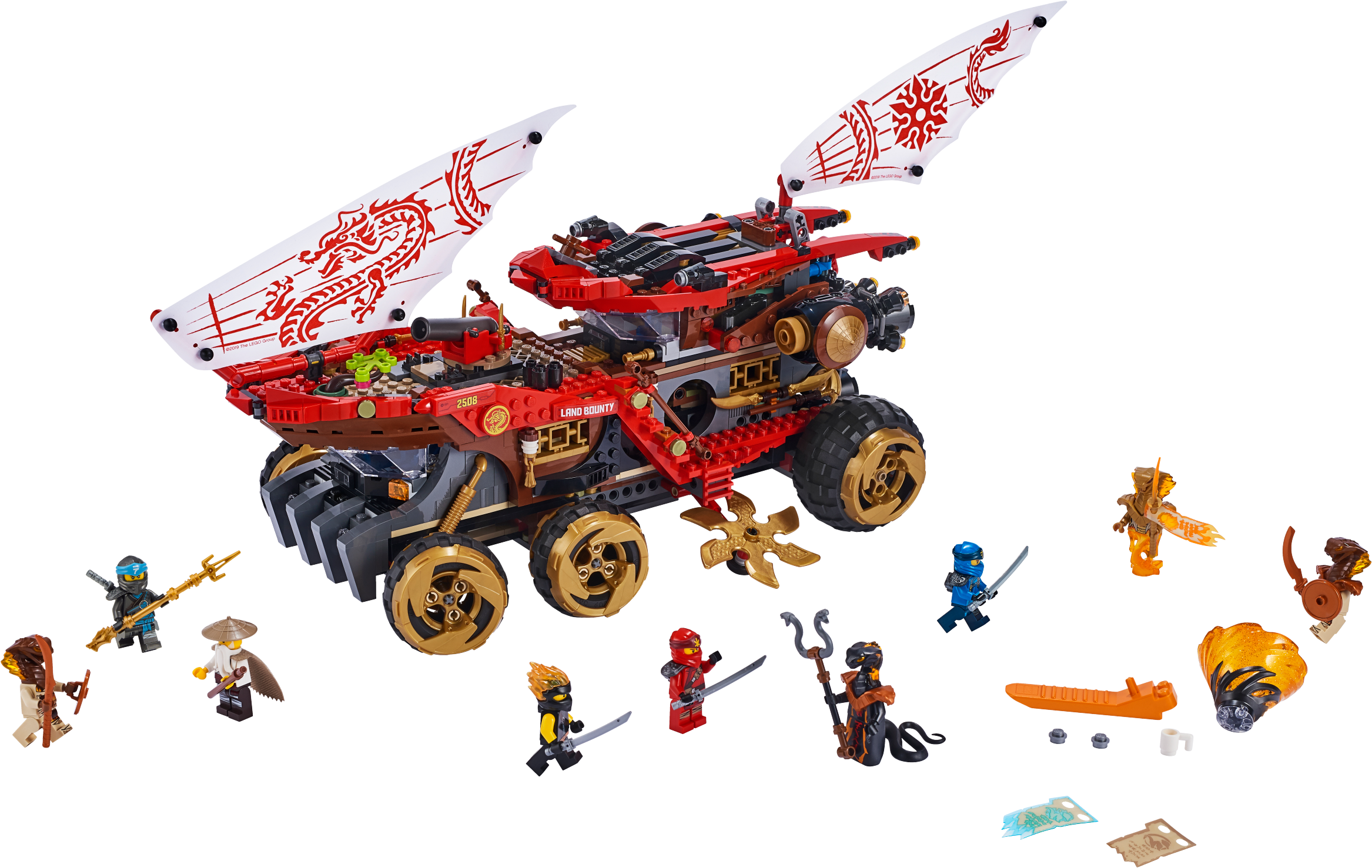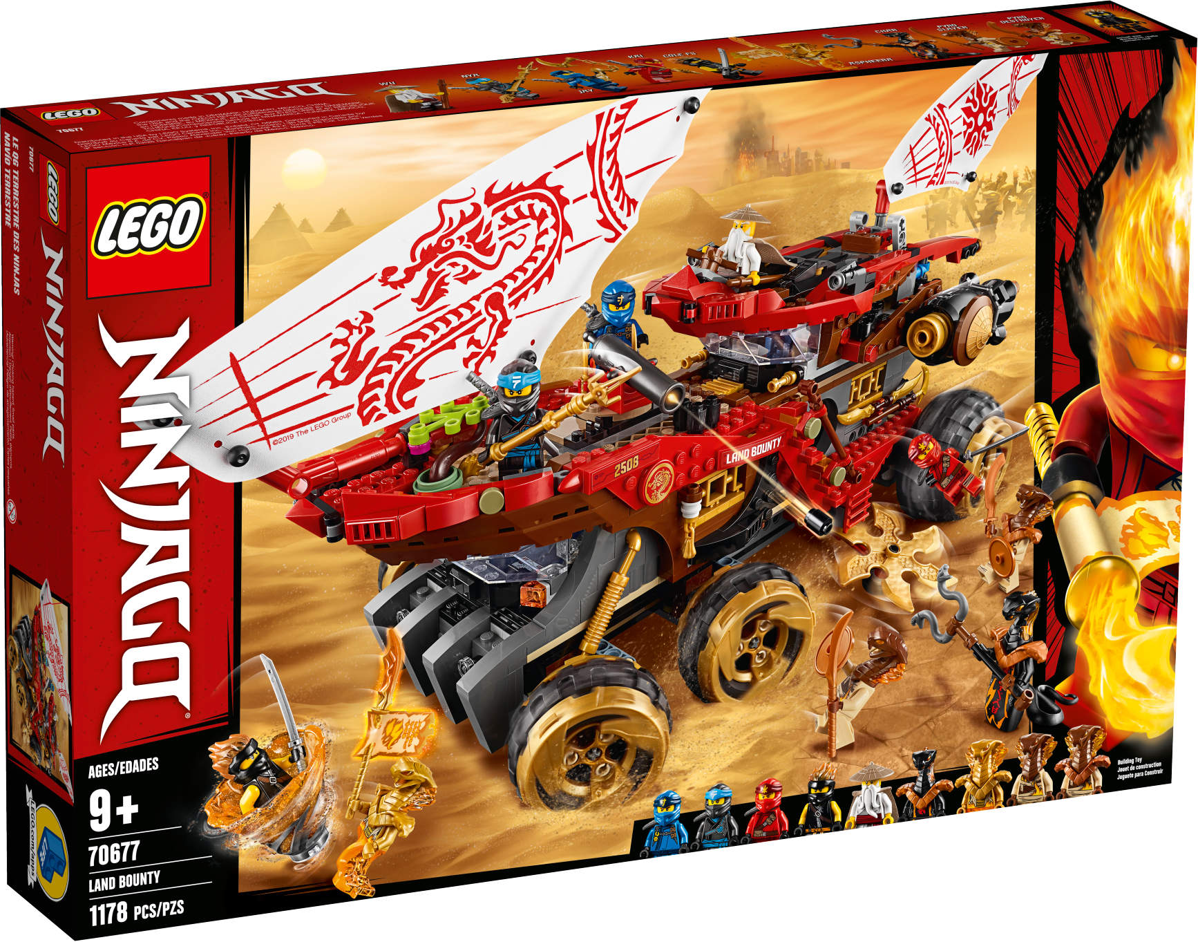 Kids will love building the versatile LEGO® NINJAGO® 70677 Land Bounty toy truck for play battles between the ninja action figures and snake queen Aspheera’s Pyro Vipers. This mobile ninja HQ features a steering function, 2 shuriken slicers, rotating shooting cannon, retractable spring-loaded shooter and an easily accessible, detailed interior to inspire creative play. For even more action, lift off the detachable flyer with dual minifigure cockpit, stud shooters and foldout boosters, or place a minifigure on the quad bike. Ninja kids will love reimagining scenes from the NINJAGO TV show and role-playing their own stories with 9 LEGO NINJAGO minifigures and lots of cool weapons and accessory elements, including a new-for-June-2019 ninja spinner. Playset includes 9 new-for-June-2019 LEGO® NINJAGO® minifigures: Wu, Kai, Jay, Nya and Cole FS (Forbidden Spinjitzu) ninja action figures, plus Aspheera, Char, Pyro Destroyer and Pyro Slayer. Land Bounty ninja truck toy features wheels with gold-colored rims and a steering function, 2 gold-colored shuriken slicers, detachable flyer, rotating shooting cannon, retractable spring-loaded shooter, 2 decorated textile sails (1 on the detachable flyer), detailed interior room with a dual minifigure cockpit, dojo with 2 weapon racks, buildable arcade game, teapot element, and an opening rear compartment with small quad bike. Detachable flyer features an opening dual minifigure cockpit, 2 stud shooters and foldout boosters. Quad bike has a minifigure seat. Turn the switch at the back to turn the wheels and steer Land Bounty. Drive Land Bounty and the shuriken slicers spin automatically. Weapons include Kai's silver- and gold-colored katanas, Jay's silver-colored katana and gold-colored nunchucks, Nya’s silver-colored katana and gold-colored spear, Wu’s bo staff, Char’s snake scepter, Pyro Destroyer’s scimitar and Pyro Slayer’s sword. Accessory elements include Kai, Jay and Nya’s katana holders, Cole FS’s ‘powered-up’ hood element and new-for-June-2019 tornado spinner toy, Wu's new-for-June-2019 cape, Aspheera's Scroll of Forbidden Spinjitzu, Aspheera and Pyro Destroyer's snake armor and shield, and Pyro Slayer's shield. This ninja toy truck set is a cool toy for kids to recreate exciting action from the NINJAGO® TV show. Land Bounty ninja vehicle measures over 8” (22cm) high, 19” (50cm) long and 7” (18cm) wide. Detachable flyer measures over 5” (13cm) high, 12” (31cm) long and 11” (30cm) wide.