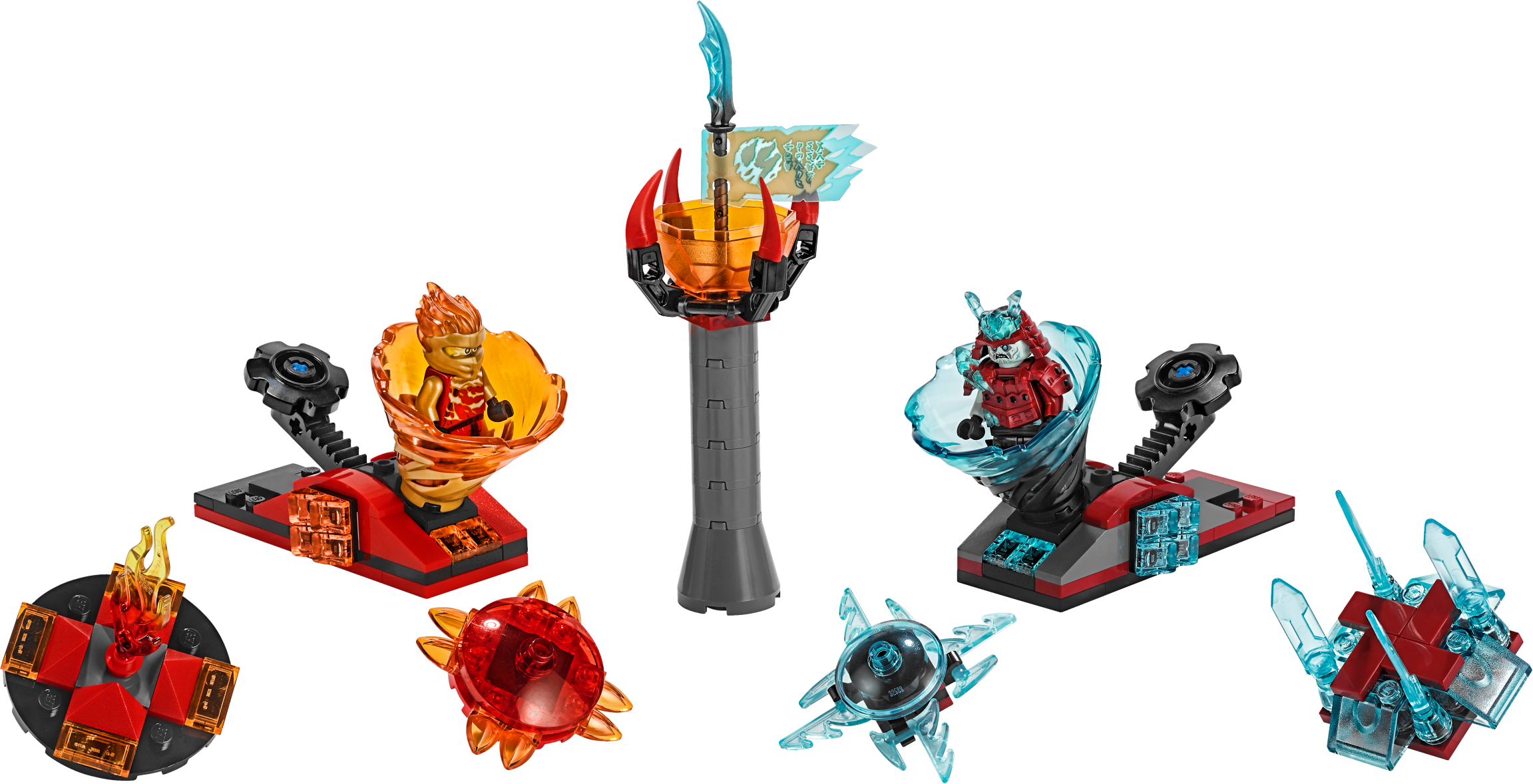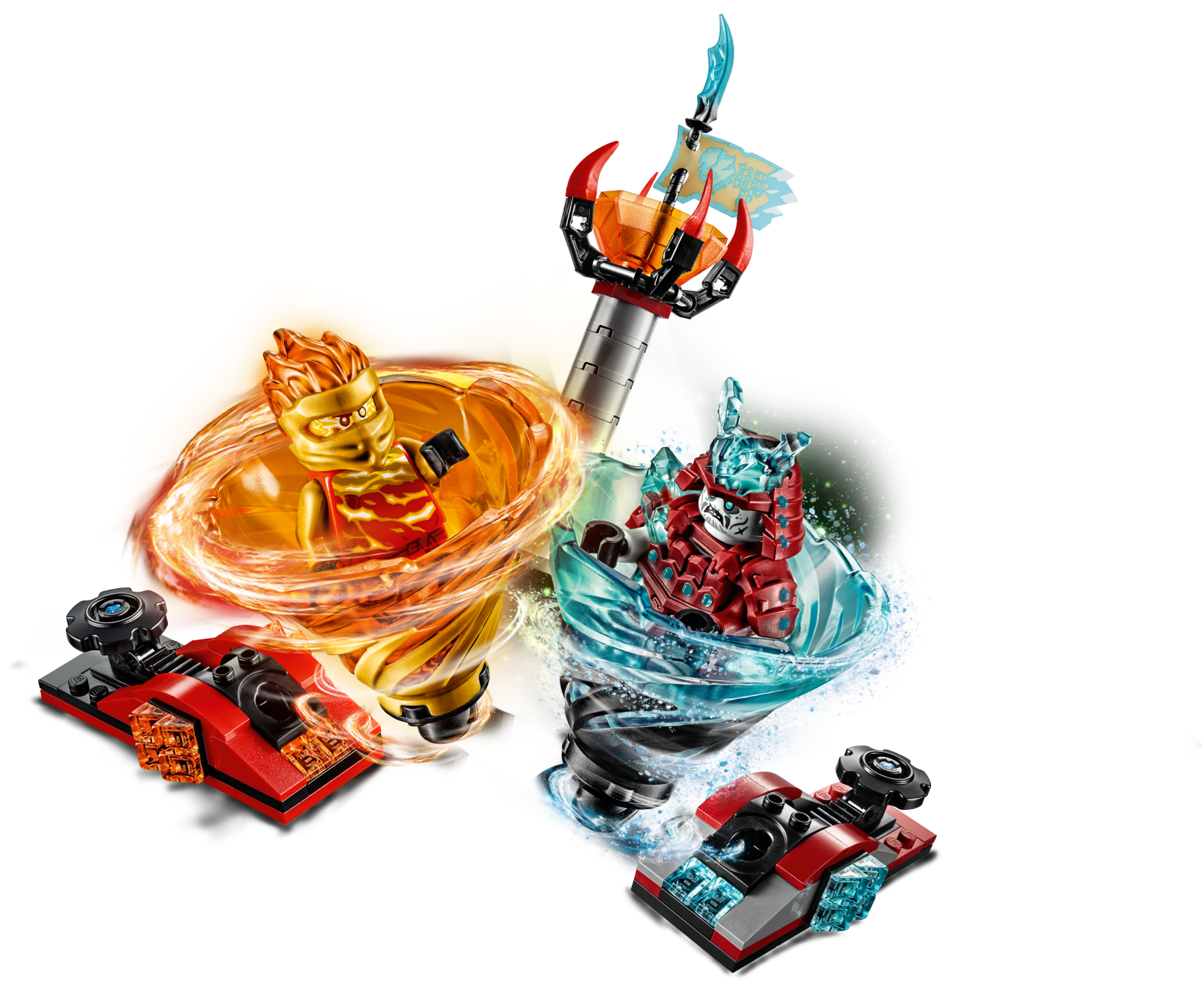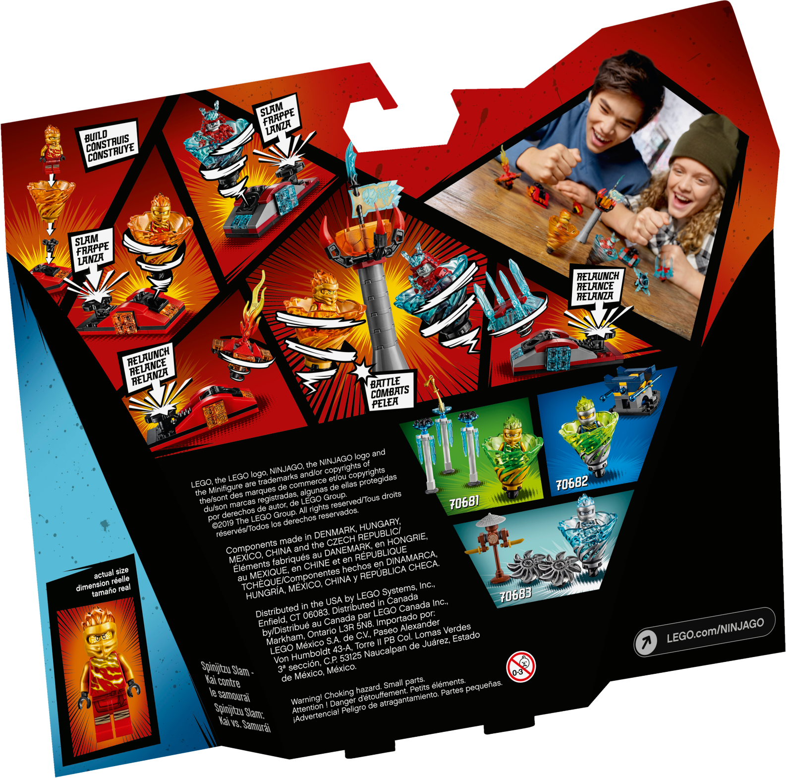 High-speed spinning action is in store for kids as they play out Elemental clashes with LEGO® NINJAGO® 70684 Spinjitzu Slam - Kai vs. Samurai. This fun toy building set features Kai FS and Blizzard Samurai’s tornado spinners which each hold a minifigure and fit onto their own easy-to-build spinner launchers, plus a buildable pedestal with the Scroll of Forbidden Spinjitzu on top to use as a target in role-play battles. The playset includes Kai FS's eternal flame and fireball elements and Blizzard Samurai’s ice crystal and ice shield elements which can also be sent spinning with the launchers. Great for solo or social play, kids will love recreating the ninja tornado effect as seen on the NINJAGO TV show and creating their own Spinjitzu Slam competitions. This action-packed spinning top toy includes a collectible Kai FS minifigure, with a ‘powered-up' hood element, and a Blizzard Samurai minifigure for creative role-play. Includes 2 new-for-June-2019 minifigures: Kai FS (with a ‘powered-up’ hood element) and Blizzard Samurai. This LEGO® NINJAGO® spinner toy features 2 brick-built launchers and new-for-June-2019 Kai FS and Blizzard Samurai Tornado Spinners, plus a buildable pedestal with the Scroll of Forbidden Spinjitzu. Place the minifigures in the tornado spinners, attach them to the launchers and slam down on the launcher to send each minifigure spinning. Also includes Kai FS's eternal flame and fireball elements and Blizzard Samurai’s ice crystal and ice shield elements—attach any one to a launcher and slam to make it spin towards a target. A great gift for kids who can make up their own Spinjitzu Slam challenges and compete against their friends. Add 70681 Spinjitzu Slam - Lloyd, 70682 Spinjitzu Slam - Jay and 70683 Spinjitzu Slam - Zane LEGO® NINJAGO® spinner toys for thrilling Spinjitzu Slam showdowns. Recreate the ninja tornado effect as seen on the NINJAGO® TV show with this action-packed LEGO® set. This LEGO® playset makes a great birthday or holiday gift for NINJAGO® fans. Each tornado spinner launcher with spinning top toy attached measures over 1” (5cm) high, 1” (3cm) wide and 3” (8cm) deep. Pedestal measures over 3” (9cm) high.