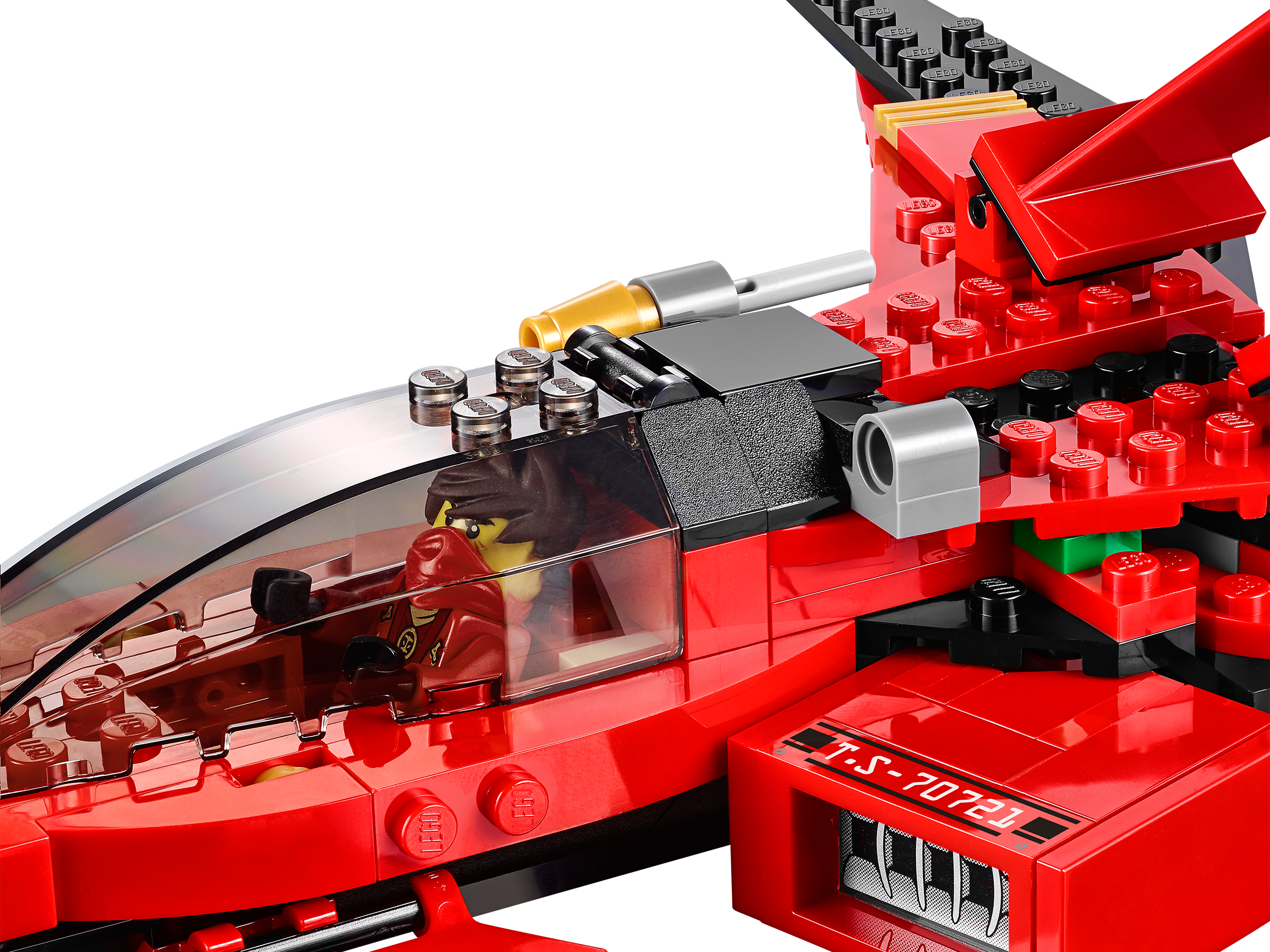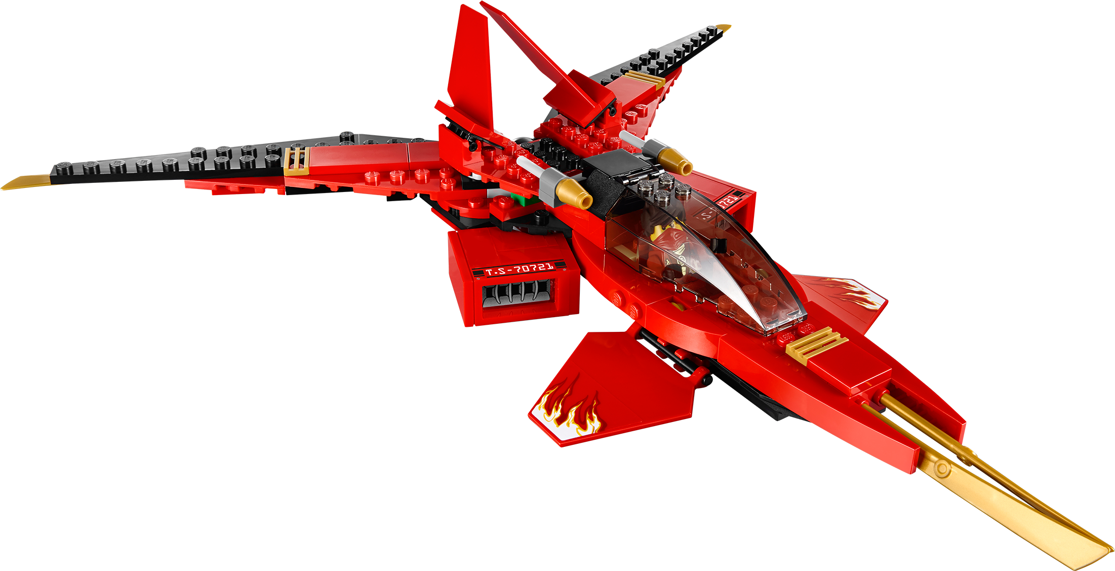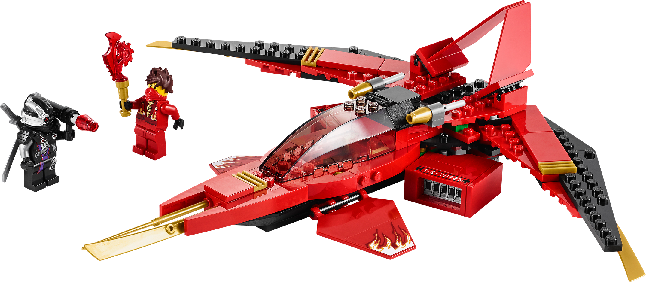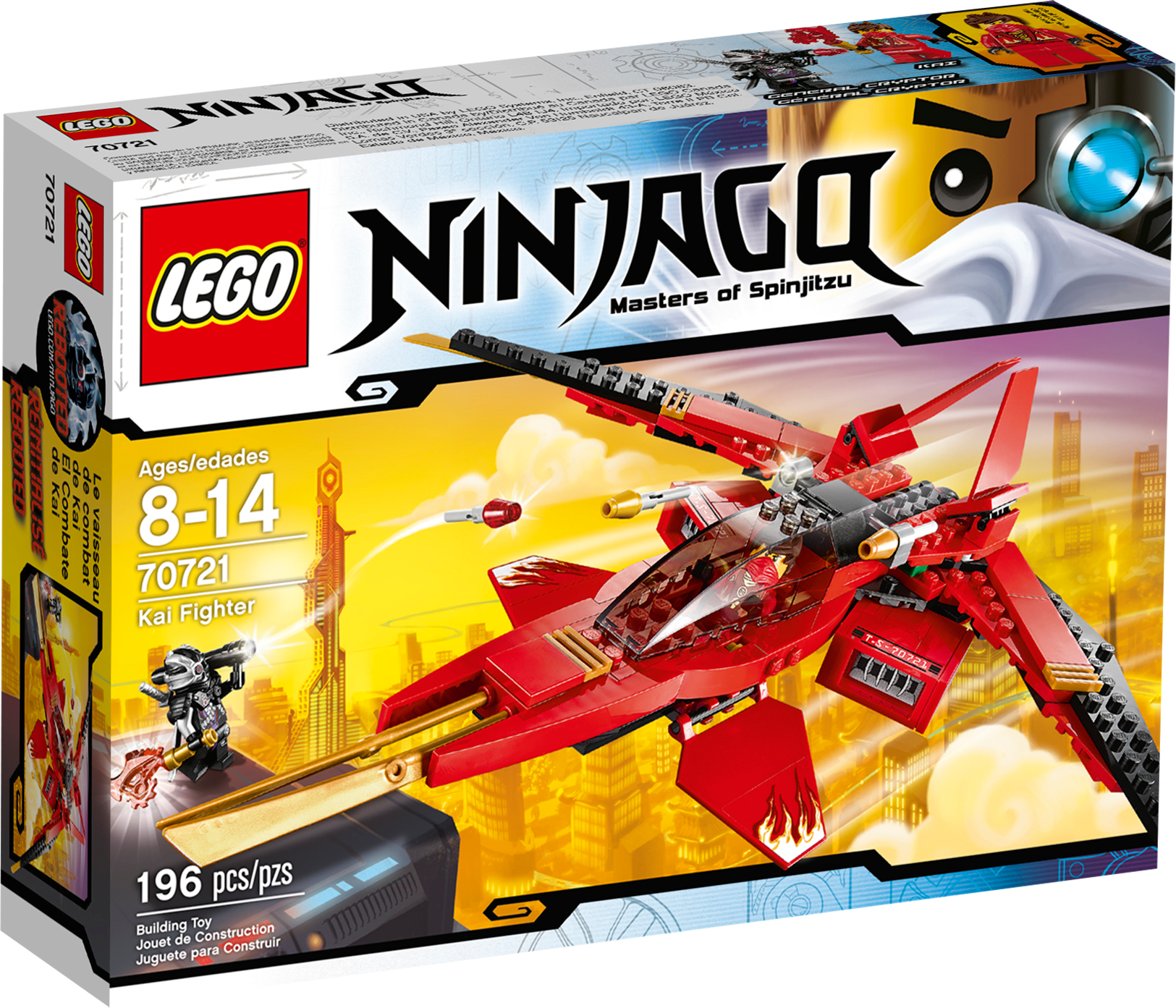 Take on General Cryptor with the red-hot Kai Fighter! Kai has taken over a civilian vehicle and used his Techno-Blade to turn it into an awesome red and gold Ninja Fighter! Take off and weave between the skyscrapers of New Ninjago City with Kai in the cockpit. Shoot the gold-tipped flick missiles into the path of the evil General Cryptor and evade blasts from his ground-to-air laser rocket launcher. Defeat General Cryptor then flip the wings back to engage speed mode and zoom away. Includes 2 minifigures with weapons and an accessory: Kai and General Cryptor.Includes 2 minifigures with weapons and an accessory: Kai and General Cryptor with armorFeatures 2 gold-tipped flick missiles, speed mode adjustable wings, wing blades, 2 powerful side jet engines and cockpit with space for a minifigure Weapons include exclusive translucent red Techno-Blade, 2 swords and laser rocket launcherAlso includes special armor for General CryptorFire the gold-tipped flick missilesFlip the wings into speed mode to accelerate away from Nindroid attacksGrab the red Techno-Blade from General Cryptor and save New Ninjago CityMeasures over 4” (12cm) high, 10” (26cm) long and 13” (34cm) wide