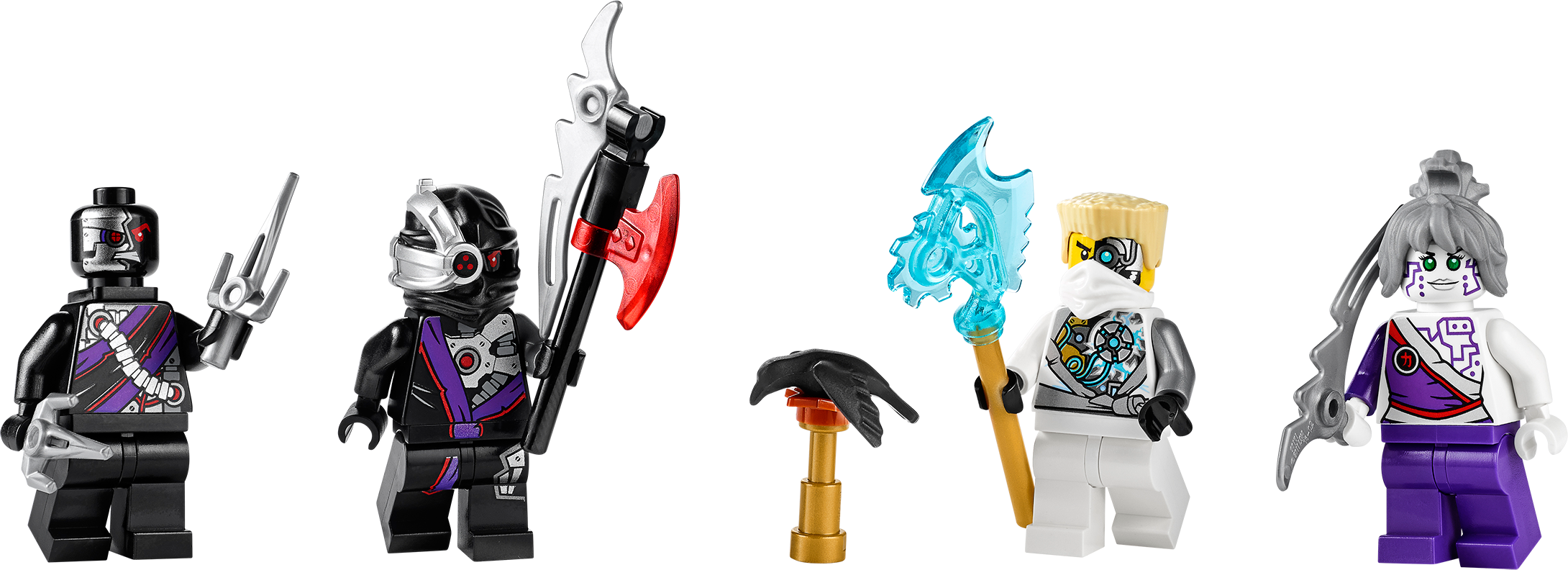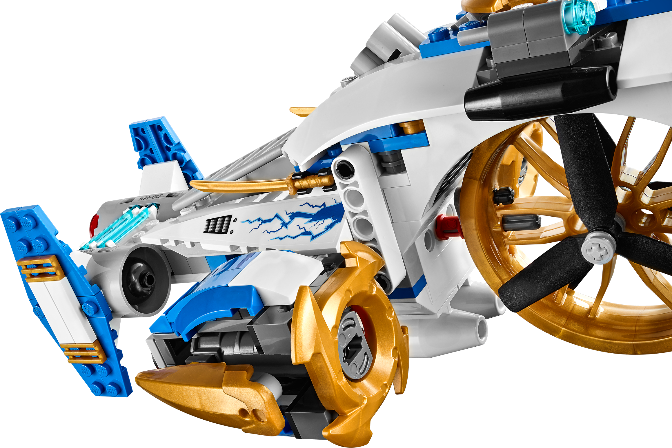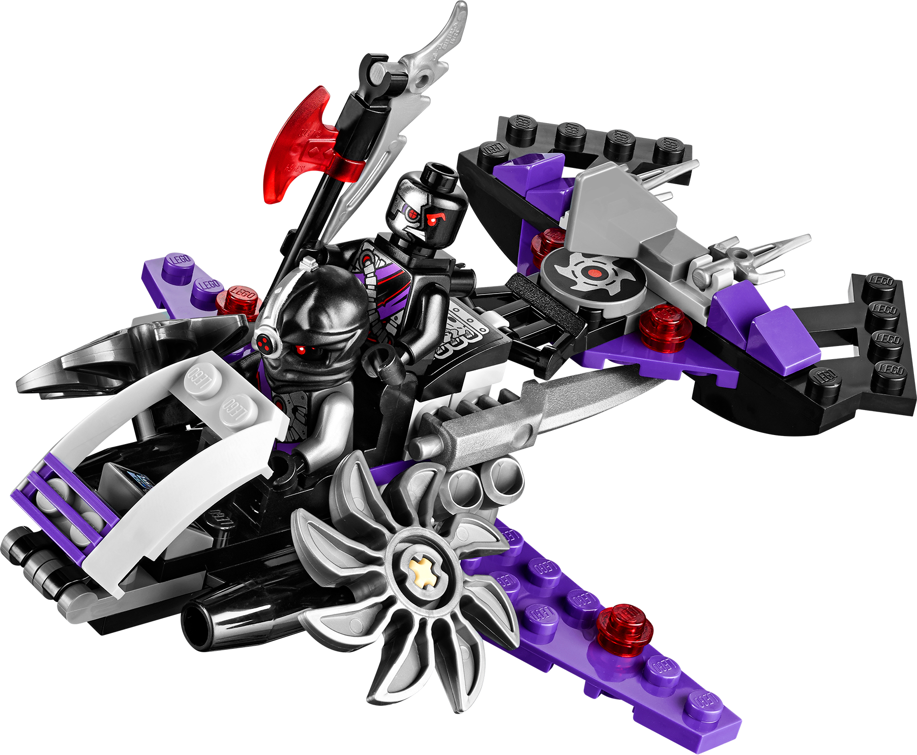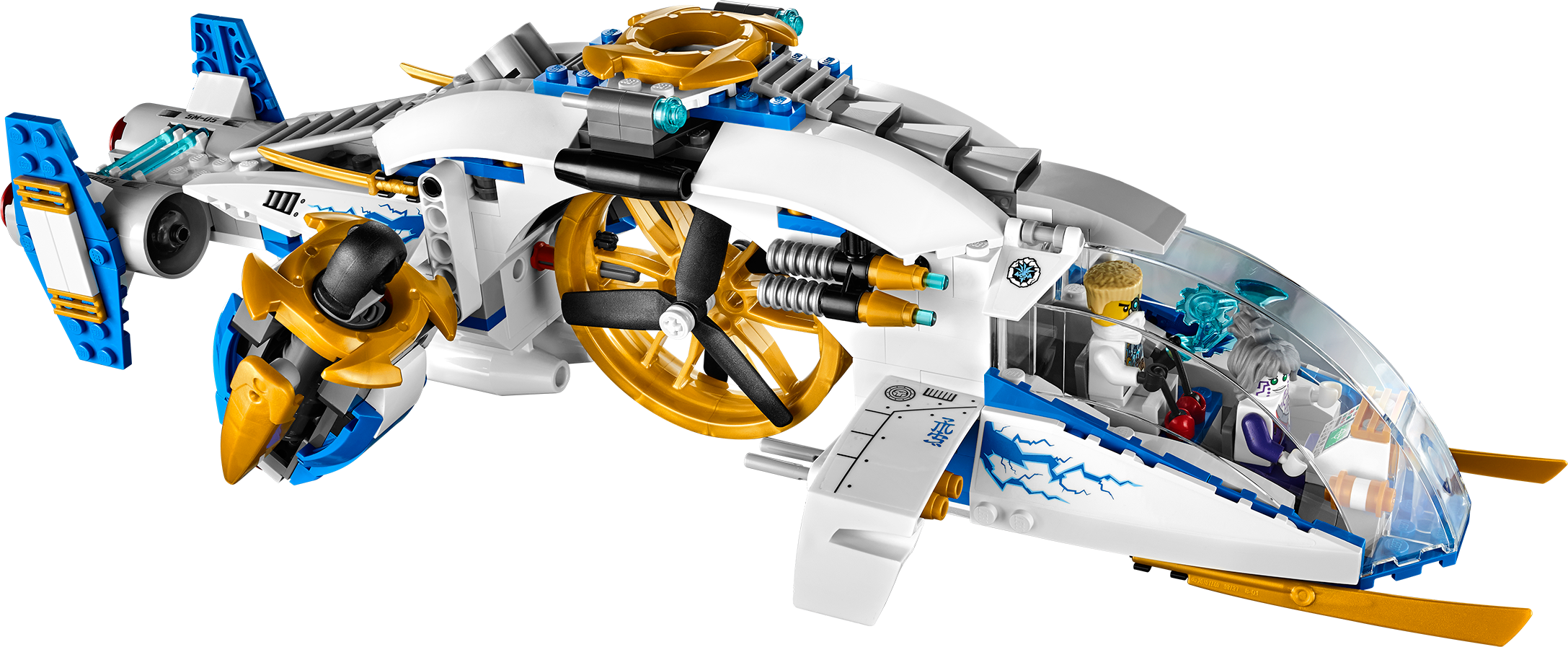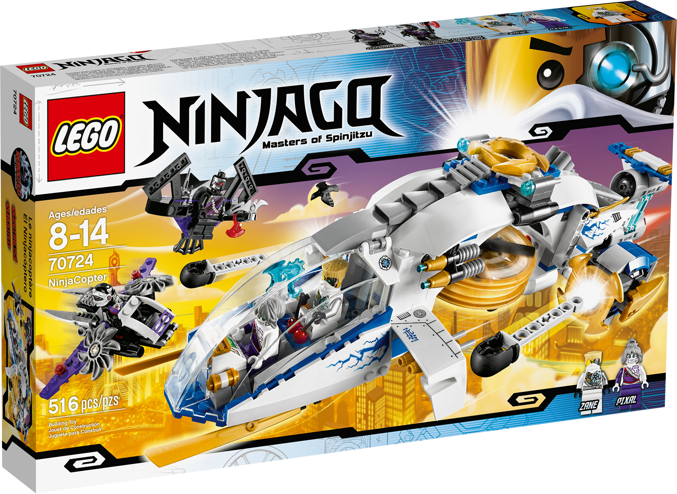 Launch an action-packed aerial assault on the Nindroids with the NinjaCopter! A thrilling battle is raging above New Ninjago City as the conflict for the Techno-Blades reaches new heights! Battle-scarred Zane, with his half-robot/half-Ninja face, and Pixal must work together in the NinjaCopter to outwit the attacking Nindroids. Spin the propellers and rear jet engines to soar into action. Fire the front flick missiles and rotating shooting cannons, taking care to evade the spinning saw blades of the Nindroid jet fighter. And beware – at any moment the Nindroid may launch the attack glider to double the aerial assault! Includes 4 minifigures with weapons: Zane, Pixal and 2 Nindroids.Includes 4 minifigures with weapons: Zane, Pixal and 2 NindroidsZane minifigure, with half-robot/half-Ninja face, is exclusive to this setNinjaCopter features hi-tech cockpit, rotating propellers for take-off and flight mode, rotating rear jet engines, air-intake engines, adjustable landing flaps, front flick missiles, front lasers, rotating shooting cannons, prison cell, gold elements and top flick missilesNindroid jet fighter features adjustable cockpit, spinning saw blades and a detachable gliderWeapons include translucent blue Techno-Blade for Zane, Nindroid battle saw blades and Pixal’s spike bladeAlso includes Zane’s falcon, new and exclusive to this setSpin the propellers and soar skywardsFire the front flick missiles and rotating shooting cannonsCapture a Nindroid in the prison cellClip the Nindroid onto the detachable glider to double the Nindroid’s aerial threatNinjaCopter measures over 3” (9cm) high, 14” (37cm) long) and 6” (16cm) wideNindroid jet fighter measures over 1” (3cm) high, 4” (11cm) long) and 4” (12cm) wide