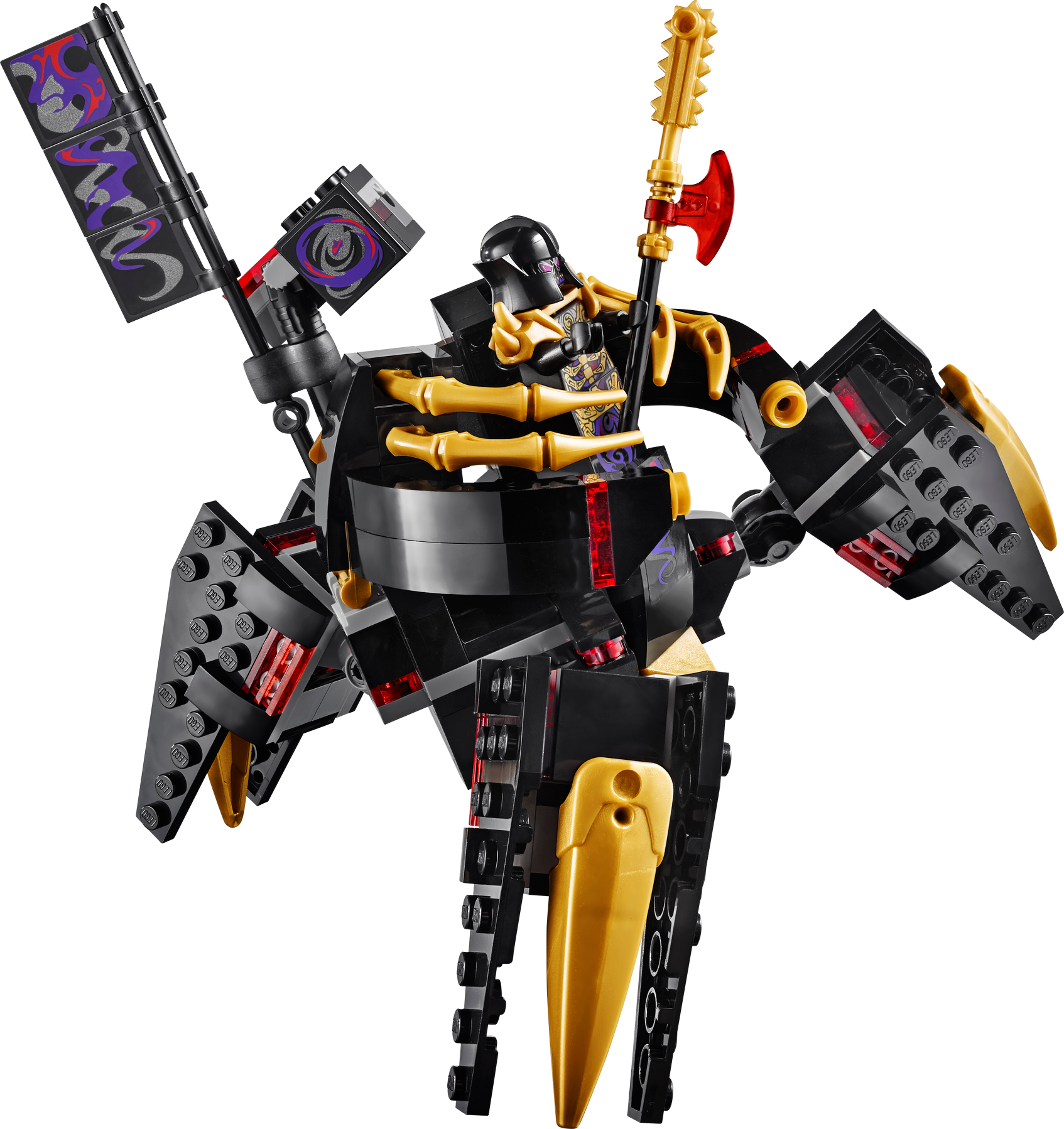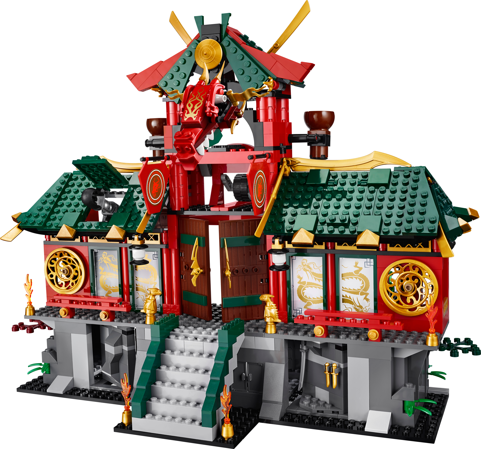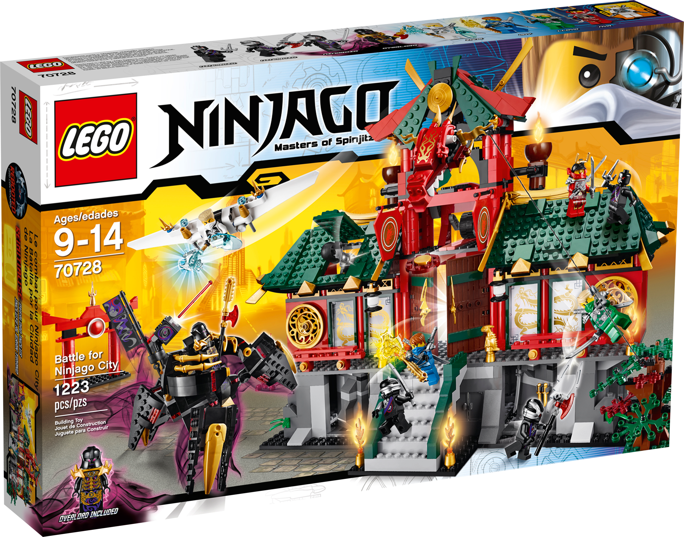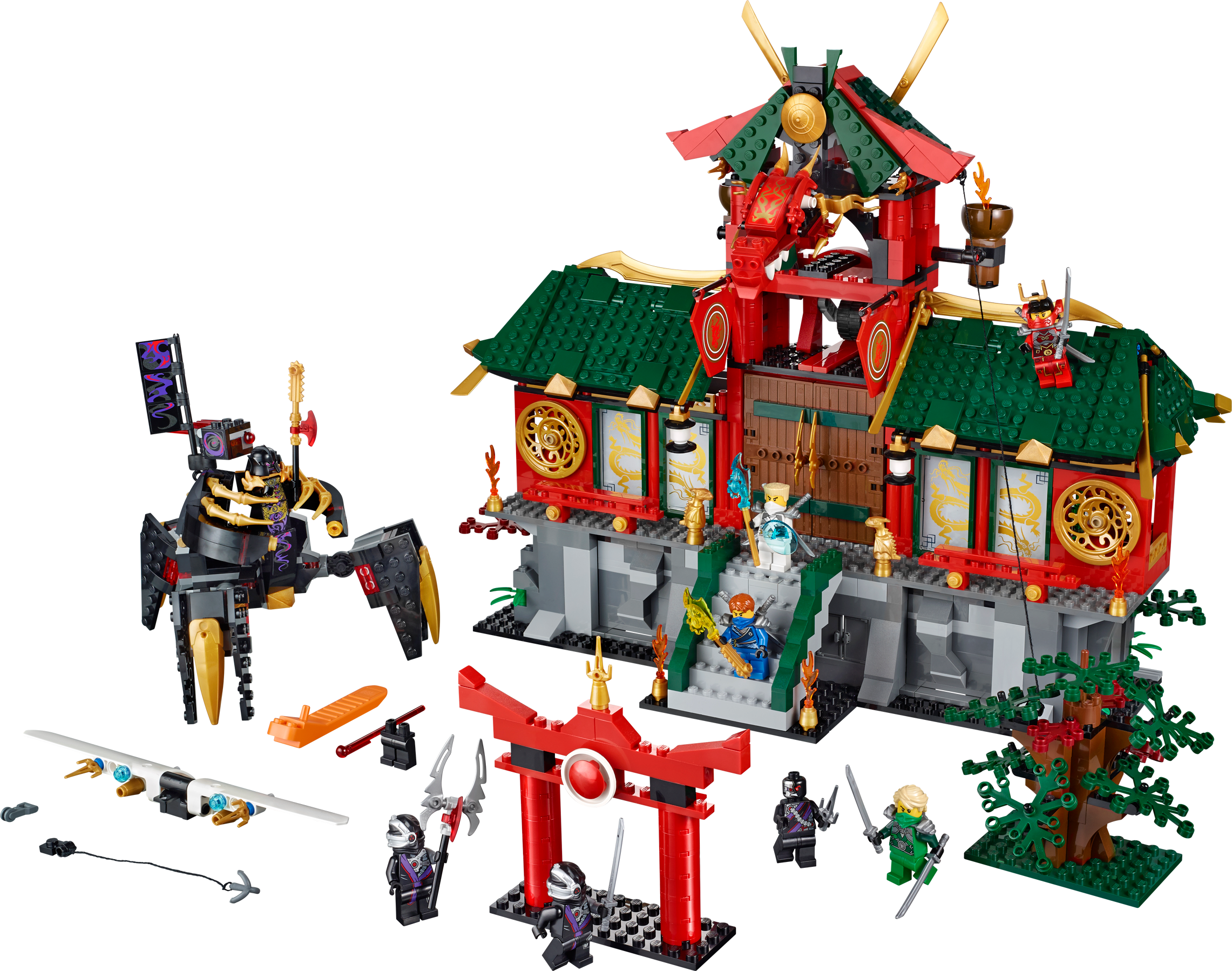 Defend the awesome Ninjago Temple against OverLord attacks! The huge evil OverLord has powered up and is threatening to take over New Ninjago City. Help the Ninjas to defend the Ninjago temple using its awesome array of hidden features. Plan your strategy in the control room and activate the catapult stairs to send intruding Nindroids flying. Evade laser-cannon fire from OverLord and retaliate by triggering the tower’s dual catapult and hidden disc shooter. Zoom down the zip line from the roof with Lloyd, spin the rotating walls to reveal hidden weapons, and glide into battle with Jay. Outsmart those Nindroid invaders and lock them up in the prison! Includes 8 minifigures with assorted weapons and accessories: Jay, Lloyd, Zane, Nya, OverLord and 3 Nindroids.Includes 8 minifigures with assorted weapons and accessories: Jay, Lloyd, Zane, Nya, OverLord and 3 NindroidsNinjago Temple features huge entrance doors, dragon windows, rotating walls with hidden weapons, catapult stairs, Ninja control room with computer, cool tools, hidden Ninja sleeping areas, kitchen with grill and sausages, prison for Nindroids, dragon tower with dragon head, flags, dual catapult and hidden disc shooter, roof with hidden shooter cannon, secret Ninja entrance, zip line and golden decorative elementsAlso includes iconic Ninjago entrance arch and treeOverLord features firing laser cannon, huge golden claws, giant mechanical posable legs, golden and red translucent elementsZane’s glider features 2 flick missiles, golden and translucent elementsWeapons include a translucent yellow Techno-Blade for Jay, blue Techno-Blade for Zane, 8 Ninja swords, Nindroid dagger, droid axe and sword, plus a cool gold and black weapon with red element for OverLordAccessories include a translucent blue shield for ZaneMake Ninja battle plans in the control roomGrill sausages in the kitchen to feed the Ninja warriorsActivate the catapult stairs to send a Nindroid flying!Spin the walls to access hidden weaponsFire the disc shooter at OverLordTrigger the catapults from the towerZoom down the zip line from the roof with LloydShoot the flick missiles from Zane’s gliderCapture Nindroids in the prisonNinjago Temple measures over 13” (33cm) high, 15” (36cm) wide and 7” (14cm) deepTree measures over 3” (9cm) high, 3” (9cm) wide and 4” (12cm) deepTemple entrance arch measures over 4” (12cm) high, 4” (12cm) wide and 1” (3cm) deepOverLord stands over 5” (14cm) tallZane’s glider measures over 1” (3cm) high, 7” (18cm) long and 1” (5cm) wide