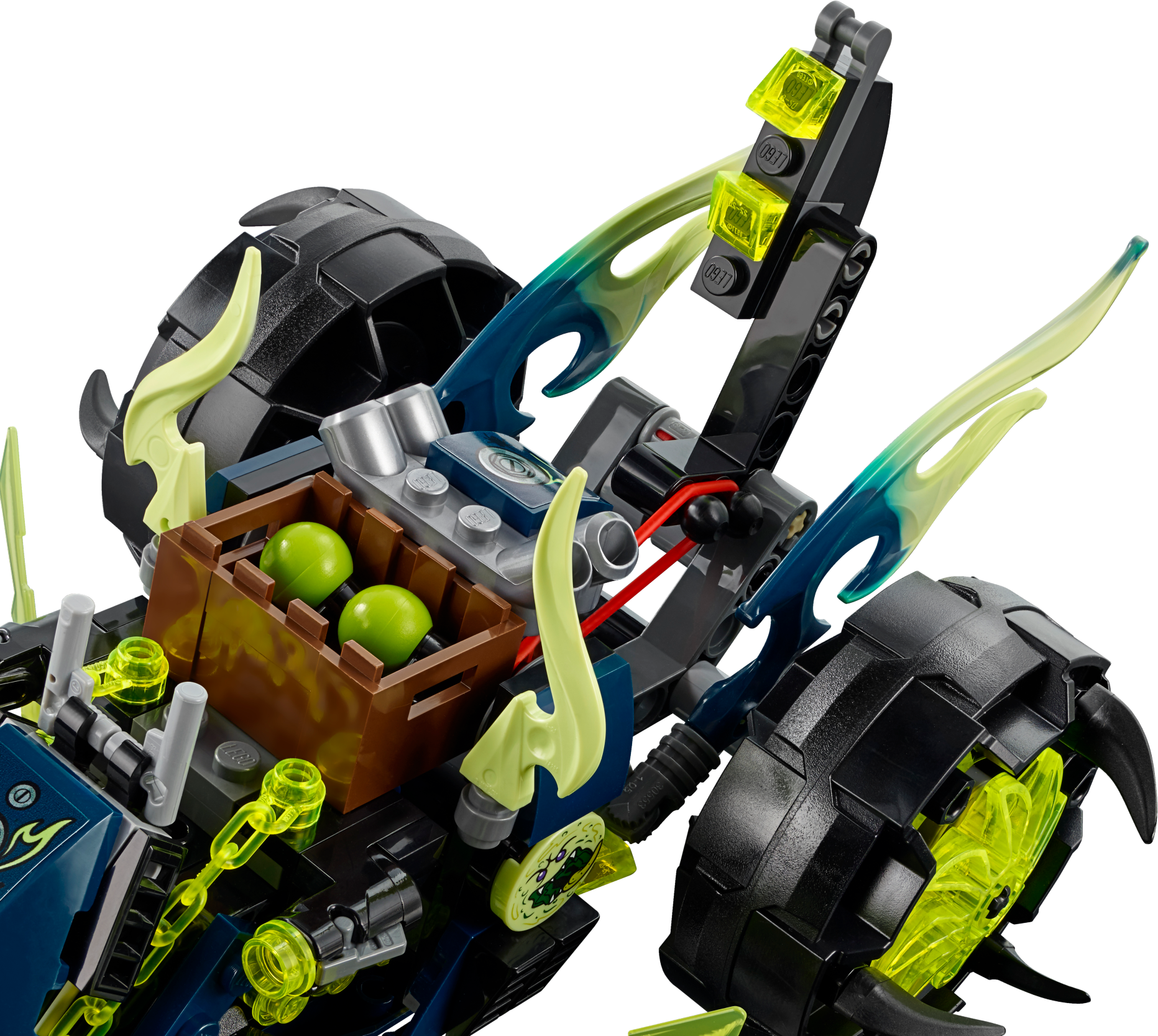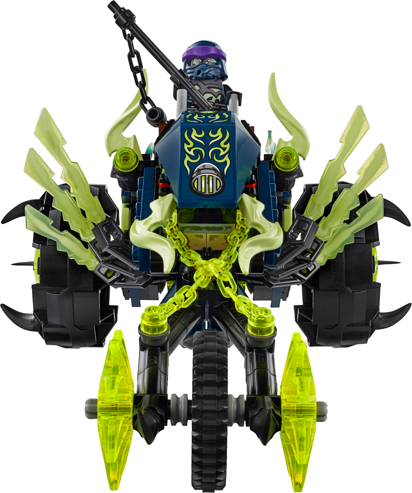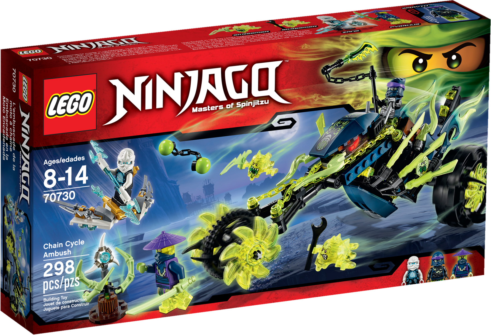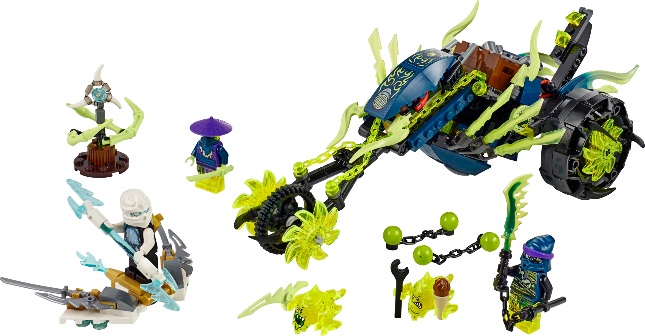 Speed away from the Ghost Bike and grab the Aeroblade! Help Zane to defeat Chain Master Wrayth! Grab the precious Aeroblade from the spirit vortex and defeat the Ghosts! The ghoulish Wrayth is riding to intercept the Ninja on his spine-chilling Chain Cycle with spiked wheels. Jump onto Zane’s glider and swerve clear of the bike’s stud shooters. Dodge the chain bolas fired from the rear catapult and watch out for the deadly Skreemers—if they attach themselves to Zane’s head, he’ll be turned into a ghost! Fend off those Ghosts with his double-ended Elemental Ice Spear and beat the Chain Master to the Aeroblade before it’s too late. Includes 3 minifigures with assorted weapon elements: Zane, Chain Master Wrayth and Ghost Warrior Pyrrhus. Includes 3 minifigures with assorted weapon elements: Zane, Chain Master Wrayth and Ghost Warrior Pyrrhus Chain Cycle features a saddle, red ‘eyes’, wheels with spikes, 2 stud shooters, weapons holder, chain bolas and a rear catapult Zane’s glider features blade and sword details and a translucent ice exhaust element Spirit vortex features a detachable Aeroblade Also includes 2 Skreemer (attachable to minifigures) with accessory elements: an ice cream, Ghost Katana and a wrenchWeapon elements include Zane’s Elemental Ice Spear, Wrayth’s Chain Staff with Ghost Master Blade and Pyrrhus’ Ghost Katana Wrayth and Pyrrhus minifigures feature transparent ghost legs and ghost armor Evade the Chain Cycle’s catapult and stud shooters! Fend off the Skreemer with Zane’s Elemental Ice Spear Defeat Wrayth and grab the Aeroblade from the ghost vortex Recreate your favorite scenes from the NINJAGO™: Masters of Spinjitzu TV show Chain Cycle measures over 3” (10cm) high, 10” (27cm) long and 5” (14cm) wide Zane’s glider measures over 2” (7cm) long, 2” (7cm) wide and under 1” (1cm) high Spirit vortex measures over 2” (6cm) high, 1” (4cm) wide and 1” (4cm) deep