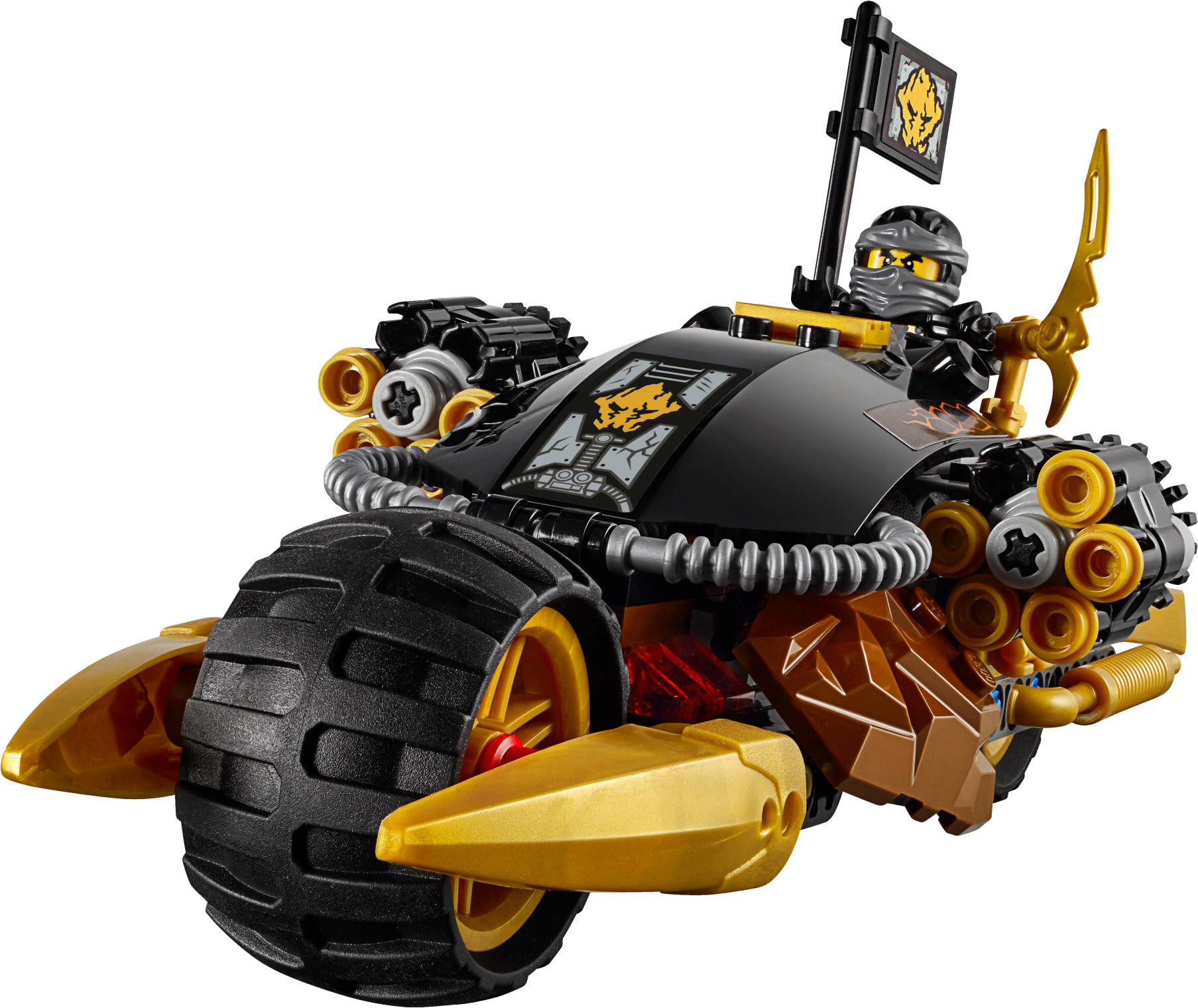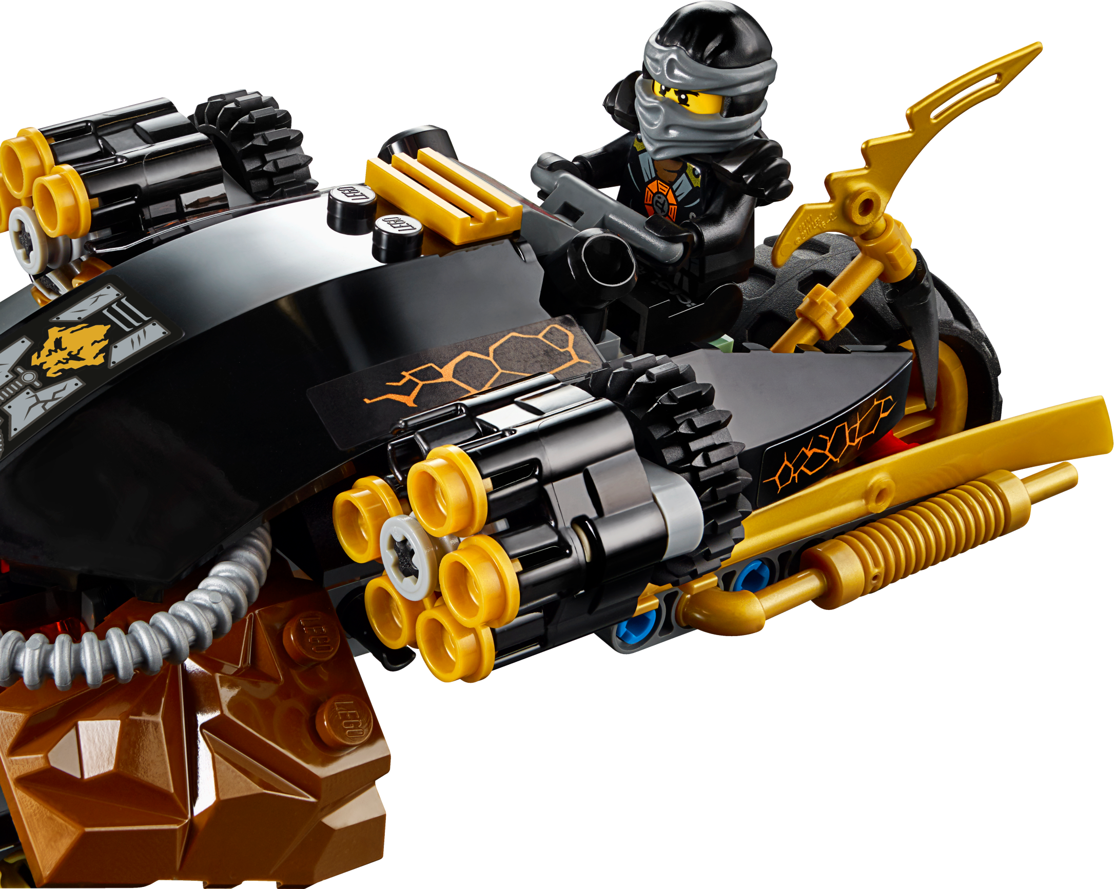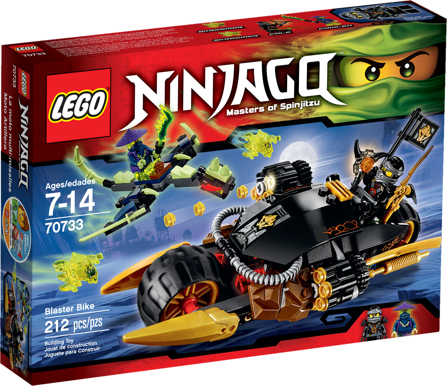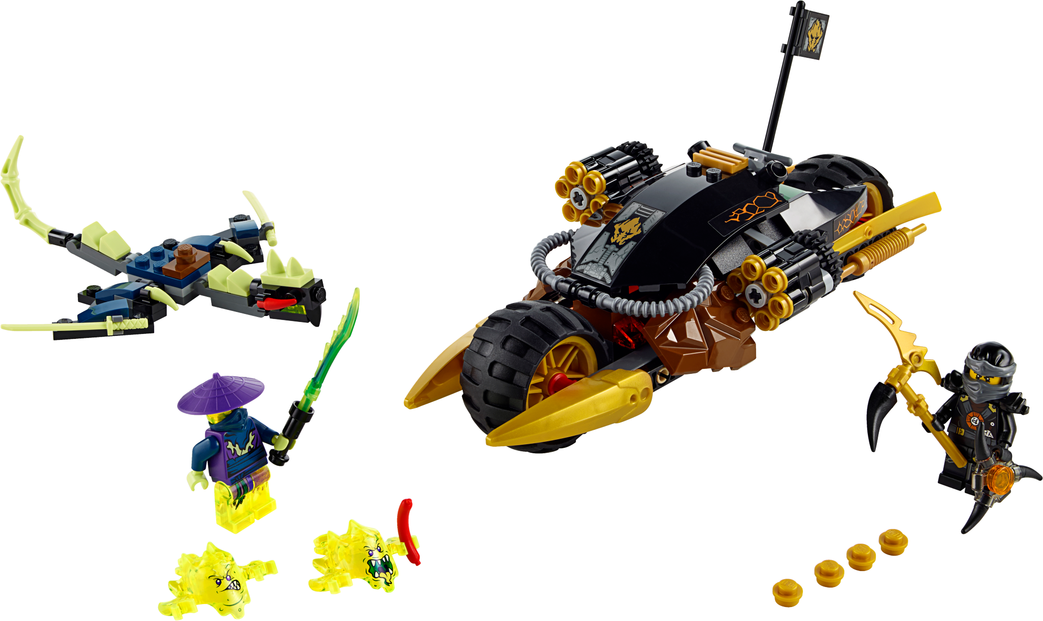 Fold out the rapid shooters and take down the Ghost Dragon! Ride Cole’s Blaster Bike into battle and protect the Aeroblade! The Ghost Warrior Cowler is armed with a deadly Ghost Blade Sword and is launching an aerial attack on a Ghost Dragon. Fold out the awesome dual six-shooting rapid shooters to take down the flying beast. Speed away from the pair of Skreemers trying to turn Cole into a ghost and don’t let them get their hands on the Aeroblade! Includes 2 minifigures with assorted weapon elements and an accessory element: Cole and Ghost Warrior Cowler. Includes 2 minifigures with assorted weapon elements and an accessory element: Cole and Ghost Warrior Cowler Cole’s Blaster Bike features 2 foldout rapid shooters, big wheels, 2 golden exhausts and a flag with Ninja details Ghost Dragon features a posable head, wings and tail, and a saddle Also includes 2 Skreemers (attachable to minifigures) with a sausage element Ghost Warrior Cowler minifigure features transparent ghost legs Weapon elements include Cole’s Deepstone Scythe, Cowler’s Ghost Blade Sword, and the Aeroblade Cole’s Deepstone armor element also included Ghost Warrior Cowler minifigure features transparent ghost legs Swerve away from the Ghost Dragon’s swooping attacks Fold out and fire the six-shooting rapid shooters! Escape from the Skreemers with the Aeroblade Recreate your favorite scenes from the NINJAGO™: Masters of Spinjitzu TV show Cole’s Bike measures over 3” (9cm) high, 7” (20cm) long and 3” (8cm) wide Ghost Dragon measuresover 4” (12cm) long, 4” (12cm) wide and under 1” (2cm) high