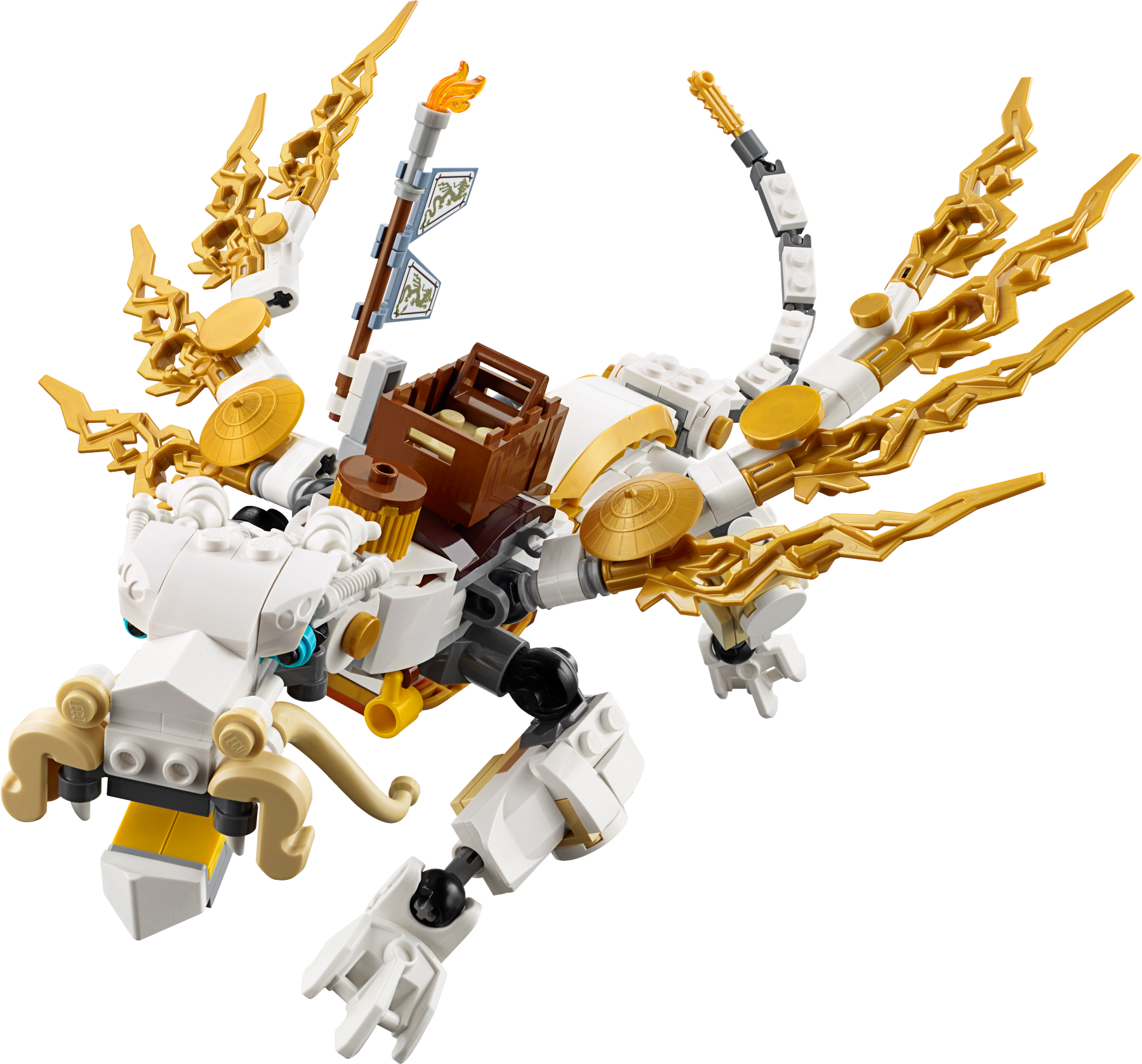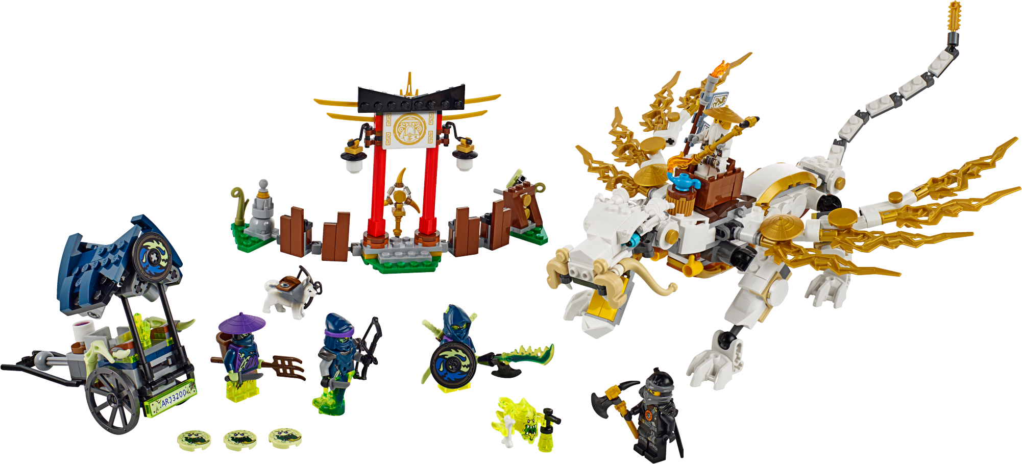 Protect the Aeroblade with Master Wu’s powerful dragon! Protect the Aeroblade from the Bow Master Soul Archer and his ghost army with the Master Wu Dragon! Dodge the Ghost discs fired from the possessed rickshaw and fight back with the tea farm’s flick missiles. Beware of the Skreemer carrying a bottle of ghost poison and trying to turn Cole into a ghost. The Ghost Ninja need the Aeroblade to fulfill their evil master plan, so use all your Ninja skills to defend it! Includes 5 minifigures with assorted weapon and accessory elements: Master Wu, Cole,Bow Master Soul Archer, Ghost Warrior Pitch and Ghost Ninja Hackler. Includes 5 minifigures with assorted weapon and accessory elements: Master Wu, Cole, Bow Master Soul Archer, Ghost warrior Pitch and Ghost Ninja Hackler Master Wu’s dragon features a posable head with opening jaws, posable wings, legs and tail, detachable saddle, flaming traveller’s teapot, table, cup and golden elements Master Wu’s tea farm features an Aeroblade with stand, Ninja banner, Ninja sword decorations, 2 lantern elements and computer element with 2 flick missiles Possessedrickshaw features a hidden Ghost disc shooter, storage for extra discs, Ghost crystal and cup elements Also includes a Skreemer (attachable to minifigures) with a bottle of ghost poison and Sensei Wu’s dog with a crossbow Weapon elements include Sensei Wu’s Deepstone Staff, Soul Archer’s bow and arrow and dagger, Hackler’s Ghost Axe Blade and Ghost Katana, and Pitch’s knife Accessory elements include Cole’s Deepstone armor, Hackler’s shield (with ghost decoration) and Pitch’s pitchfork SoulArcher minifigure features a ghost tail (new for fall 2015) Pitch and Hackler minifigures feature transparent ghost legs and ghost armor Master Wu Dragon is new to the LEGO® NINJAGO™ collection for fall 2015! Create fearsome battle poses with Master Wu’s dragon Fire the tea farm’s flick missiles! Evade ghost discs fired from the possessed rickshaw Prevent the ghost face from possessing Cole! Recreate your favorite scenes from the NINJAGO™: Masters of Spinjitzu TV show Sensei Wu’ s dragon measures over 7” (19cm) high, 15” (39cm) long and 9” (24cm) wide Aeroblade temple measures over 4” (11cm) high, 6” (16cm) wide and 3” (10cm) deep Possessed rickshaw measures over 3” (10cm) high, 4” (11cm) long and 1” (5cm) wide