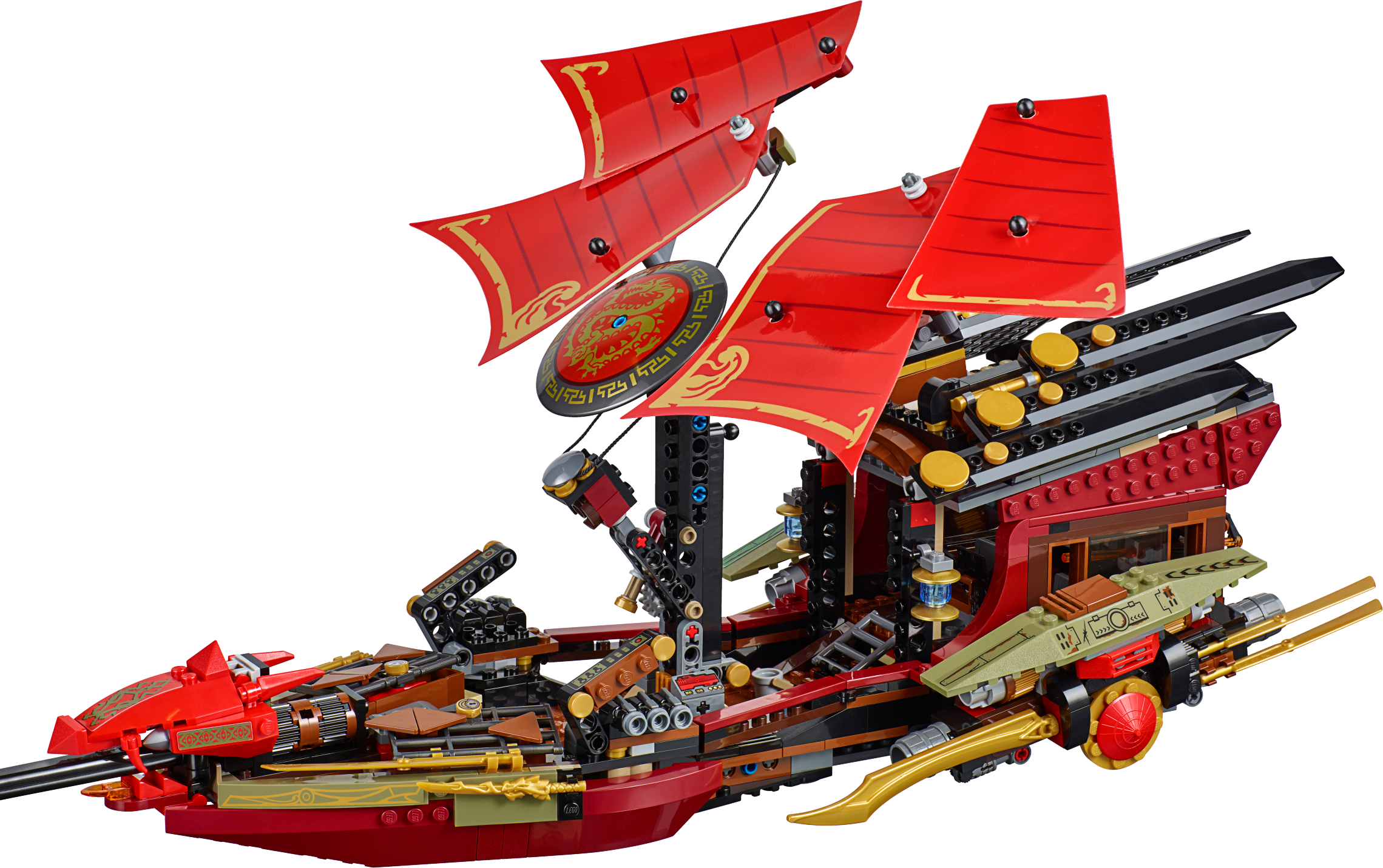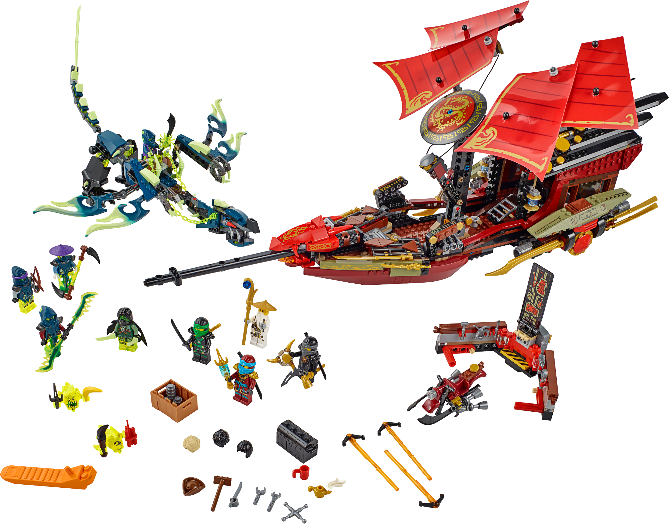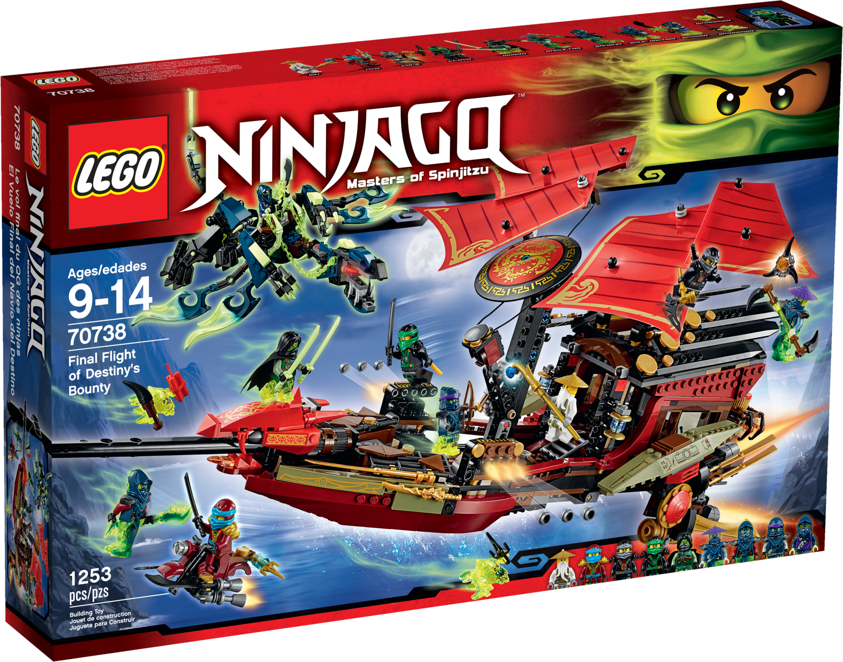 Battle Morro for the Aeroblade in Destiny’s Bounty! Attention Ninja heroes! All aboard Destiny’s Bounty for an aerial duel against Morro, the ultimate Ghost and Master of Wind! Check out the iconic LEGO® NINJAGO™ ship’s cool details including a detachable roof element containing Nya’s foldout workshop and an airbike. Pick up the ship with the handle, adjust the lever-operated sails and soar into battle. Avoid the snapping jaws and swiping tail of the Ghost Dragon and attack with the triple-stud-shooting cannons. Pull out the dual flick harpoon shooter to activate the engine transformation function. Unleash the airbike to fend off Morro’s Ghost Ninja and the menacing Skreemers. You must protect the Aeroblade from these evil Ghosts. Includes 9 minifigures with assorted weapon and accessory elements: Lloyd, Nya, Cole, Battle Wu, Morro, Blade Master Bansha, Bow Master Soul Archer, Scythe Master Ghoultar and Ghost Ninja Spyder.ncludes 9 minifigures with assorted weapon and accessory elements: Lloyd, Nya, Cole, Battle Wu, Morro, Blade Master Bansha, Bow Master Soul Archer, Scythe Master Ghoultar and Ghost Ninja Spyder Destiny’s Bounty features a retractable handle for easy flying, 4 lever-operated adjustable sails, 2 triple-stud-shooting cannons with ammunition, storage compartments with a crowbar and Katana, rotating dual flick harpoon shooter with engine transformation function, opening roof, detailed interior, Aeroblade, detachable roof element including Nya’s foldout workshop with hidden air bike and assorted tools, bucket, pirate hat with feather, cup, treasure chest with golden teapot, rat, cheese element, and golden Ninja blades and decorative elements Morro’s Ghost Dragon features a saddle, posable head with opening jaws, posable wings, legs and tail, and sharp talons Also includes 2 Skreemers (attachable to minifigures) with banana, sai, dynamite and dagger elements Weapon elements include Lloyd’s Golden Katana and Deepstone Katana, Nya’s Deepstone Katana and sai, Cole’s Deepstone Scythe, Battle Wu’s staff, Morro’s Ghost Katana, Bansha’s double-bladed Ghost Master Blade, Soul Archer’s crossbow, Ghoultar’s double-bladed scythe and Spyder’s saber Accessory elements include wigs for Lloyd, Nya and Cole Destiny’s Bounty model is new and improved for fall 2015 Bansha minifigure features ghost armor and a ghost tail (new for fall 2015) Soul Archer minifigure features transparentghost legs and ghost armor Pull the lever to adjust the sails Pose the head, wings, legs and tail of Morro’s ferocious Ghost Dragon Fire the rotating harpoon shooter! Open the roof to reveal Nya’s foldout workshop Unleash the airbike against the ghost drones! Recreate your favorite scenes from the NINJAGO™: Masters of Spinjitzu TV show Destiny’s Bounty measures over 9” (23cm) high, 23” (59cm) long and 13” (34cm) wide Detachable airbike measures over 1” (3cm) high,2” (7cm) long and 1” (4cm) wide Nya’s workshop measures over 3” (9cm) high, 5” (15cm) wide and 2” (6cm) deep Morro’s Ghost Dragon measures over 4” (12cm) high, 15” (40cm) long and 6” (17cm) wide