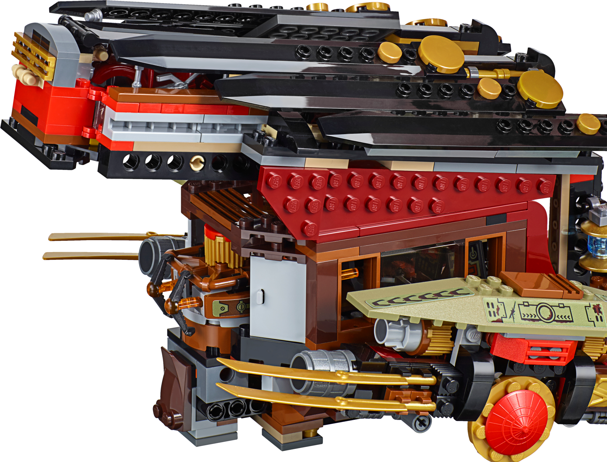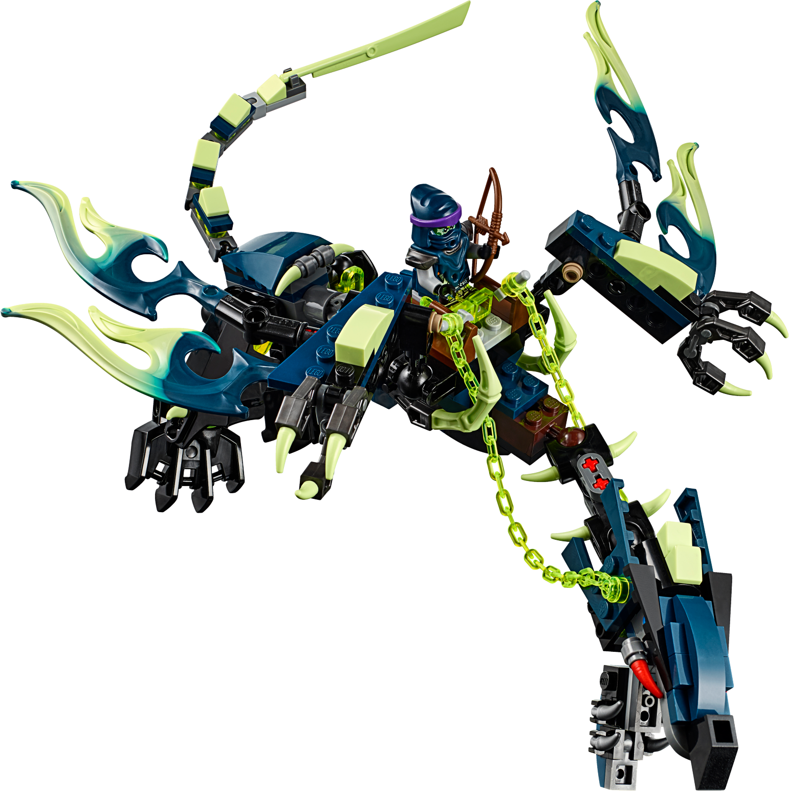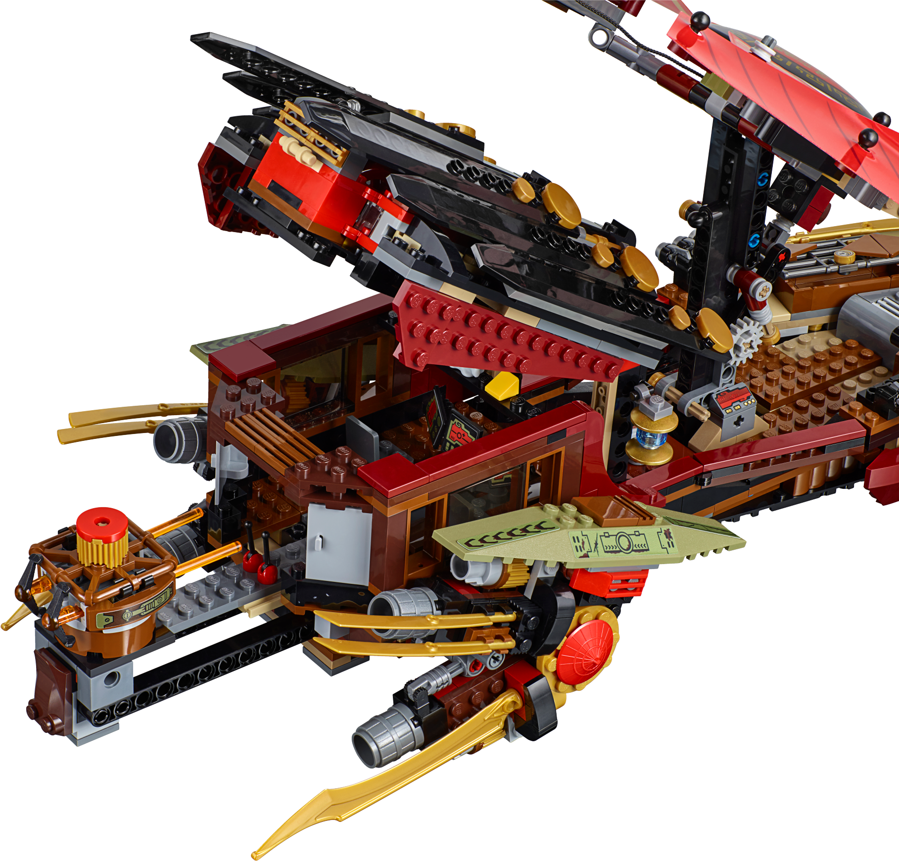 Battle Morro for the Aeroblade in Destiny’s Bounty! Attention Ninja heroes! All aboard Destiny’s Bounty for an aerial duel against Morro, the ultimate Ghost and Master of Wind! Check out the iconic LEGO® NINJAGO™ ship’s cool details including a detachable roof element containing Nya’s foldout workshop and an airbike. Pick up the ship with the handle, adjust the lever-operated sails and soar into battle. Avoid the snapping jaws and swiping tail of the Ghost Dragon and attack with the triple-stud-shooting cannons. Pull out the dual flick harpoon shooter to activate the engine transformation function. Unleash the airbike to fend off Morro’s Ghost Ninja and the menacing Skreemers. You must protect the Aeroblade from these evil Ghosts. Includes 9 minifigures with assorted weapon and accessory elements: Lloyd, Nya, Cole, Battle Wu, Morro, Blade Master Bansha, Bow Master Soul Archer, Scythe Master Ghoultar and Ghost Ninja Spyder.ncludes 9 minifigures with assorted weapon and accessory elements: Lloyd, Nya, Cole, Battle Wu, Morro, Blade Master Bansha, Bow Master Soul Archer, Scythe Master Ghoultar and Ghost Ninja Spyder Destiny’s Bounty features a retractable handle for easy flying, 4 lever-operated adjustable sails, 2 triple-stud-shooting cannons with ammunition, storage compartments with a crowbar and Katana, rotating dual flick harpoon shooter with engine transformation function, opening roof, detailed interior, Aeroblade, detachable roof element including Nya’s foldout workshop with hidden air bike and assorted tools, bucket, pirate hat with feather, cup, treasure chest with golden teapot, rat, cheese element, and golden Ninja blades and decorative elements Morro’s Ghost Dragon features a saddle, posable head with opening jaws, posable wings, legs and tail, and sharp talons Also includes 2 Skreemers (attachable to minifigures) with banana, sai, dynamite and dagger elements Weapon elements include Lloyd’s Golden Katana and Deepstone Katana, Nya’s Deepstone Katana and sai, Cole’s Deepstone Scythe, Battle Wu’s staff, Morro’s Ghost Katana, Bansha’s double-bladed Ghost Master Blade, Soul Archer’s crossbow, Ghoultar’s double-bladed scythe and Spyder’s saber Accessory elements include wigs for Lloyd, Nya and Cole Destiny’s Bounty model is new and improved for fall 2015 Bansha minifigure features ghost armor and a ghost tail (new for fall 2015) Soul Archer minifigure features transparentghost legs and ghost armor Pull the lever to adjust the sails Pose the head, wings, legs and tail of Morro’s ferocious Ghost Dragon Fire the rotating harpoon shooter! Open the roof to reveal Nya’s foldout workshop Unleash the airbike against the ghost drones! Recreate your favorite scenes from the NINJAGO™: Masters of Spinjitzu TV show Destiny’s Bounty measures over 9” (23cm) high, 23” (59cm) long and 13” (34cm) wide Detachable airbike measures over 1” (3cm) high,2” (7cm) long and 1” (4cm) wide Nya’s workshop measures over 3” (9cm) high, 5” (15cm) wide and 2” (6cm) deep Morro’s Ghost Dragon measures over 4” (12cm) high, 15” (40cm) long and 6” (17cm) wide