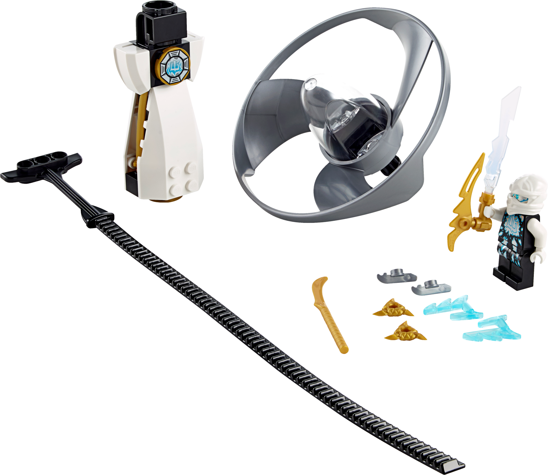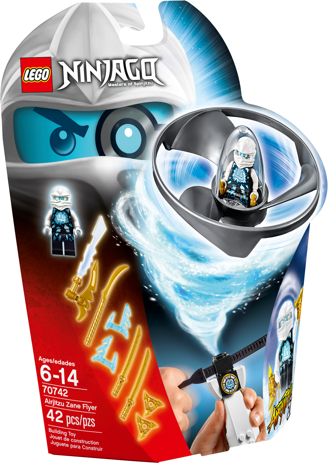 Build, rip and spin into battle with Zane! Spin high into the air with the awesome LEGO® NINJAGO™ Zane Flyer! Zane is equipped with cool Ninja weapons, kitted out in his special Airjitzu outfit and ready to take on the army of Ghost Ninja. So build the flyer, attach the minifigure capsule to the vortex rotor and pull the rip cord to launch the Ninja hero into the air. The harder you pull, the faster the flyer will spin! This set includes a Zane minifigure, buildable LEGO brick handle, vortex rotor, minifigure capsule, rip cord, plus assorted elements: Zane’s 2 ice sai, Polearm, Blighter, 2 golden shurikens, 2 swords and ice skates. Includes Zane minifigure with 8 weapon elements Features a buildable LEGO® brick handle, vortex rotor, minifigure capsule and a rip cord Weapon elements include Zane’s 2 ice sai, Polearm, Blighter, 2 golden shurikens and 2 swords Zane’s ice skate elements also included Zane minifigure features his own cool Airjitzu decoration (new for fall 2015) Build Zane’s own personal flyer Pull the rip cord to launch Zane spinning into the sky! Master the ancient art of Airjitzu! Recreate your favorite Airjitzu scenes from the NINJAGO™: Masters of Spinjitzu TV show Collect the entire LEGO® NINJAGO™ Airjitzu Flyer series for thrilling aerial battles! Measures over 5” (14cm) high, 3” (10cm) long and 3” (10cm) wide