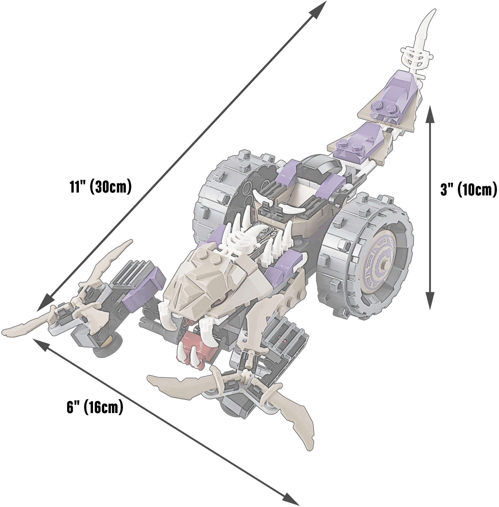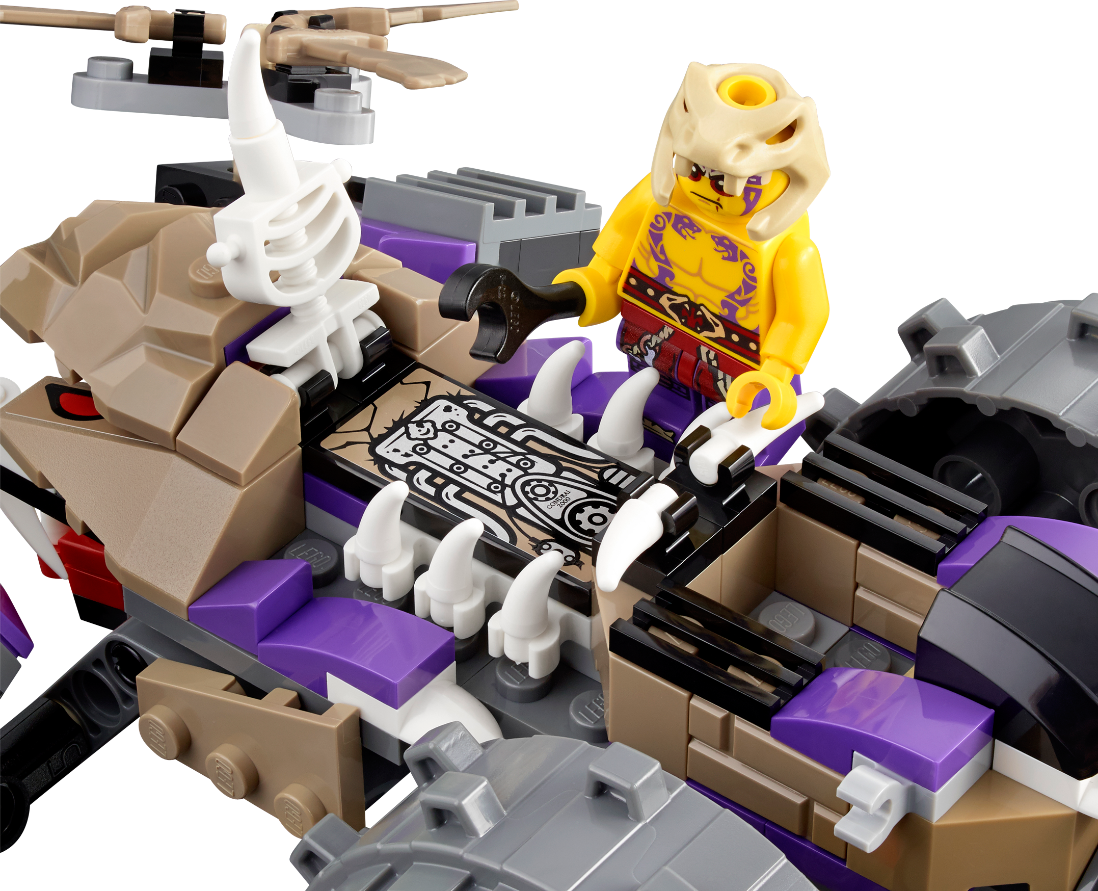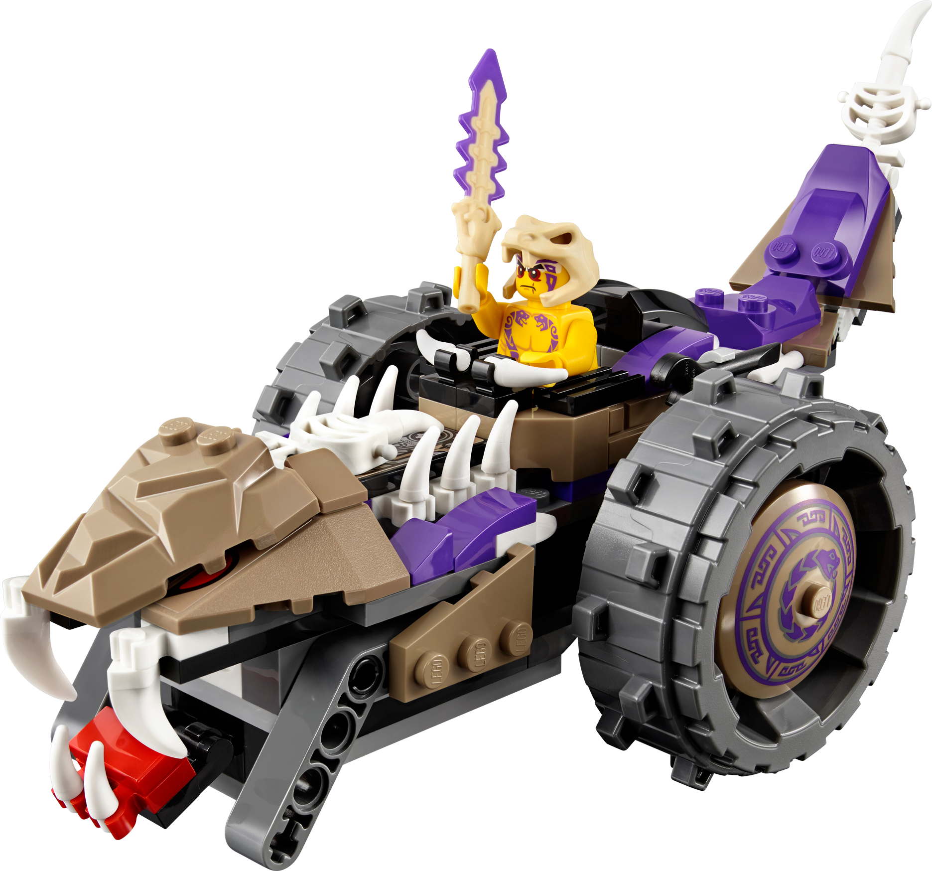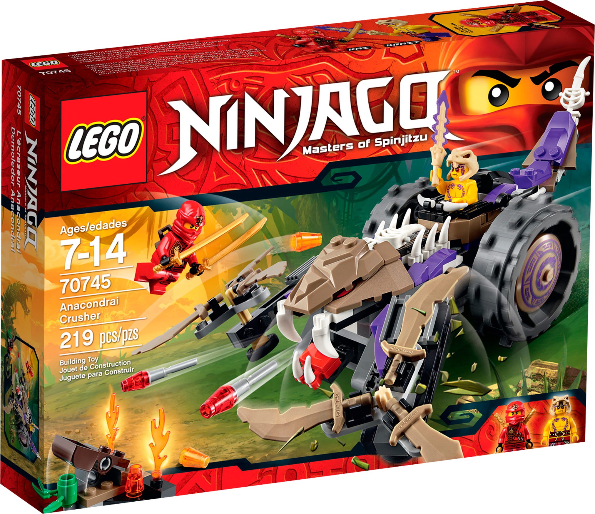 Help Kai take on the awesome Anacondrai Crusher! Deep in the island’s jungle, Kai is under attack from the fearsome Anacondrai Crusher, piloted by Anacondrai warrior Krait. Summon Kai’s elemental powers and build a fire wall to block the Anacondrai Crusher’s path. Evade this destructive vehicle’s dual spinning blades as it powers forward, leap away from its swiping tail and run for cover if the snake’s mouth opens – there’s a hidden dual poison dart shooter inside. Fire back with Kai’s catapult and capture Krait before he escapes from the jungle! Includes 2 minifigures with assorted weapons: Kai and Krait. Includes 2 minifigures with assorted weapons: Kai and Krait Anacondrai Crusher features a cockpit, huge wheels, cool snake details, whipping tail, opening bone engine hood with engine details underneath, opening mouth with dual poison dart shooter and dual spinning blades Kai’s fire wall features a catapult, fire balls and translucent flame elements Weapons include Krait’s Anacondrai Blade and Kai’s 2 swords Stay clear of the Anacondrai Crusher’s swiping tail Dodge the dangerousdual spinning blades Swerve out of the way of the poison dart shooter Return fire with Kai’s catapult Recreate your favorite scenes from the NINJAGO Masters of Spinjitzu™ TV show Anacondrai Crusher measures over 3” (10cm) high, 11” (30cm) long and 6” (16cm) wide Kai’s fire wall measures over 1” (3cm) high, 1” (4cm) wide and 1” (5cm) deep