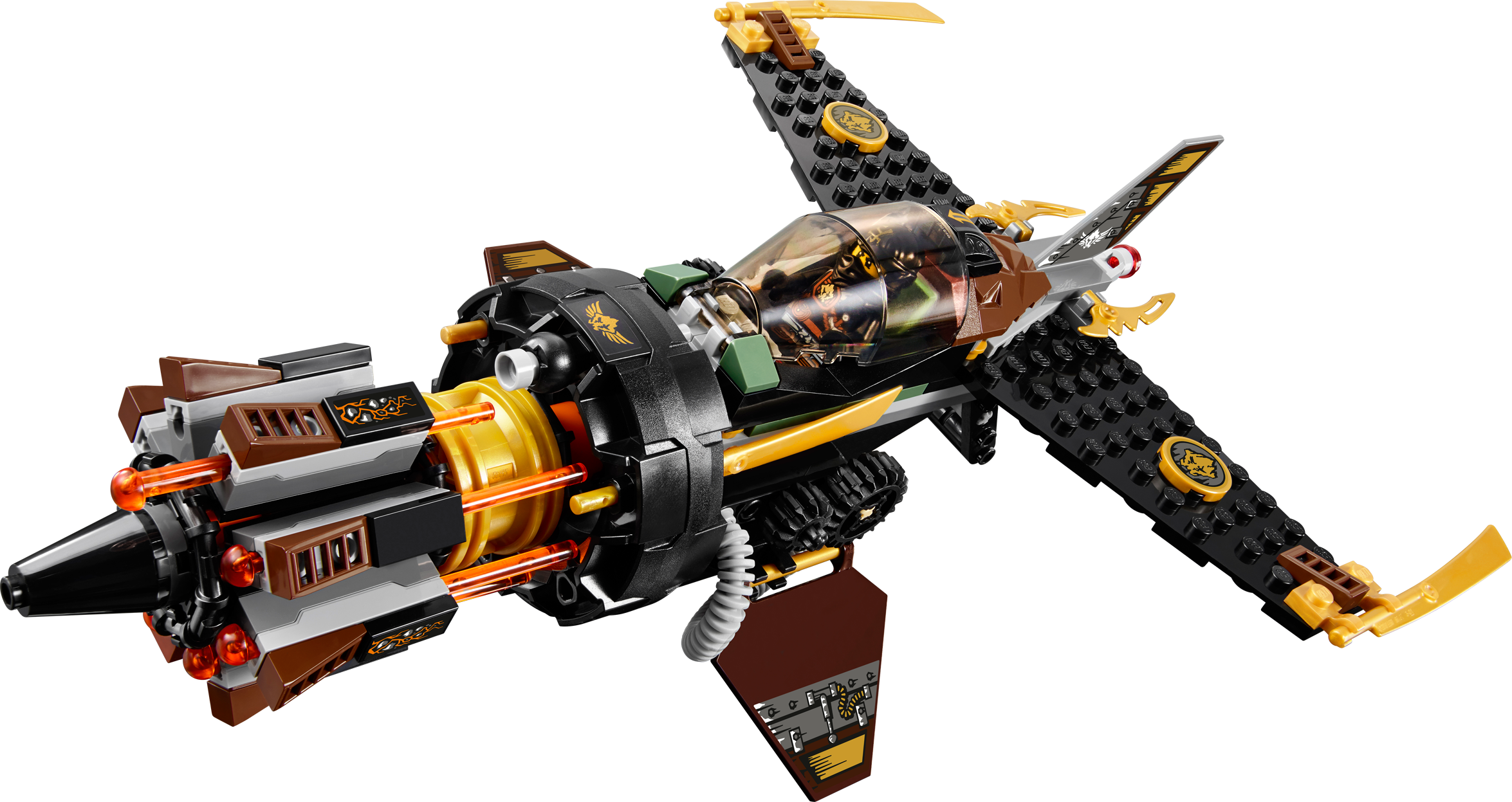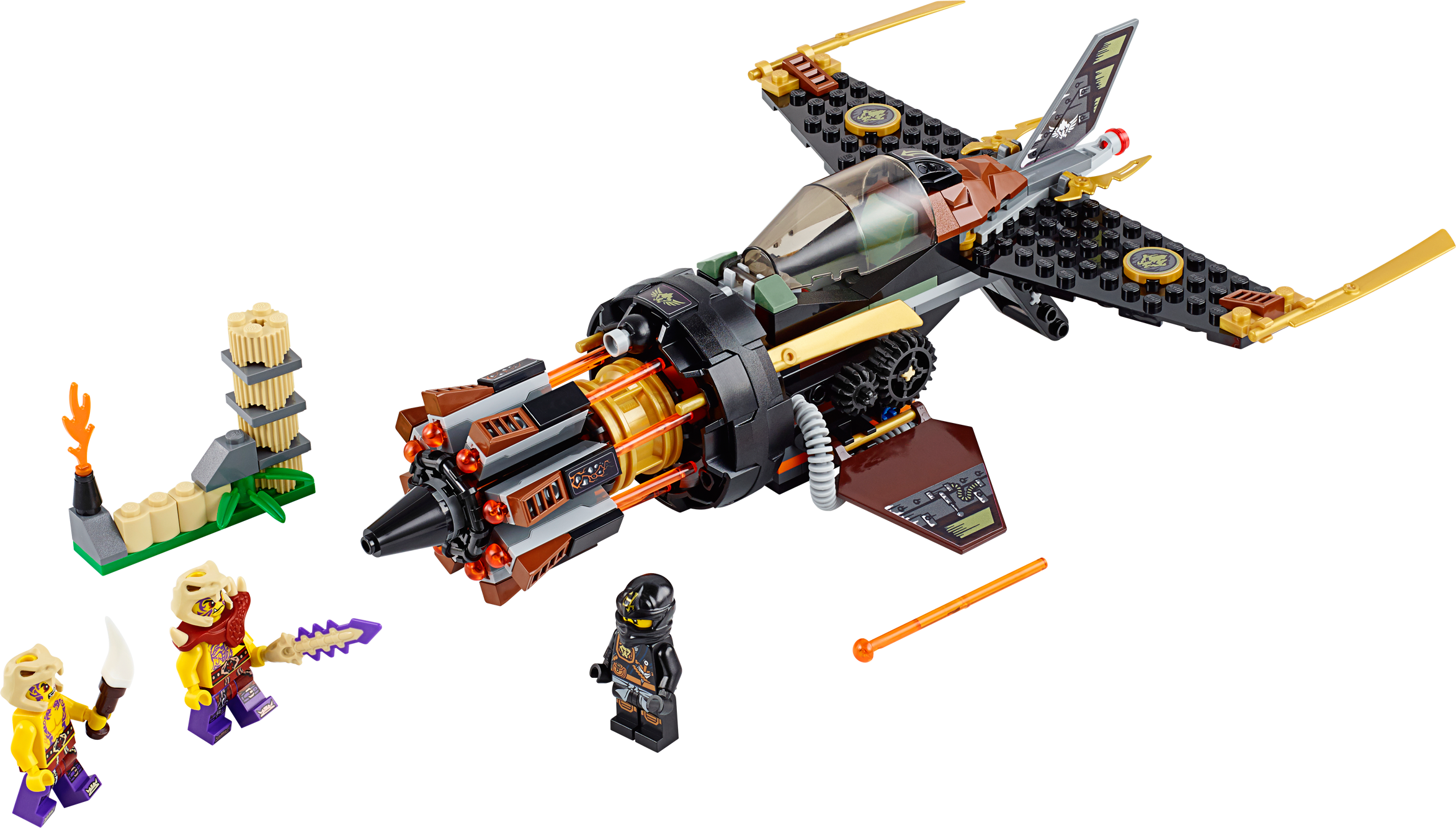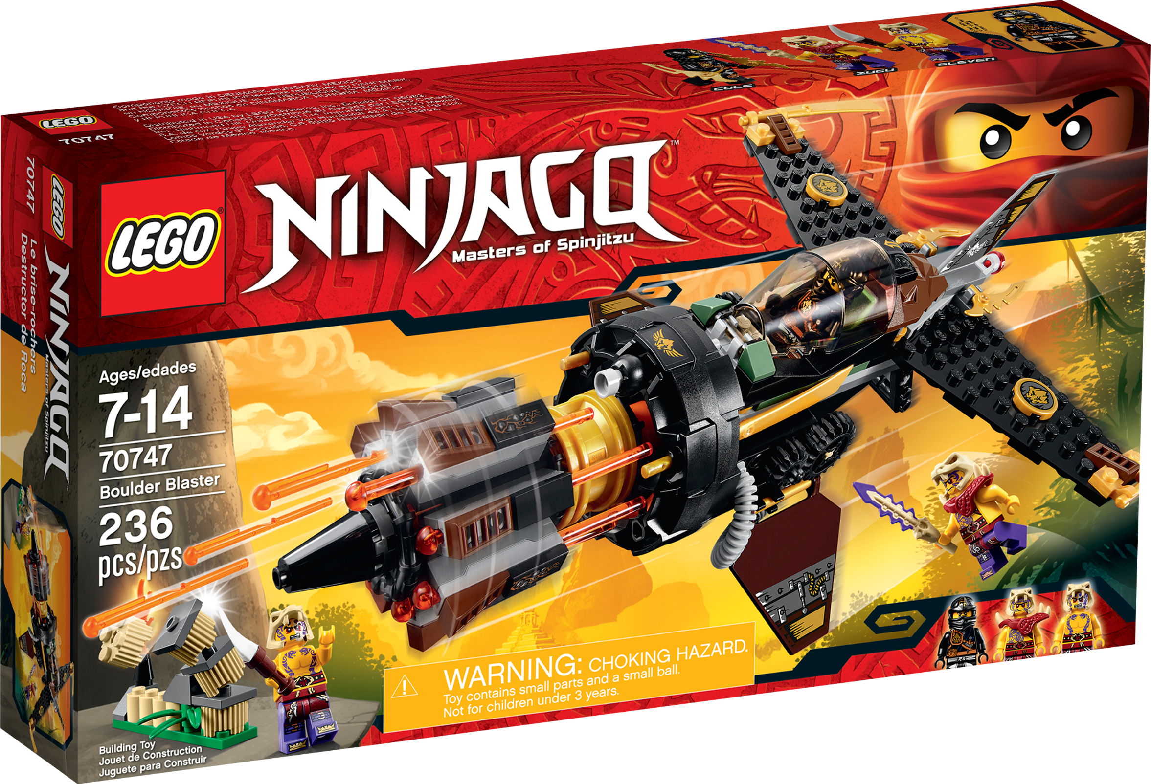 Break out of the caves with Cole in the Boulder Blaster! Cole has been imprisoned in the island caves during the Tournament of Elements. Place him in the cockpit of the super Boulder Blaster, grab the retractable handle to take off and bust out of there. Cole will need all his elemental powers to get past Zugu and Sleven who are armed and ready for battle. Turn the wheel to unleash the hyper-powerful automatic 8-missile NINJAGO™ rapid shooter and smash their Anacondrai outpost to smithereens! Includes 3 minifigures with assorted weapons: Cole, Zugu and Sleven. Includes 3 minifigures with assorted weapons: Cole, Zugu and Sleven Boulder Blaster features an 8-missile spring-loaded NINJAGO™ rapid shooter, opening cockpit, rotating gears, adjustable wings, attachment points for Cole’s weapons and Ninja gold blade details Also includes Anacondrai outpost with a flame torch Weapons include Cole’s 2 jagged blades, Zugu’s Anacondrai Blade and Sleven’s dagger Open the cockpit and place Cole at the controls Hold the retractable handle and guidethe Boulder Blaster Adjust the wings and rotate the gears to shoot the missiles Destroy the Anacondrai outpost with the 8-missile NINJAGO™ rapid shooter! Recreate your favorite scenes from the NINJAGO Masters of Spinjitzu™ TV show Boulder Blaster measures over 3” (8cm) high, 11” (28cm) long and 7” (20cm) wide Anacondrai outpost measures over 1” (4cm) high, 2” (6cm) wide and 1” (4cm) deep