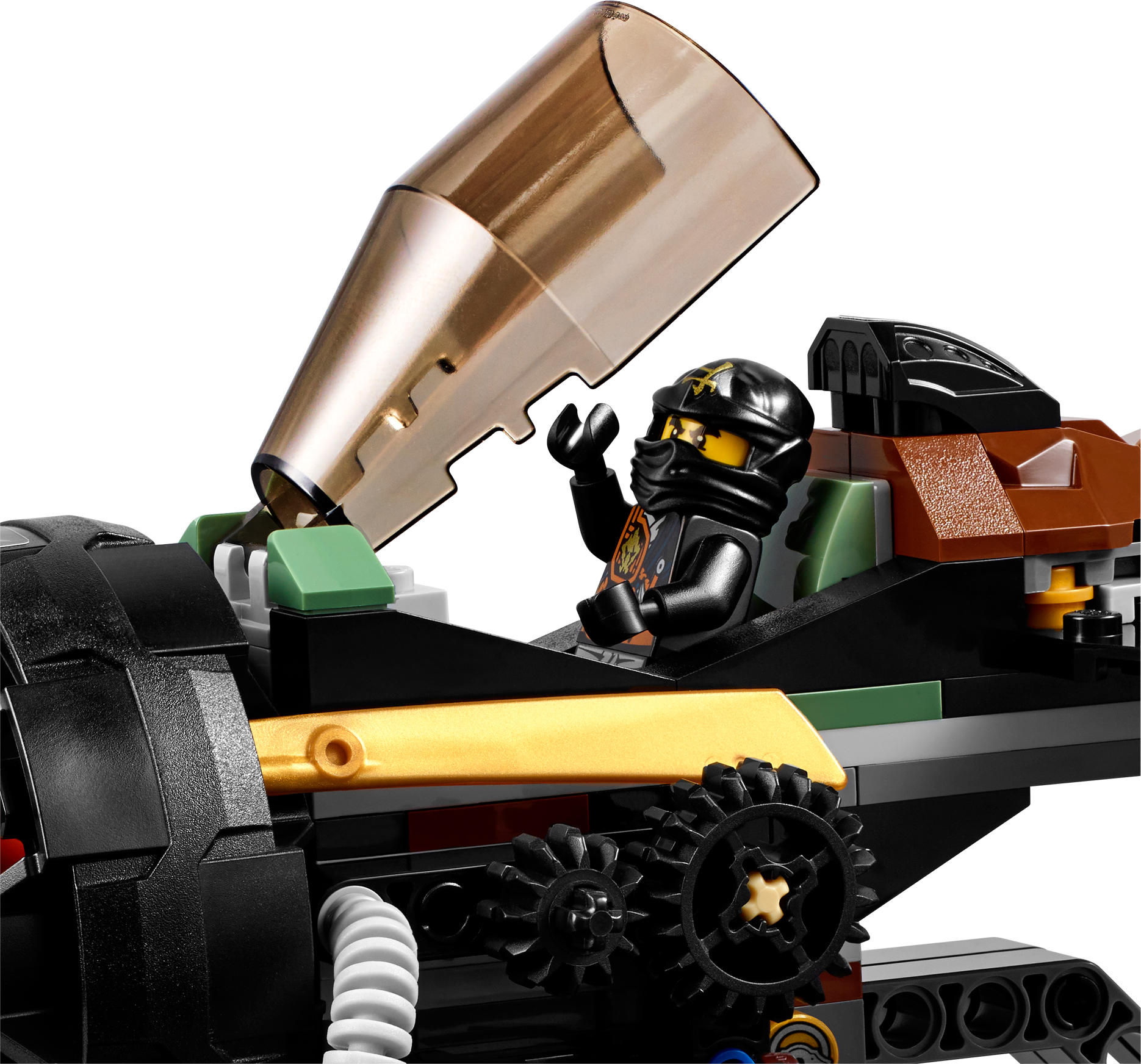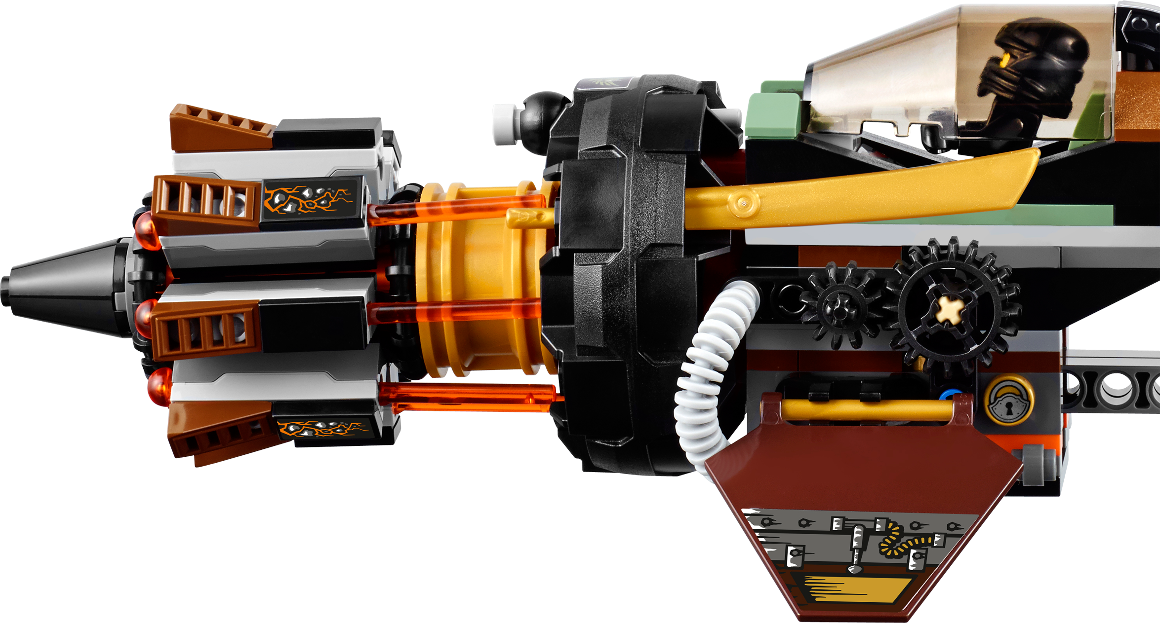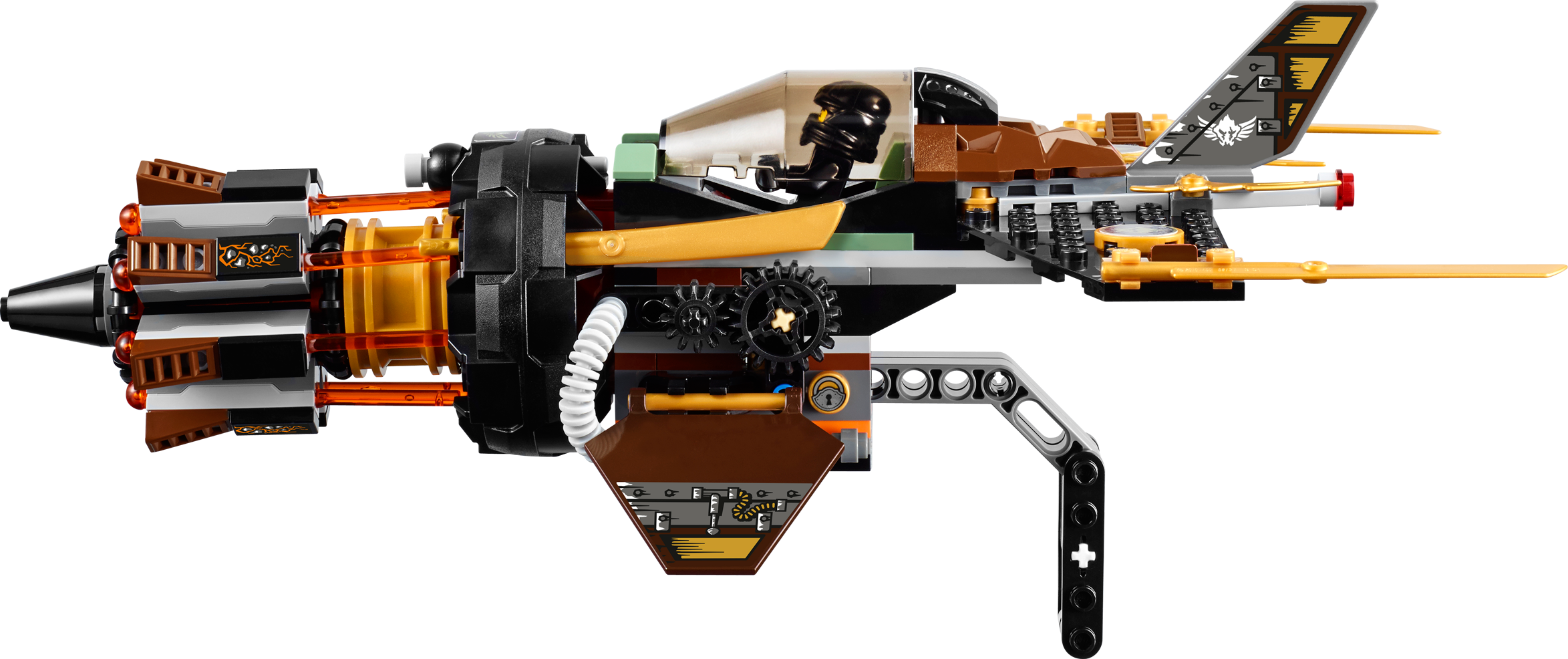 Break out of the caves with Cole in the Boulder Blaster! Cole has been imprisoned in the island caves during the Tournament of Elements. Place him in the cockpit of the super Boulder Blaster, grab the retractable handle to take off and bust out of there. Cole will need all his elemental powers to get past Zugu and Sleven who are armed and ready for battle. Turn the wheel to unleash the hyper-powerful automatic 8-missile NINJAGO™ rapid shooter and smash their Anacondrai outpost to smithereens! Includes 3 minifigures with assorted weapons: Cole, Zugu and Sleven. Includes 3 minifigures with assorted weapons: Cole, Zugu and Sleven Boulder Blaster features an 8-missile spring-loaded NINJAGO™ rapid shooter, opening cockpit, rotating gears, adjustable wings, attachment points for Cole’s weapons and Ninja gold blade details Also includes Anacondrai outpost with a flame torch Weapons include Cole’s 2 jagged blades, Zugu’s Anacondrai Blade and Sleven’s dagger Open the cockpit and place Cole at the controls Hold the retractable handle and guidethe Boulder Blaster Adjust the wings and rotate the gears to shoot the missiles Destroy the Anacondrai outpost with the 8-missile NINJAGO™ rapid shooter! Recreate your favorite scenes from the NINJAGO Masters of Spinjitzu™ TV show Boulder Blaster measures over 3” (8cm) high, 11” (28cm) long and 7” (20cm) wide Anacondrai outpost measures over 1” (4cm) high, 2” (6cm) wide and 1” (4cm) deep