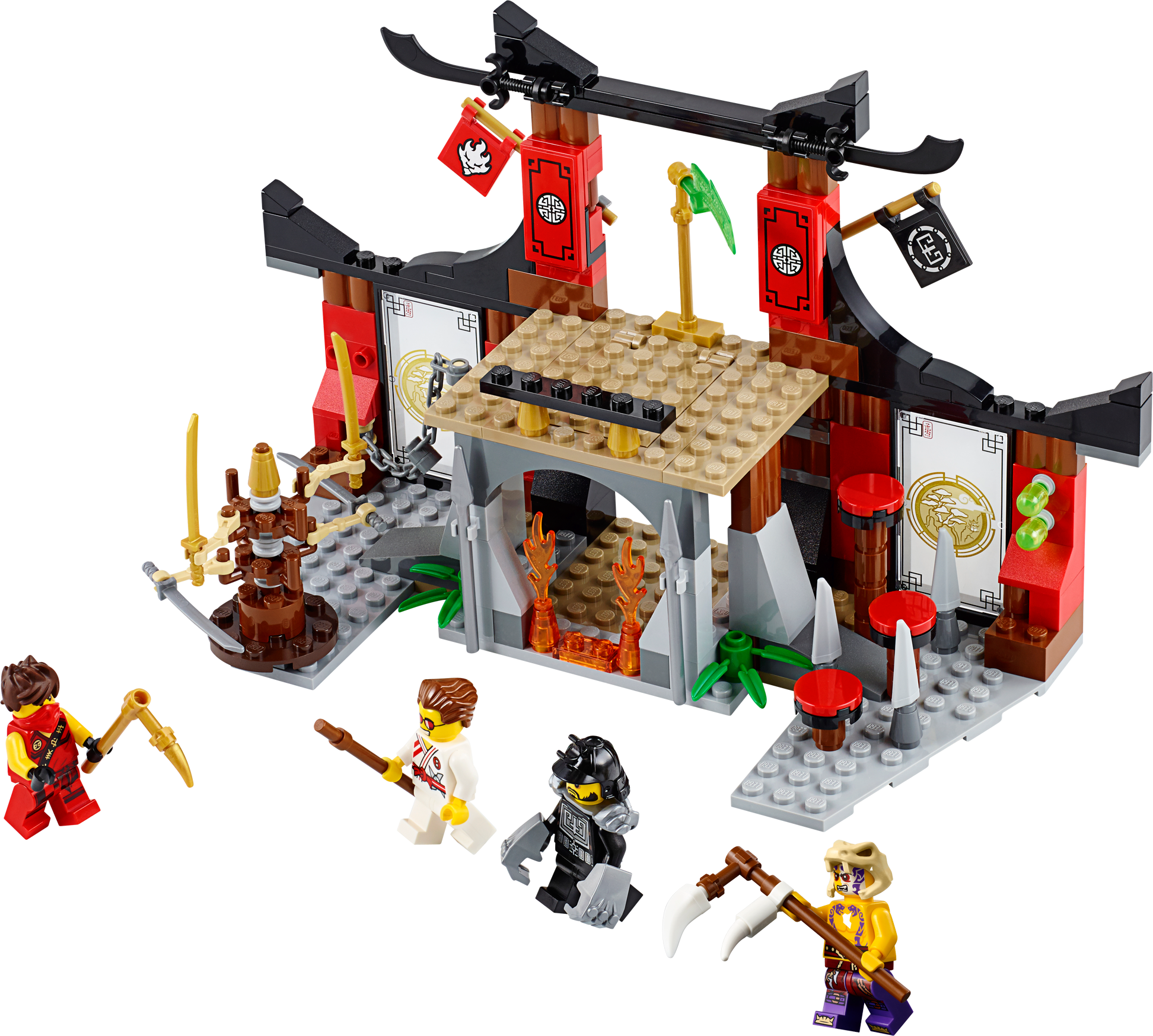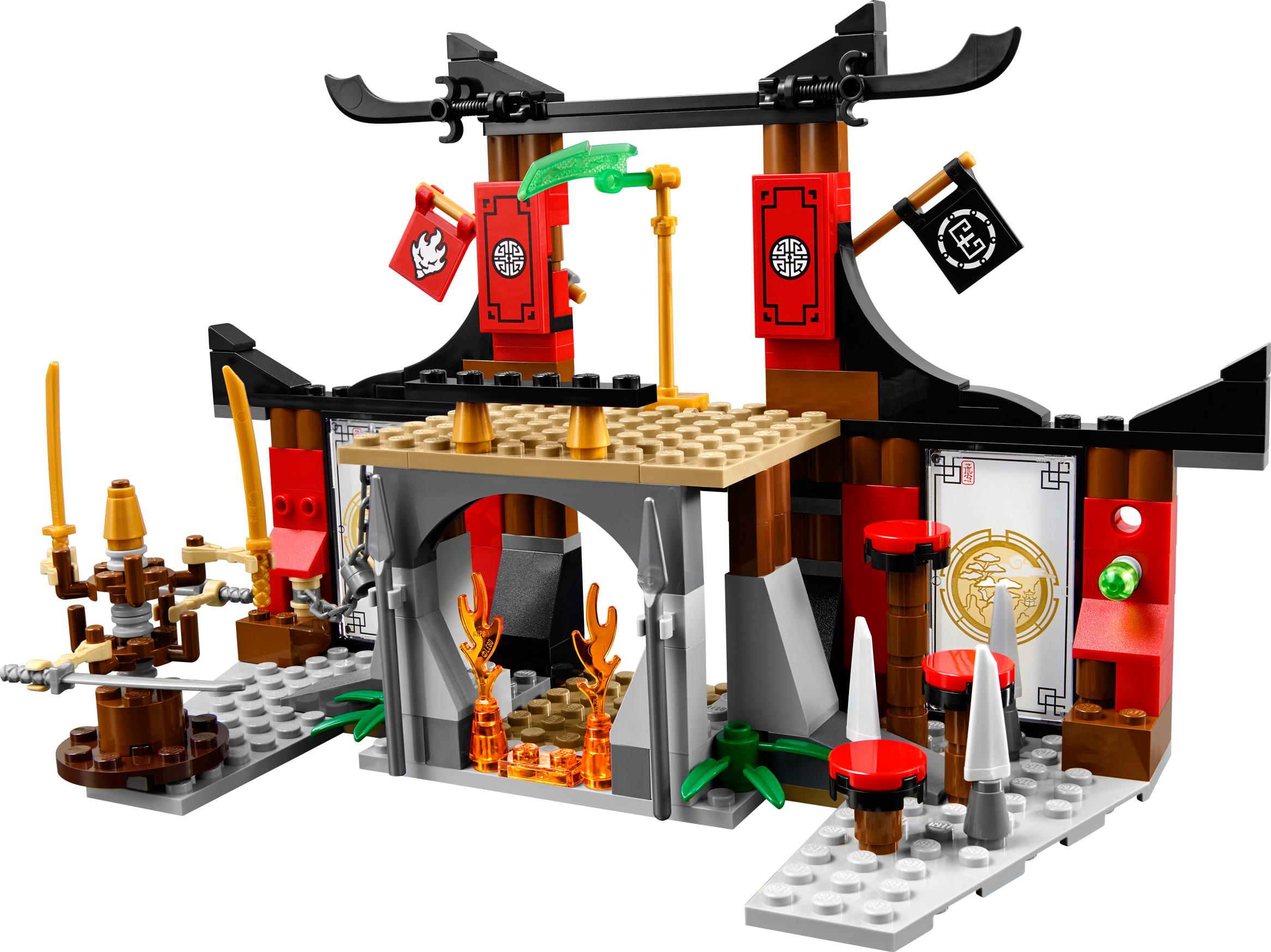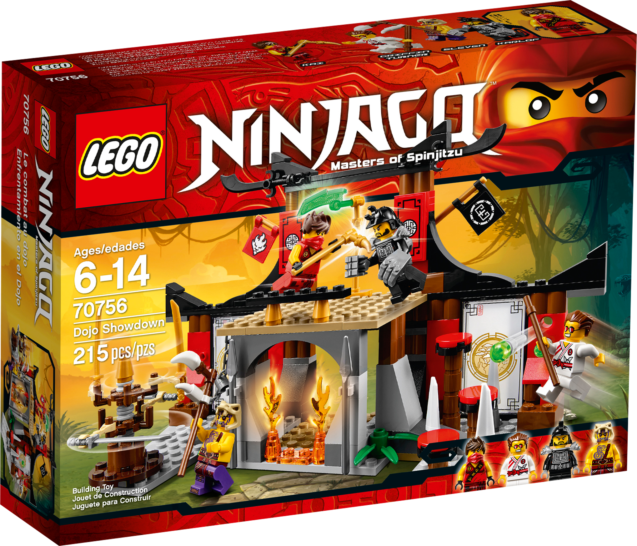 Battle for the Jade Blade in the Dojo Showdown! Join Kai for a thrilling Tournament of Elements showdown at the Dojo! Show speed and agility to dodge the dangerous spinning blade bot and climb the wall parkour-style. Grab the chain or take the steps to reach the top of the Dojo, but beware of the poison dart flick missiles. Battle against Griffin Turner and Karlof, evading Karlof’s huge crushing hands, and grab the Jade Blade. Just don’t fall through the trapdoor into the fire prison because there’s no way out! Includes 4 minifigures with weapons: Kai, Sleven, Griffin Turner and Karlof. Includes 4 minifigures with weapons: Kai, Sleven, Griffin Turner and Karlof Features a fight platform with trapdoor and fire prison below with flame elements, the Jade Blade, 2 poison dart flick missiles, climbing wall, 3 steps, chain, spikes, spinning blade bot with 4 spinning blades, plus Tournament of Elements decorative elements, flags and pictures Weapons include Kai’s scythe, Sleven’s scythe and Griffin Turner’s bo staff Kai in his tournament outfit and Griffin Turner and Karlofare exclusive to this set Test your agility with the spinning blade bot training aid Climb the wall, parkour-style! Evade the poison darts Scale the steps or chain to reach the top of the Dojo Dodge Karlof’s big crushing hands Don’t fall through the trapdoor into the fire prison! Claim the Jade Blade and advance to the next round of the tournament! Recreate your favorite scenes from the NINJAGO Masters of Spinjitzu™ TV show Dojo measures 5” (13cm) high, 9” (23cm) wideand 3” (10cm) deep Training aid/trap measures 2” (7cm) high, 3” (8cm) wide and 1” (3cm) deep