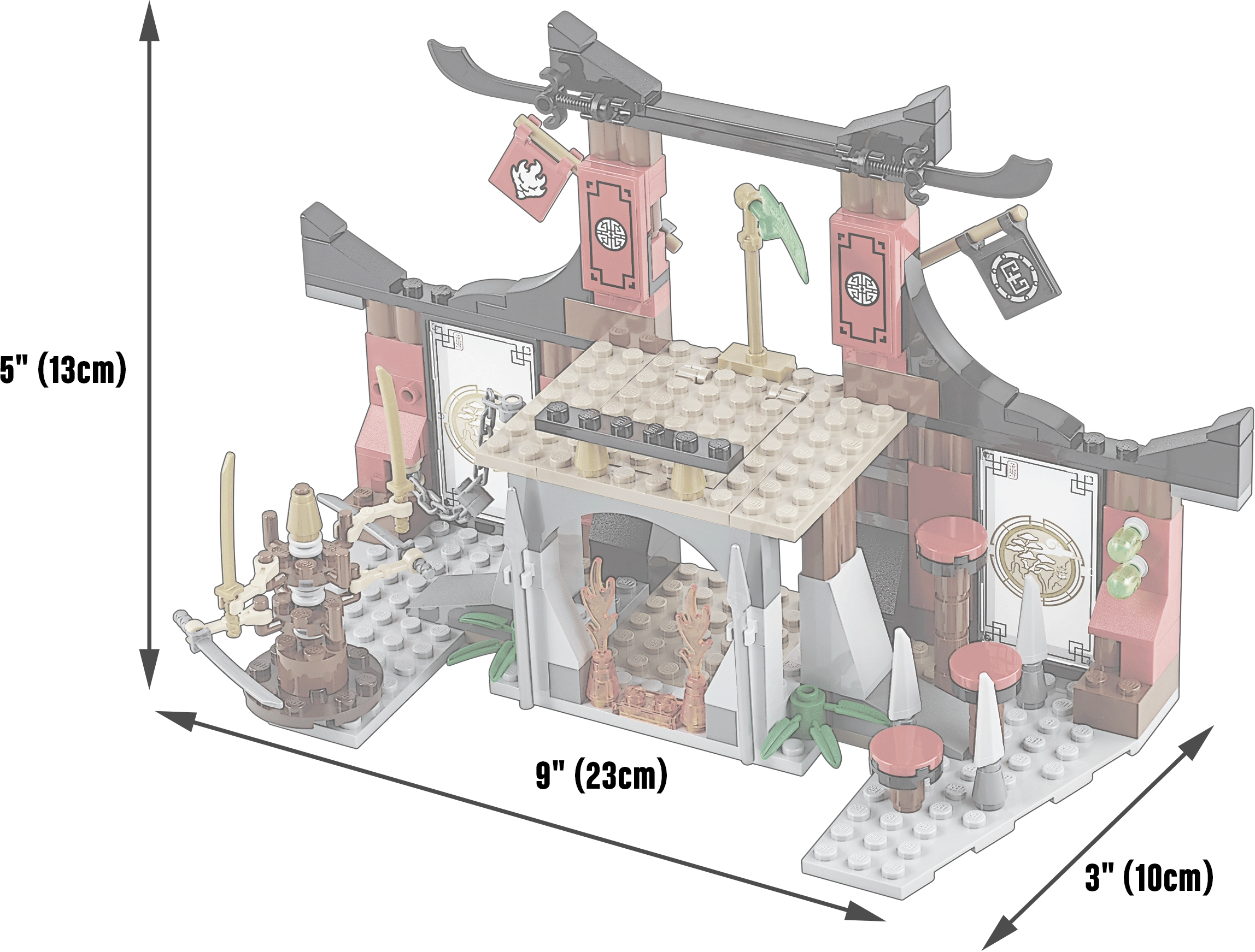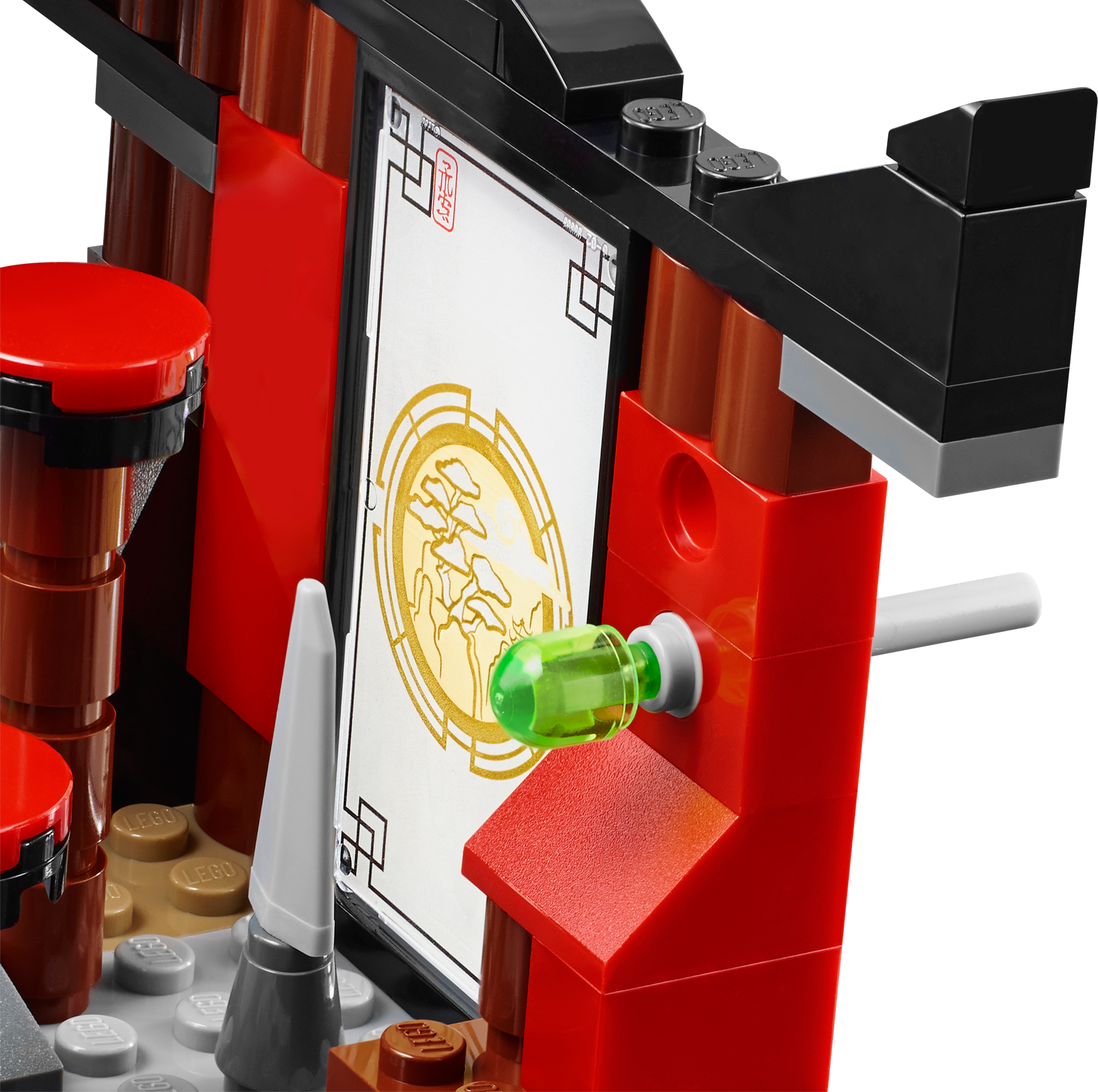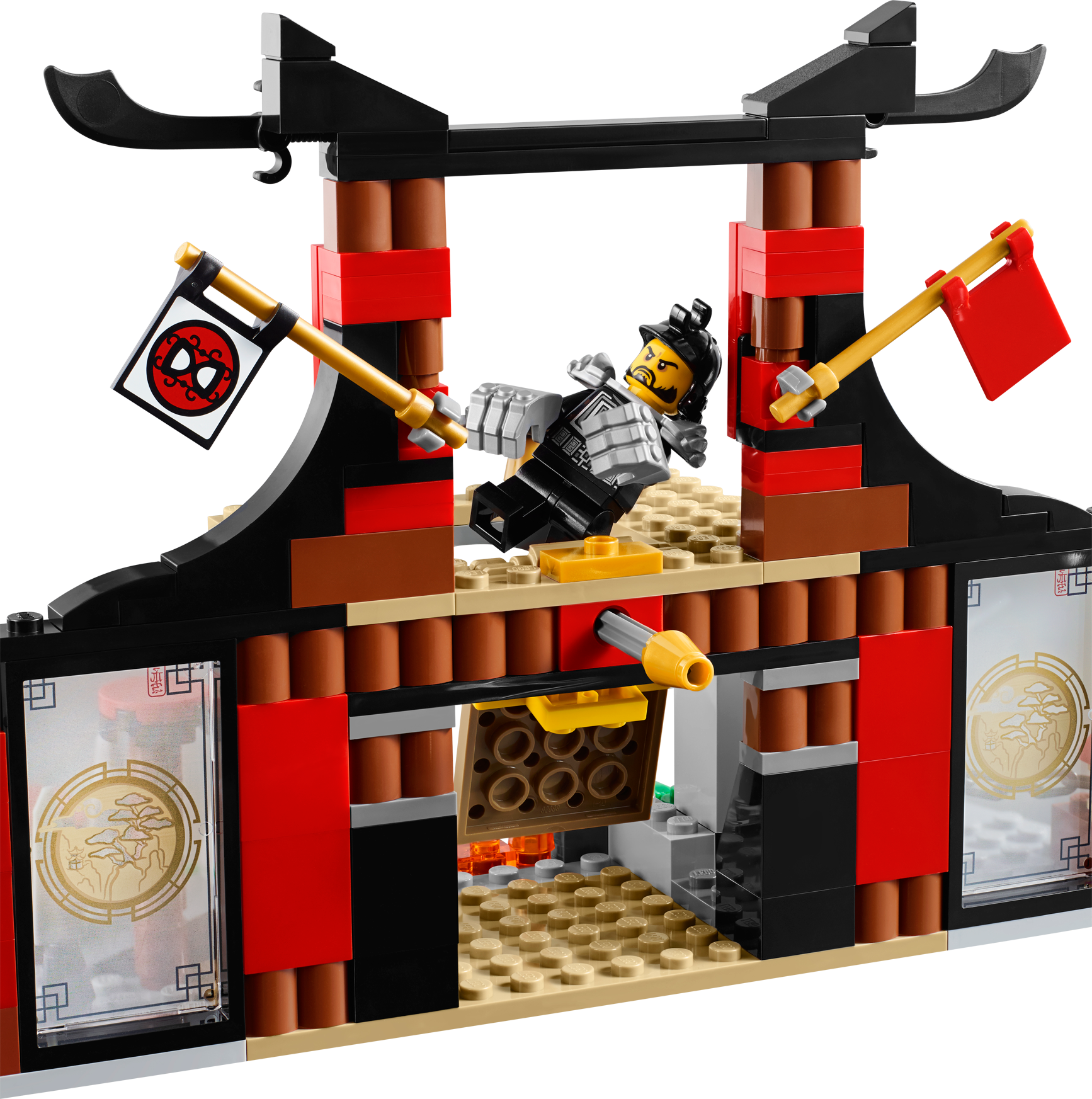 Battle for the Jade Blade in the Dojo Showdown! Join Kai for a thrilling Tournament of Elements showdown at the Dojo! Show speed and agility to dodge the dangerous spinning blade bot and climb the wall parkour-style. Grab the chain or take the steps to reach the top of the Dojo, but beware of the poison dart flick missiles. Battle against Griffin Turner and Karlof, evading Karlof’s huge crushing hands, and grab the Jade Blade. Just don’t fall through the trapdoor into the fire prison because there’s no way out! Includes 4 minifigures with weapons: Kai, Sleven, Griffin Turner and Karlof. Includes 4 minifigures with weapons: Kai, Sleven, Griffin Turner and Karlof Features a fight platform with trapdoor and fire prison below with flame elements, the Jade Blade, 2 poison dart flick missiles, climbing wall, 3 steps, chain, spikes, spinning blade bot with 4 spinning blades, plus Tournament of Elements decorative elements, flags and pictures Weapons include Kai’s scythe, Sleven’s scythe and Griffin Turner’s bo staff Kai in his tournament outfit and Griffin Turner and Karlofare exclusive to this set Test your agility with the spinning blade bot training aid Climb the wall, parkour-style! Evade the poison darts Scale the steps or chain to reach the top of the Dojo Dodge Karlof’s big crushing hands Don’t fall through the trapdoor into the fire prison! Claim the Jade Blade and advance to the next round of the tournament! Recreate your favorite scenes from the NINJAGO Masters of Spinjitzu™ TV show Dojo measures 5” (13cm) high, 9” (23cm) wideand 3” (10cm) deep Training aid/trap measures 2” (7cm) high, 3” (8cm) wide and 1” (3cm) deep