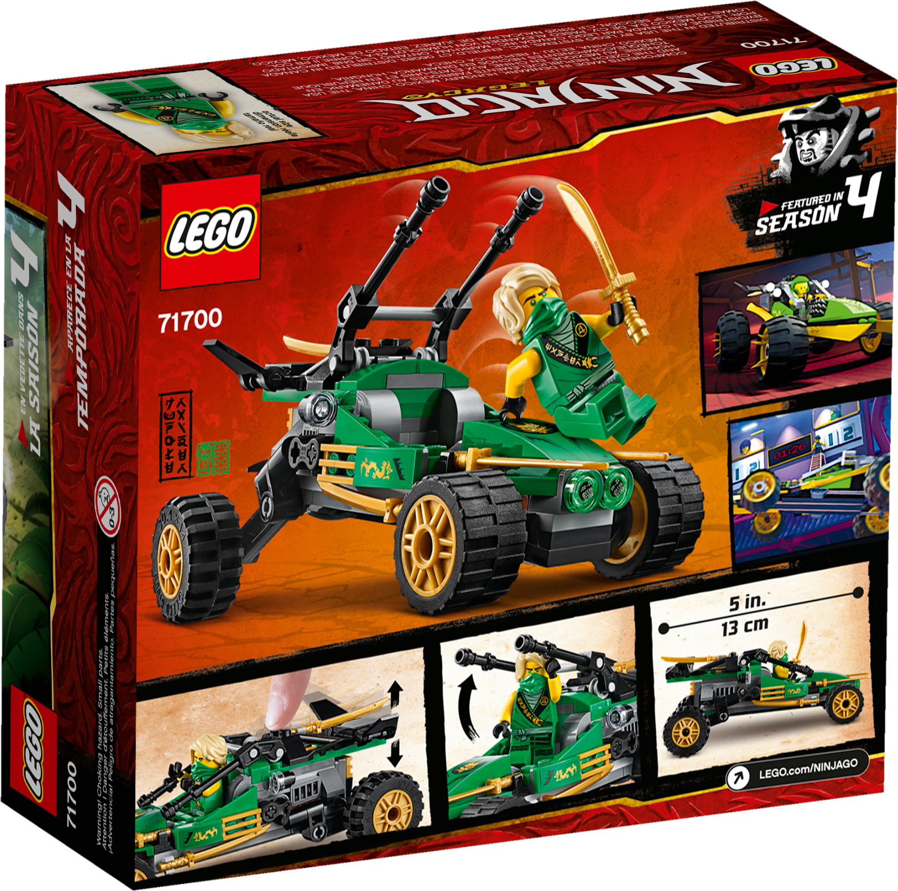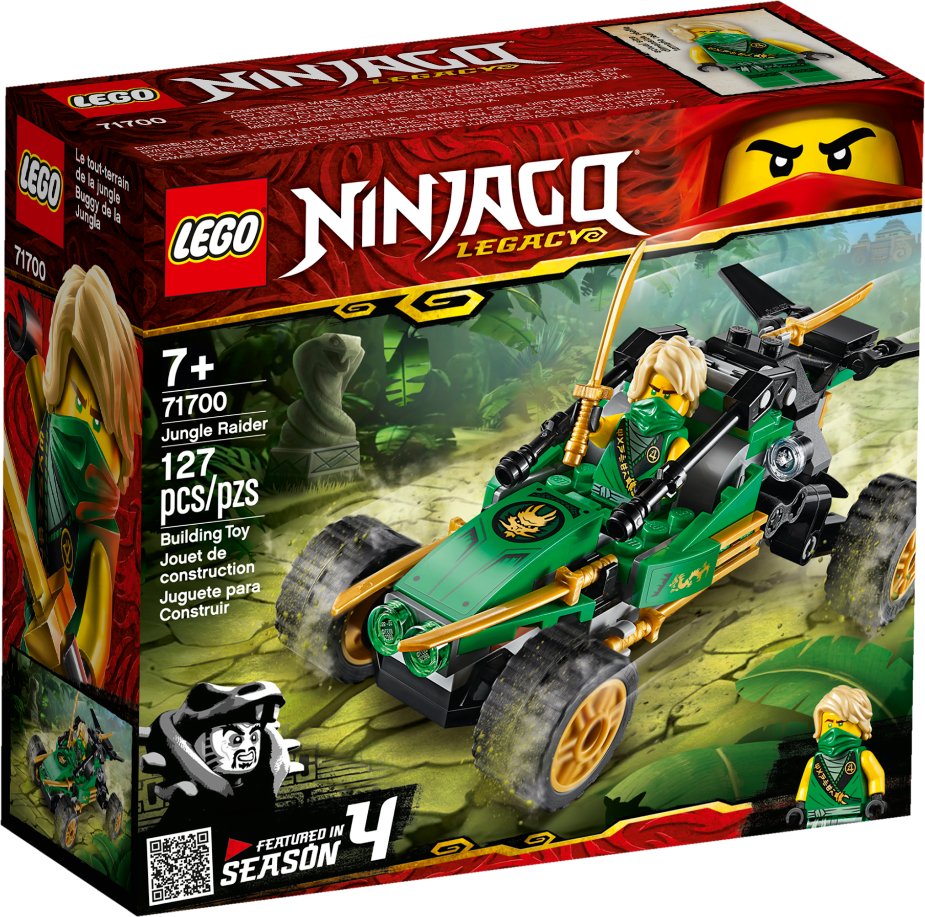 Kids who love bringing to life classic LEGO® NINJAGO® Legacy adventure toys and have a passion for playing with toy buggys will be thrilled with this Jungle Raider (71700). After assembling it from building bricks they can plot exciting action scenes from the Tournament of Elements as the ninja action figure of Lloyd enjoys epic adventures in the jungle.A new and exciting way to build cool toys for kidsInstructions PLUS offers a digital and interactive guide to building this jungle toy. Available in the free LEGO Life app, it has zoom-and-rotate viewing tools to help young children build this cool LEGO building brick model.The best building kits for kidsLEGO NINJAGO adventure toys give kids a passport to an action-packed world where they can express themselves with independent play as they create stories around the ninja warriors. Youngsters are guaranteed endless fun as they play with a range of ninja toys, including jungle toys, jet planes, dragons, NINJAGO vehicles and more.LEGO® NINJAGO® Legacy play set featuring Jungle Raider toy buggy and Lloyd ninja action figure from season 4 of the TV series. Kids who love ninja models can enjoy hours of independent play or share the fun with friends.This building kit for kids includes a toy buggy with large rubber tires for racing and a ninja warrior Lloyd minifigure wielding a golden sword. Kids have all they need to stage scenes from the Tournament of Elements.A modern update of the Jungle Raider from NINJAGO® Masters of Spinjitzu, this ninja toy has a cool suspension feature where kids can press down and watch it spring up. Kids can stage races or display in their bedrooms.This 127-piece top toy makes a rewarding building task for boys and girls aged 7+ and is a great birthday gift for kids. The ninja build will inspire imaginative play from children who revere the team of young ninjas.This LEGO® NINJAGO® ninja build and mini ninjas are just the right size to play with at home or take with youwherever you go. The toy buggy measures over 2” (7cm) high, 5” (14cm) long and 3” (8cm) wide.No wasting time hunting around for batteries with this ninja toy! None are required – all that is needed to enjoy this set are children’s active imaginations.Paper instructions are good, but LEGO® playsets provide something even better for the building process: Digital Instructions PLUS on the free LEGO Life app feature modes like zoom, rotate and ghost to help kids create top toys.LEGO® NINJAGO® collectible action toys and mini action figures provide kids with a passport to a thrilling world of fantasy action and allow them to create stories with their favorite ninjas.LEGO® building bricks have met the highest industry standards for more than 60 years, ensuring they are always consistent, compatible and pull apart with ease every time, whether on Earth or in NINJAGO® city!These LEGO® bricks and pieces have been relentlessly tested and meet the highest global safety and quality standards. You know you have peace of mind with LEGO building kits.