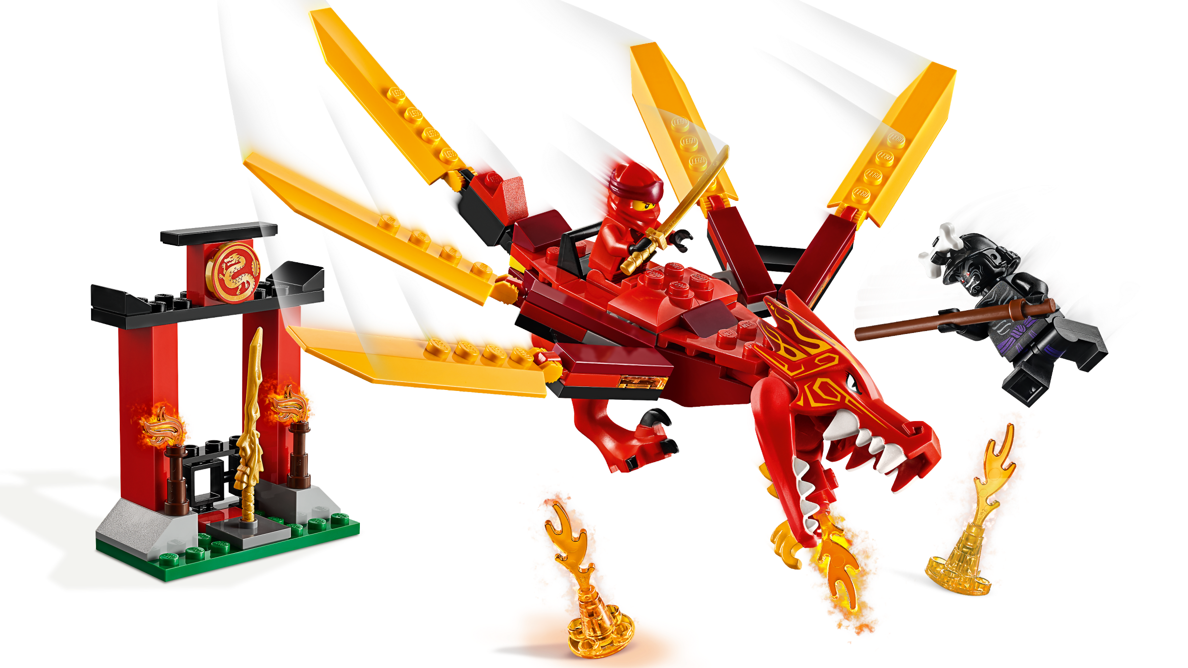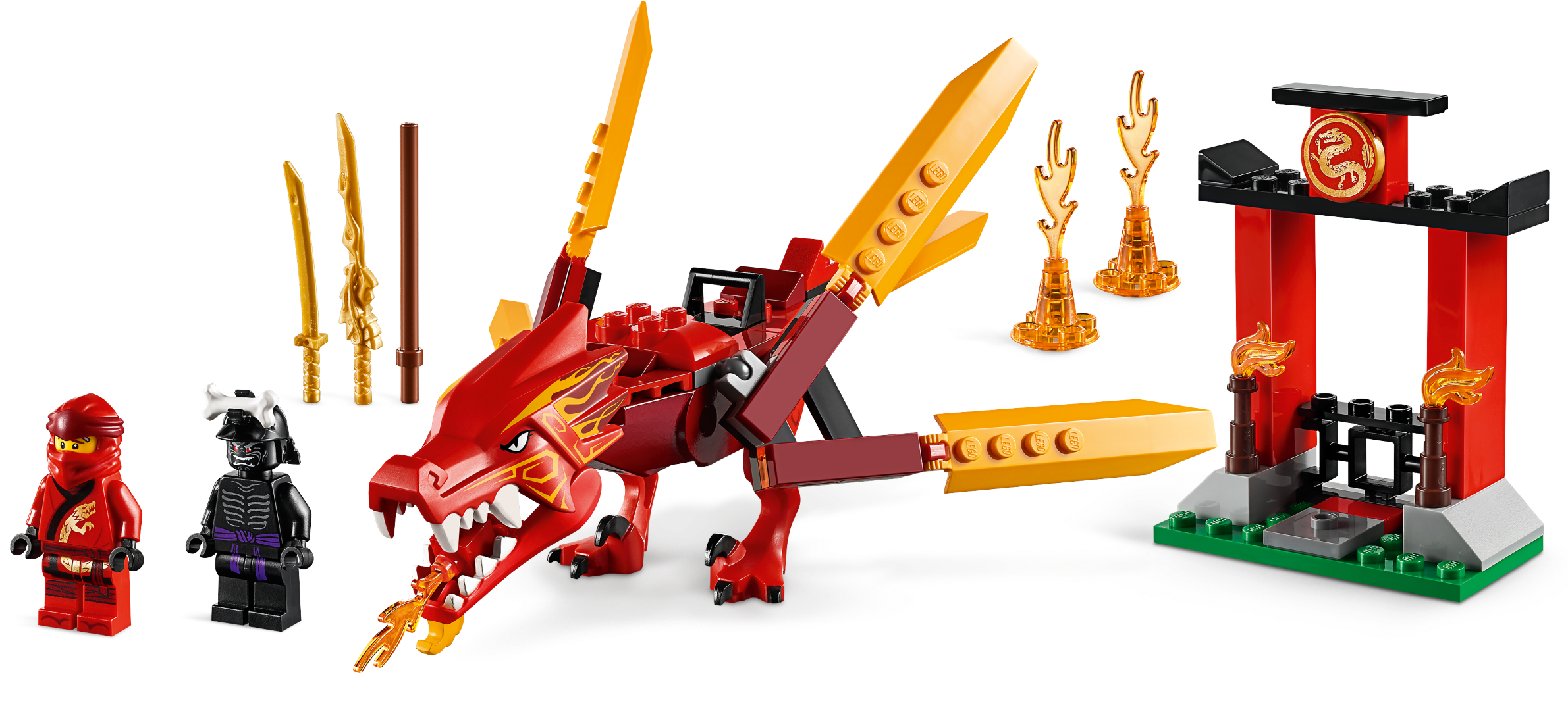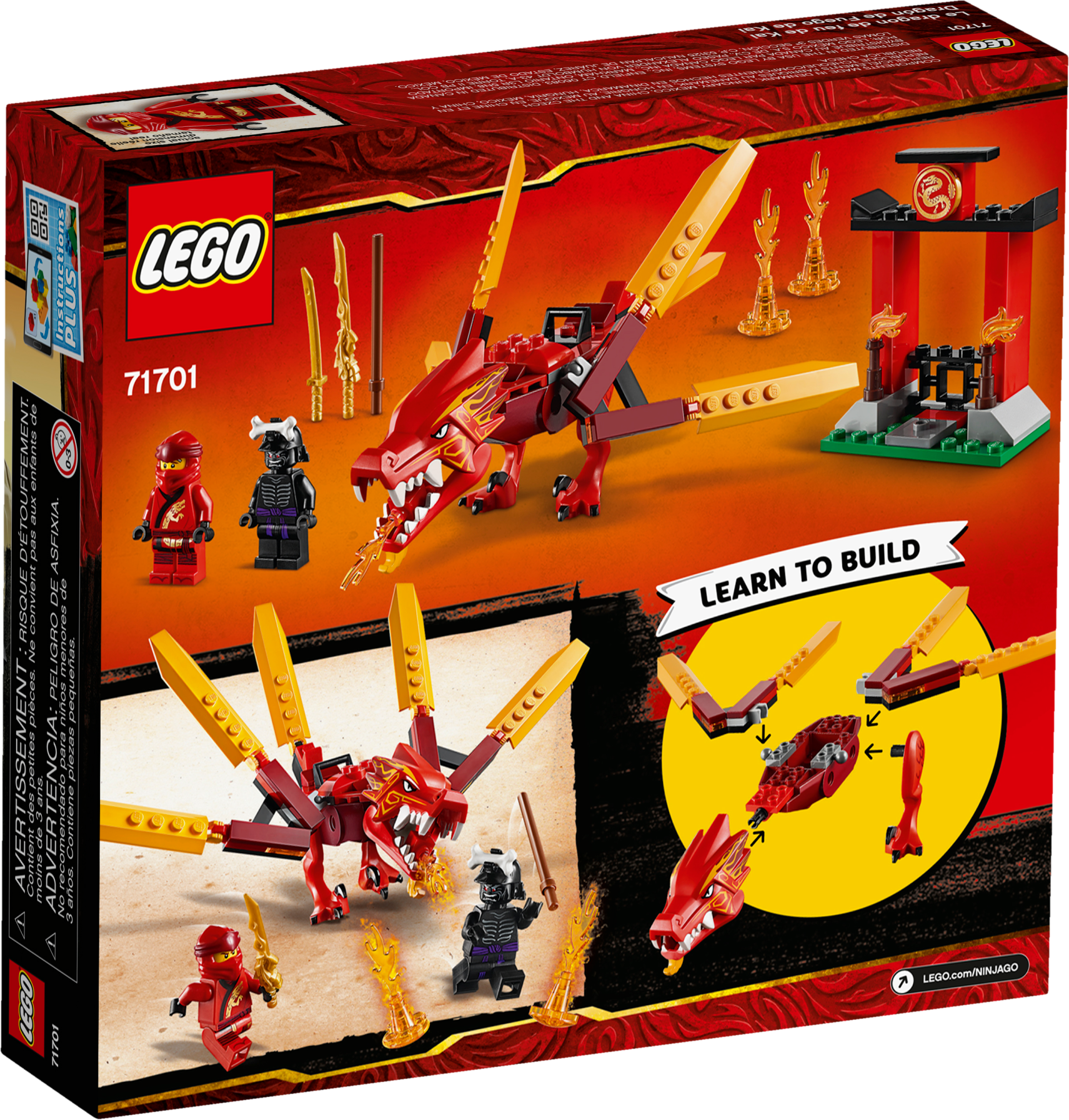 LEGO® NINJAGO® fans can recreate famous scenes from season 1 of the TV series with this upgraded legacy red dragon toy and 2 minifigures. Kai’s Fire Dragon (71701) must stop Lord Garmadon snatching the Sword of Fire from the mini fire temple. Kids are sure to be entertained for hours as they escape into this fantasy world.The new way to build toys for kidsLEGO fans now have a new and interactive way to build this dragon toy figure: the digital Instructions PLUS via the free LEGO Life app on smartphones and tablets. Zoom, rotate and view this ninja dragon as it comes to life on a screen and in front of you.Welcome to 4+!LEGO NINJAGO® 4+ toys offer preschool kids a gateway to an action-packed world where they can let their imaginations run wild as they learn to build their favourite characters, vehicles and buildings. With Starter Brick bases to make the process simpler, these sets are specially designed so first-time builders can experience the pride of constructing all on their own.LEGO® NINJAGO® Legacy playset featuring Kai and his Fire Dragon from season 1 of the TV series for epic battles against Lord Garmadon. This cool toy for kids will help them learn to build with confidence.This ninja toy has a Starter Brick base to help youngsters learn to build and create role-play stories with NINJAGO® Kai, his Fire Dragon, Lord Garmadon, a mini fire temple with the Sword of Fire, and 2 fire elements. This Red Dragon toy is highly posable, and can move its legs, wings, tail, head and mouth as it battles alongside Kai against Lord Garmadon. Kids can devise stories as they seek to protect the Sword of Fire. This 81-piece dragon toy provides a fun building experience for preschoolers and youngsters aged 4+ and makes a great birthday gift for kids, Xmas present, or LEGO® gift for any occasion. New for January 2020, this is an update on the LEGO® NINJAGO® dragon toy from season 1 of the TV series. The ninja dragon measures over 2” (6cm) high, 2” (6cm) long and9” (23cm) wide – the perfect size to play with anywhere. No batteries are needed for this LEGO® NINJAGO® dragon – it’s can be played with right out of the box. The dragon toy figure is powered by kids’ imaginations, so the quest to protect the Sword of Fire never has to stop. The perfect LEGO® toy to help preschoolers learn to build. A guide is included to explain the building steps and the ninja dragon can also be built using the interactive Instructions Plus guide on the free LEGO Life app! LEGO® 4+ buildable toys introduce younger children to a wide universe of their movie favorites, TV characters and everyday heroes, helping them to understand the purpose of building steps and boosting their confidence. LEGO® building bricks have met the highest industry standards since 1958. They are consistent, compatible and pull apart with ease every time. Used to create this ninja build, they would defeat even Lord Garmadon! These LEGO® bricks and pieces have been rigorously tested and meet the highest global safety and quality standards, both here on Earth and in NINJAGO® city!