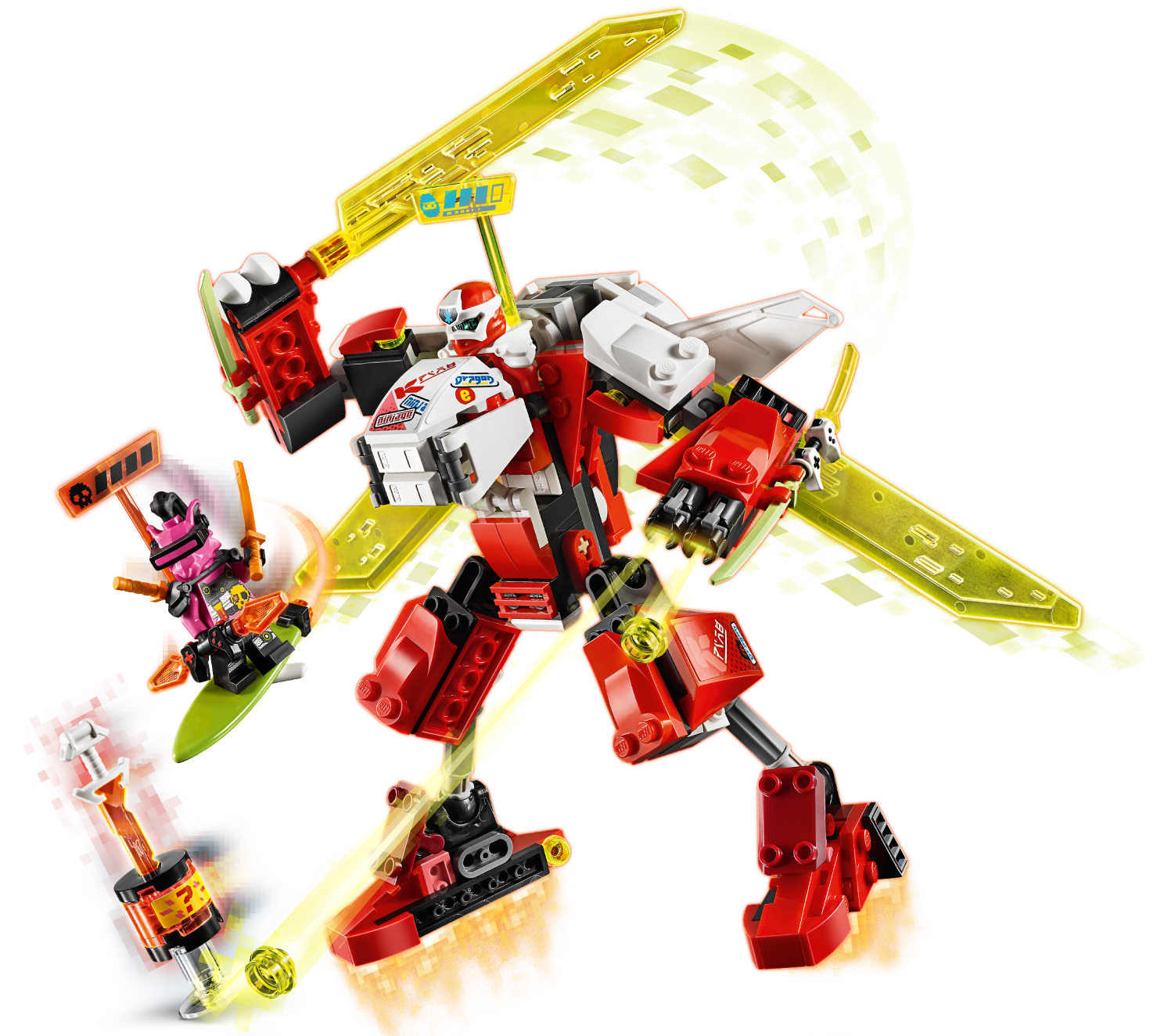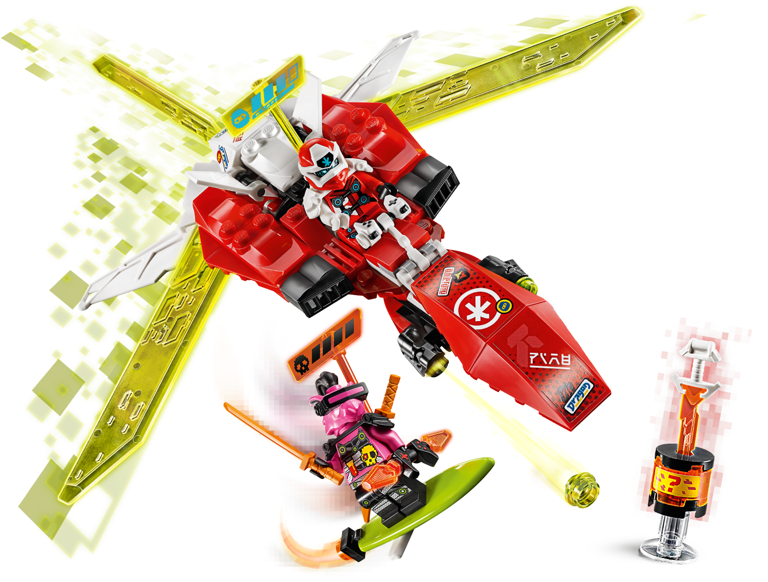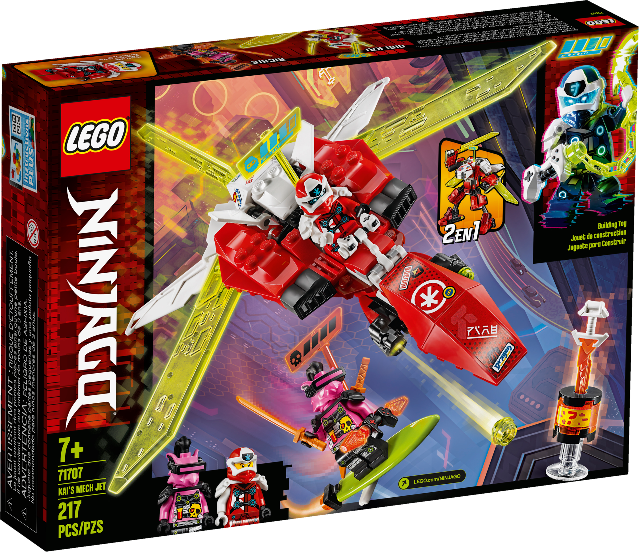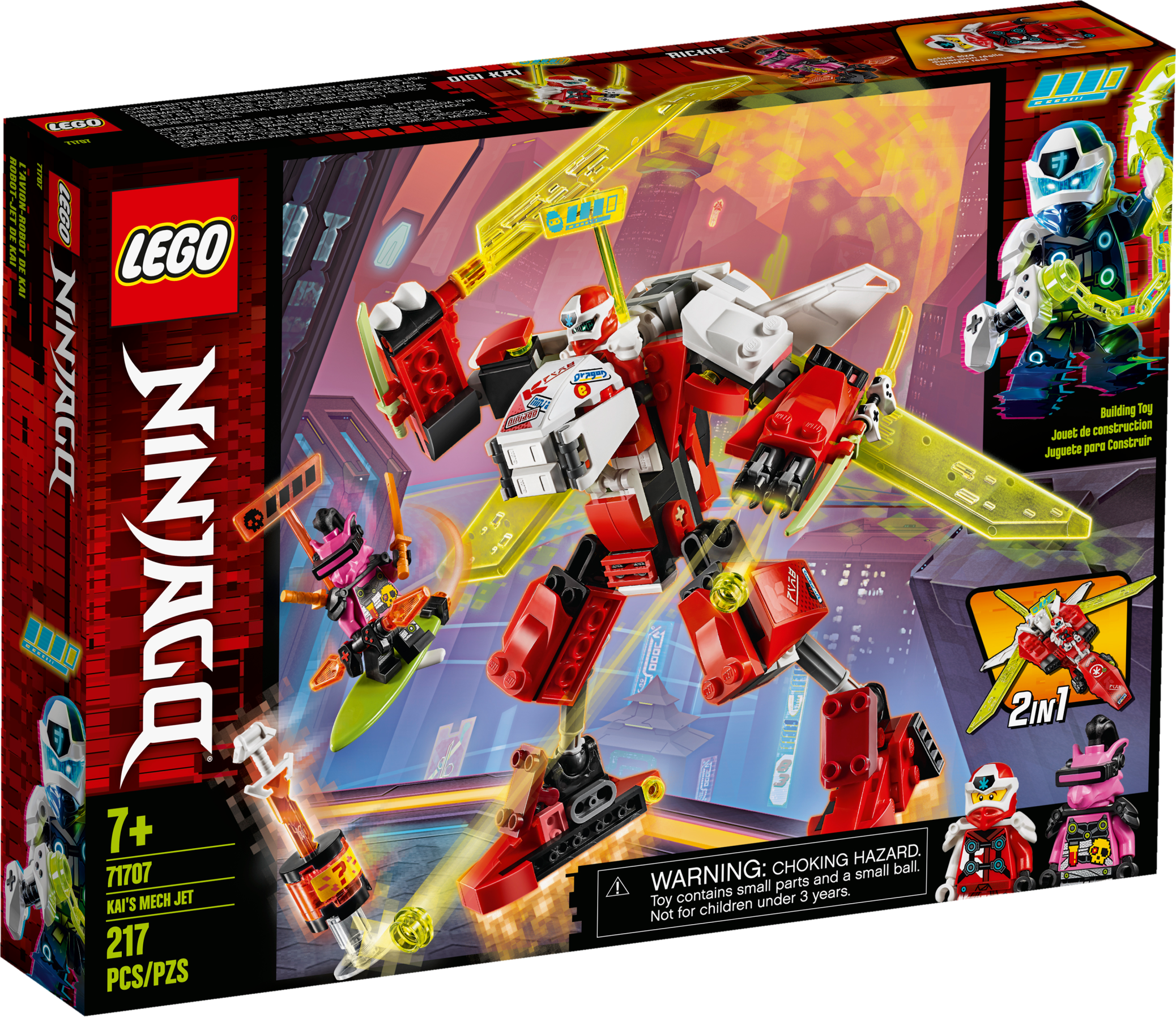 Kai’s Mech Jet (71707) is the ideal birthday gift for kids who love LEGO® NINJAGO® Mechs and Toy Planes. This is a 2-in-1 toy playset, which increases building and play possibilities. Kids can choose for it to be a toy jet plane or a mech toy for exciting adventures in Prime Empire with NINJAGO Kai.The fun new way to build LEGO giftsInstructions PLUS offers an interactive guide to build this toy jet and mech toy and makes it even more fun. Available in the free LEGO Life app; it has zoom and rotate viewing tools to help youngsters build independently. The perfect guide to create this toy playset.The best building kits for kidsLEGO NINJAGO buildable toys let kids enter a mystical world where they can indulge in imaginative play as a team of mini ninjas take on the forces of evil. Kids will be completely enthralled as they role-play with toy jets, NINJAGO Mechs, speeders, dragons and temples.Brilliant LEGO® NINJAGO® building kit for kids featuring Kai’s Mech Jet. This toy playset will be adored by kids who love buildable toys and creating exciting stories with NINJAGO figures and mech toys.This building set includes a NINJAGO® Mech that rebuilds into a toy plane, 2 minifigures: NINJAGO® Kai and Richie, and a Key-Tana. Together they will fuel kids' creativity as they re-enact scenes from Prime Empire.New for January 2020, this toy jet plane creates a world of possibilitiesas it can also be rebuilt into a powerful mech toy with posable arms and legs and shoot studs.This 217-piece action toy is a rewarding build for boys and girls aged 7+ and makes a great holiday gift. The awesome building set will inspire kids to embrace imaginative play as they bring to life their favorite ninjas.LEGO® NINJAGO® Mech action toys are the perfect size to play with at home or take with you for fun on the go. The mech measures over 6” (16 cm) high and 9” (25 cm) wide.No batteries are required for this construction toy – it’s simply fueled by kids’ vivid imaginations, so you never need to leave the NINJAGO® realm.The perfect ninja playset to give to a young LEGO® builder. The bricks and buildable figures come with paper instructions, as well as the amazing digital and interactive Instructions Plus guide on the free LEGO Life app.LEGO® NINJAGO® collectible buildable toys let kids enter a thrilling world of fantasy action and create stories with their favorite ninjas as they take on the forces of evil.LEGO® bricks have met the highest industry standards for more than 60 years, ensuring they are always consistent, compatible and easily pull apart every time. LEGO always delivers quality here on Earth or in the action-packed NINJAGO® realm.These LEGO® bricks and pieces have been relentlessly tested and meet the highest global safety and quality standards. With LEGO playsets, you always have your peace of mind.