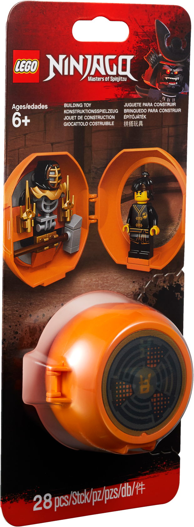 Features a portable plastic pod in orange with a Cole minifigure inside, plus a rack with assorted Kendo training weapons and accessory elements including: Kendo mask with brown rim, hammer, 2 gold-colored sai, shoulder armor, plus LEGO® elements to store the weapons and accessories in cool ninja style. • Measures over 2” (6cm) high, 2” (6cm) wide and 1” (3cm) deep.