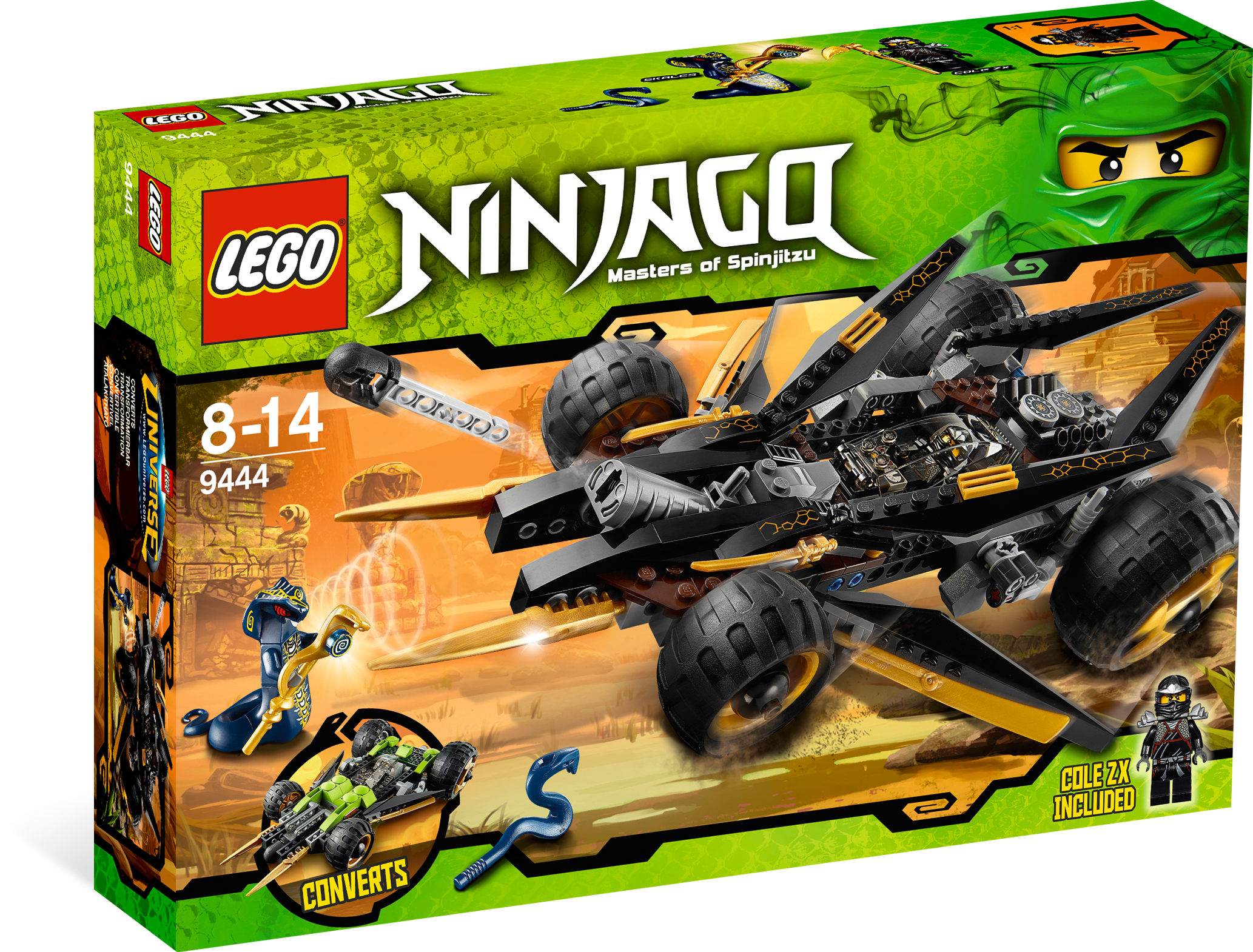 Capture the Hypnobrai snake staff and zoom away in the Tread Assault vehicle! The general of the Hypnobrai snake tribe, Skales, is using mind control to stop Cole from taking the golden Hypnobrai staff with its powerful anti-venom. Counterattack his hypnotic powers with Cole’s Tread Assault vehicle! Launch the rock shooter and ninja blades! Flip the Tread Assault vehicle over for a surprise attack! Stop Skales and his mind-controlling minions by grabbing that staff! Includes Cole ZX and Skales minifigures, Tread Assault vehicle, golden Hypnobrai staff, golden scythe and mini-snake.Includes 2 minifigures: Cole ZX and SkalesFeatures rock shooter, ninja blades, 2 ninja spinner crowns in rear wheels, flip function and opening cockpitAccessories include golden Hypnobrai staff, 2 golden ninja swords and mini-snakeFlip it over for surprise attacks!Blast out of any battle with the rock shooter!Shoot the ninja blades!Cole’s Tread Assault vehicle measures over 11” (28cm) long and 6” (16cm) wide