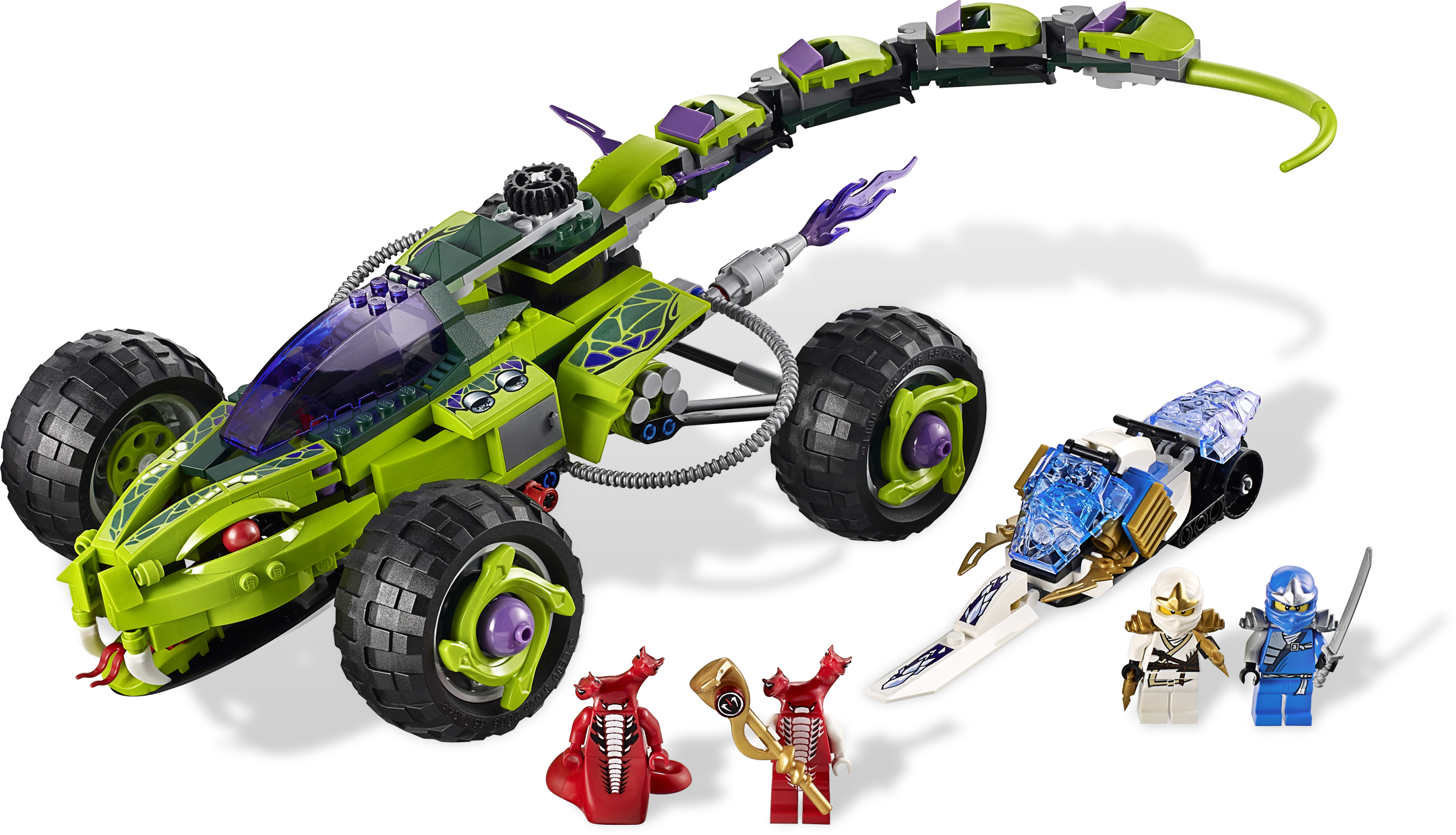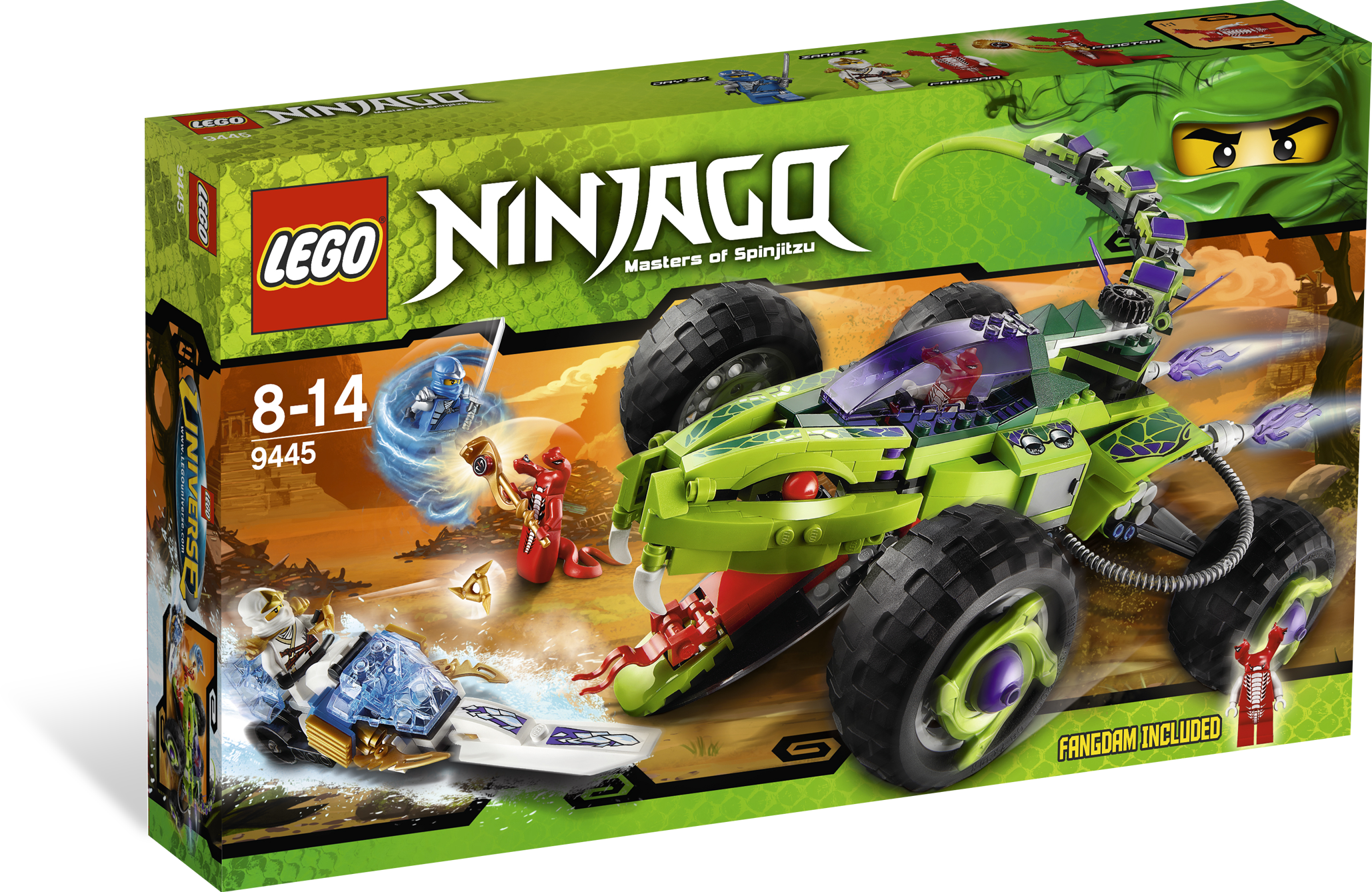 Speed away from super-charged snake strikes in a Fangpyre Truck Ambush! Zane and Jay are making a getaway with the golden Fangpyre staff until the general of the Fangpyre snake tribe, Fangtom, sends his accomplice warrior Fangdam on an ambush attack. Help Zane and Jay to outrun Fangdam in the Fangpyre Truck with Zane’s snowmobile! Activate the snowmobile’s ice sprayer to skid out of trouble on any terrain! Dodge the snake truck’s whipping tail strike and venomous front-end fangs while you escape with the staff and anti-venom! Includes Zane ZX, Jay ZX, Fangtom and Fangdam minifigures, Fangpyre Truck, Zane’s snowmobile, golden Fangpyre staff and 4 weapons.Includes 4 minifigures: Zane ZX, Jay ZX, Fangtom and FangdamFeatures tail strike and biting front-end fang functions, all-wheel suspension, opening cockpit, 4 snake spinner crowns in wheels and golden Fangpyre staff with anti-venomVehicles include Zane’s elemental snowmobile and Fangpyre TruckWeapons include 2 shurikens of ice, ninja sword and golden Fangpyre staffRace to safety in a high-speed chase for control of the golden Fangpyre staff!Launch a whipping tail strike!Chomp down on the competition with biting front-end fangs!Measures over 17” (45cm) long and 7” (18cm) wideZane’s snowmobile measures over 6” (16cm) long