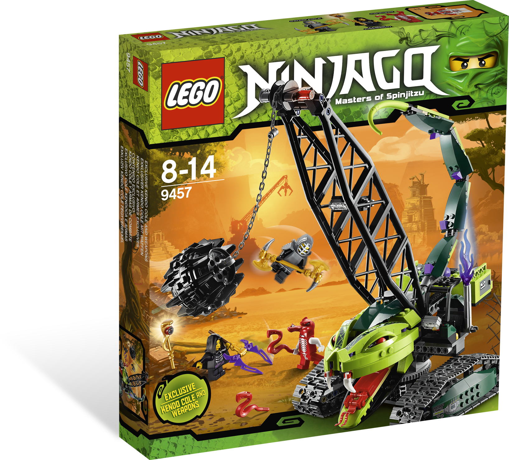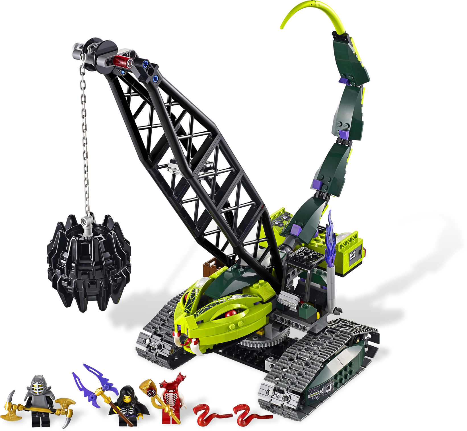 Rescue Lloyd and defeat the fearsome Fangpyre Wrecking Ball! Lloyd Garmadon will stop at nothing to retrieve the golden Fangpyre staff from its slithery servants. Unfortunately for him, Fangdam activated the snakes Fangpyre Wrecking Ball crane to teach him a lesson. Can Lloyd still swipe the staff with Cole’s help? You decide! Watch out for the swinging ball, biting snake head and venomous tail! Includes Kendo Cole, Lloyd Garmadon and Fangdam minifigures, Fangpyre Wrecking Ball crane, golden Fangpyre staff and 2 weapons.Includes 3 minifigures: Kendo Cole, Lloyd Garmadon and FangdamFeatures golden Fangpyre snake staff, free-swinging wrecking ball, functioning winch, flexible snake tail, biting snake head, working treads and opening cockpitWeapons include: golden double-bladed axe, lightning bolt axe and 2 mini-snakesSwing the Fangpyre Wrecking Ball!Raise and lower the Fangpyre Wrecking Ball with the winch!Open the cockpit for play inside!Measures over 11” (30cm) long and 7” (18cm) wide