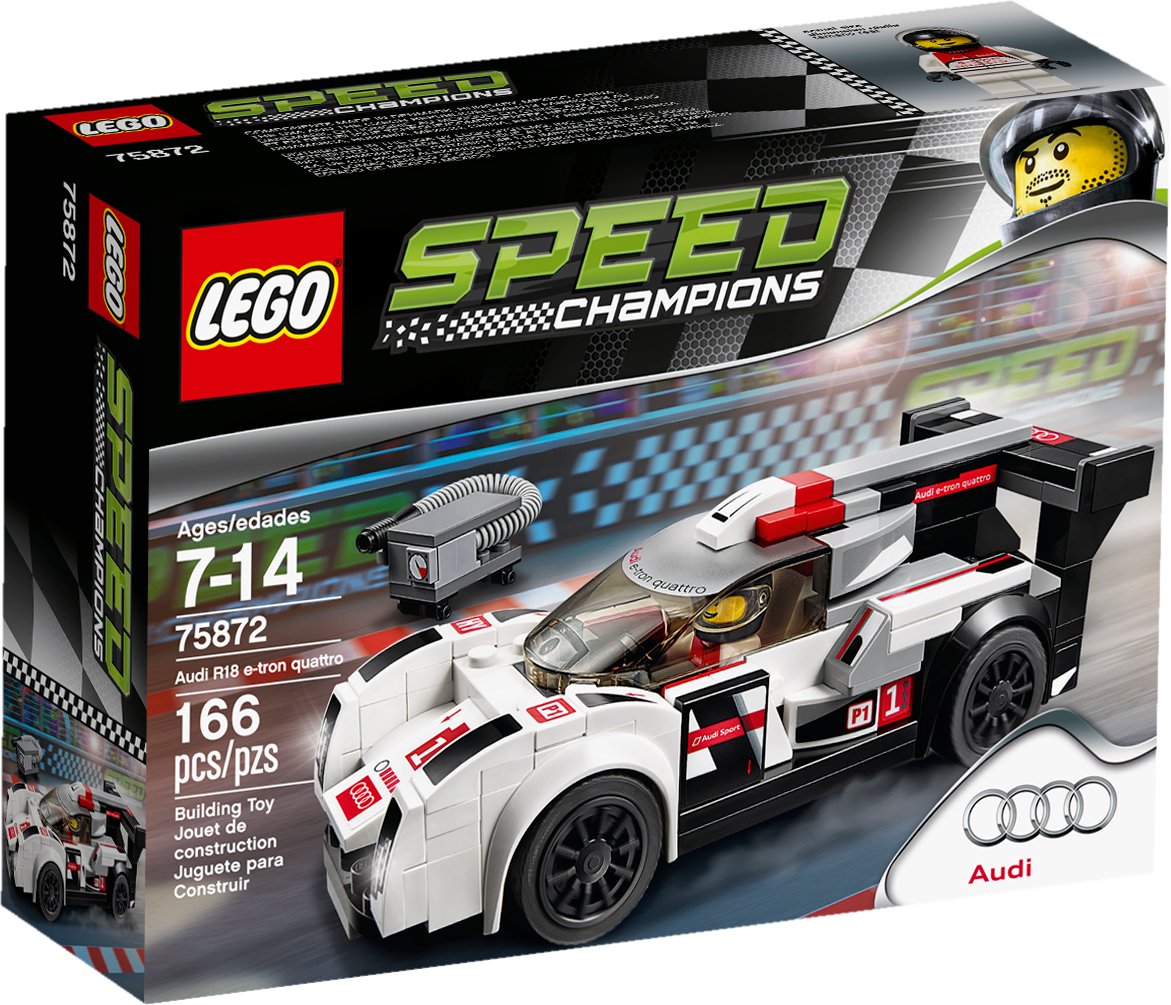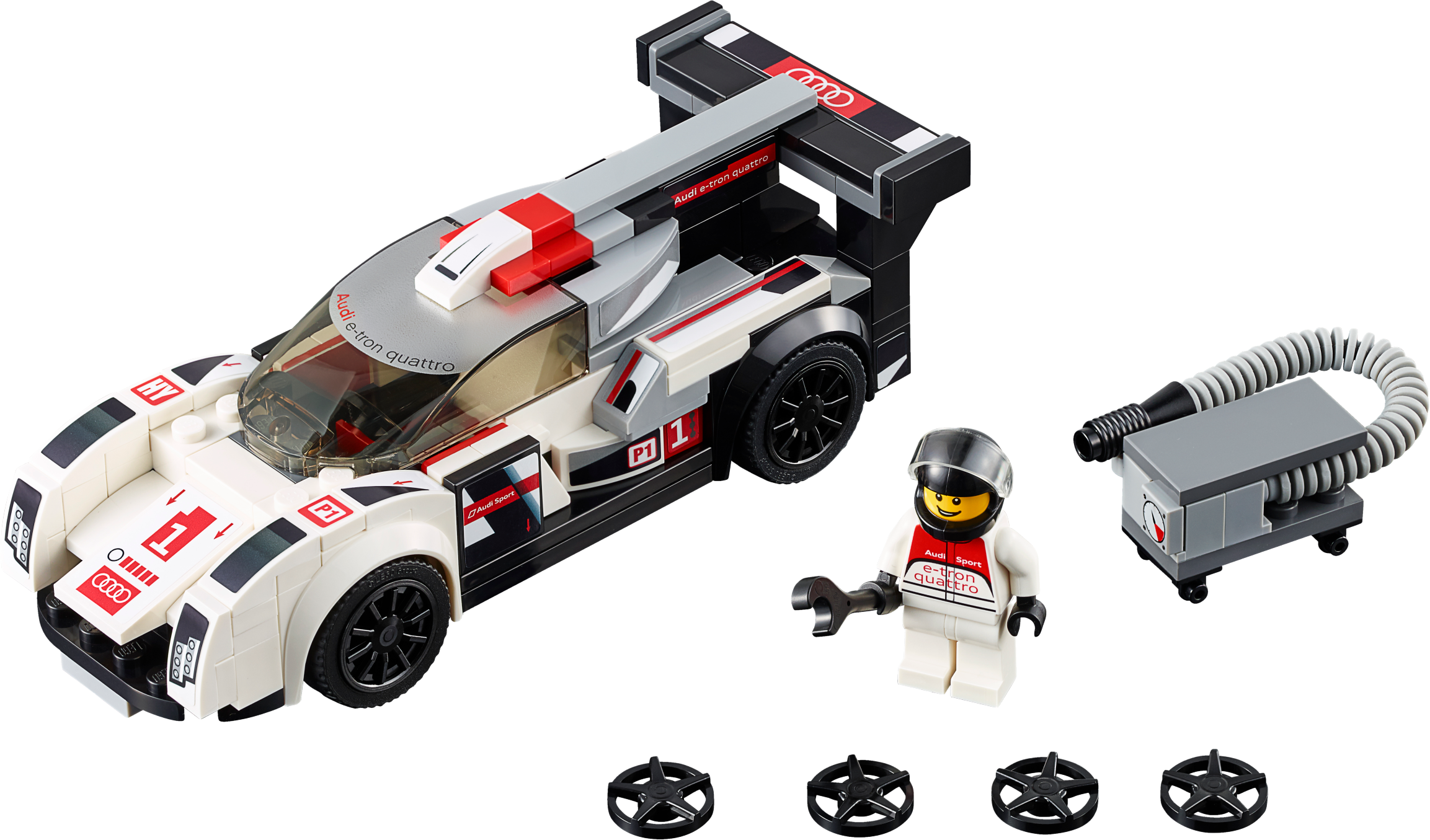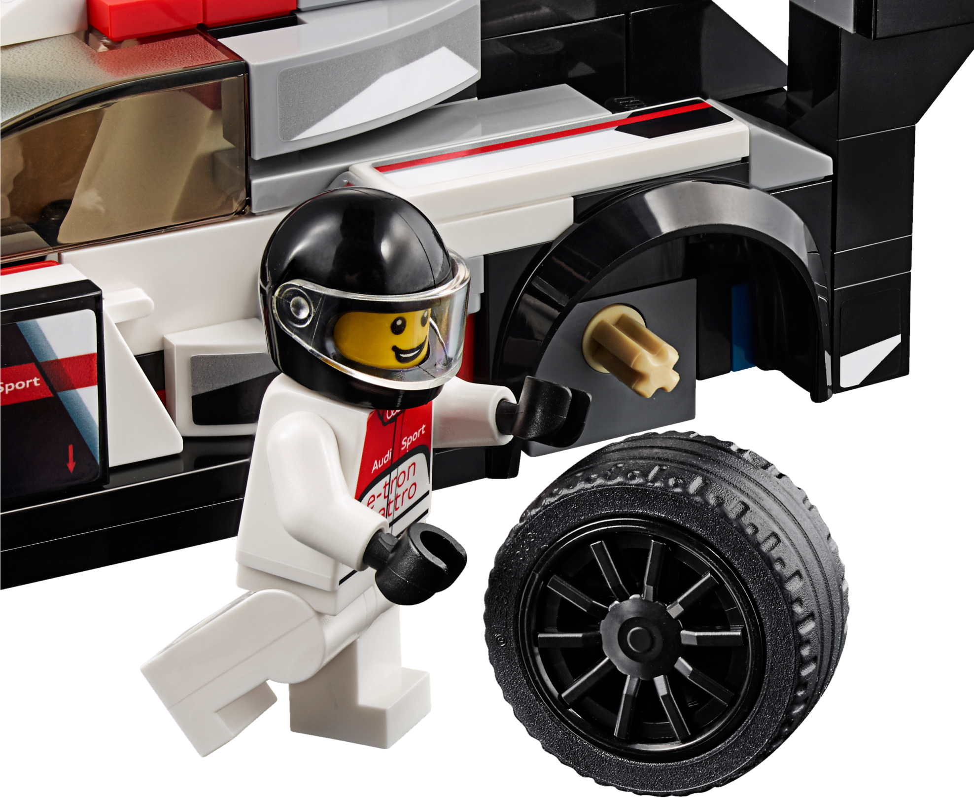 Refuel and race for victory! You'll want to drive all day and night with this super-cool LEGO® Speed Champions version of a Le Mans Prototype race car. Get the Audi R18 e-tron quattro race-ready with the wrench and fuel pump then power away from your rivals! Includes an Audi racing driver minifigure. The race-ready, buildable Audi R18 e-tron quattro can fit a minifigure inside and has a removable windshield, 2 sets of interchangeable wheel trims, plus authentic Audi logo and headlight stickers. Accessory elements include the Audi racing driver's helmet, a wrench and a fuel pump. Match up against the 75873 Audi R8 LMS ultra for a Le Mans-style race! Measures over 1” (4cm) high, 5” (14cm) long and 1” (5cm) wide.